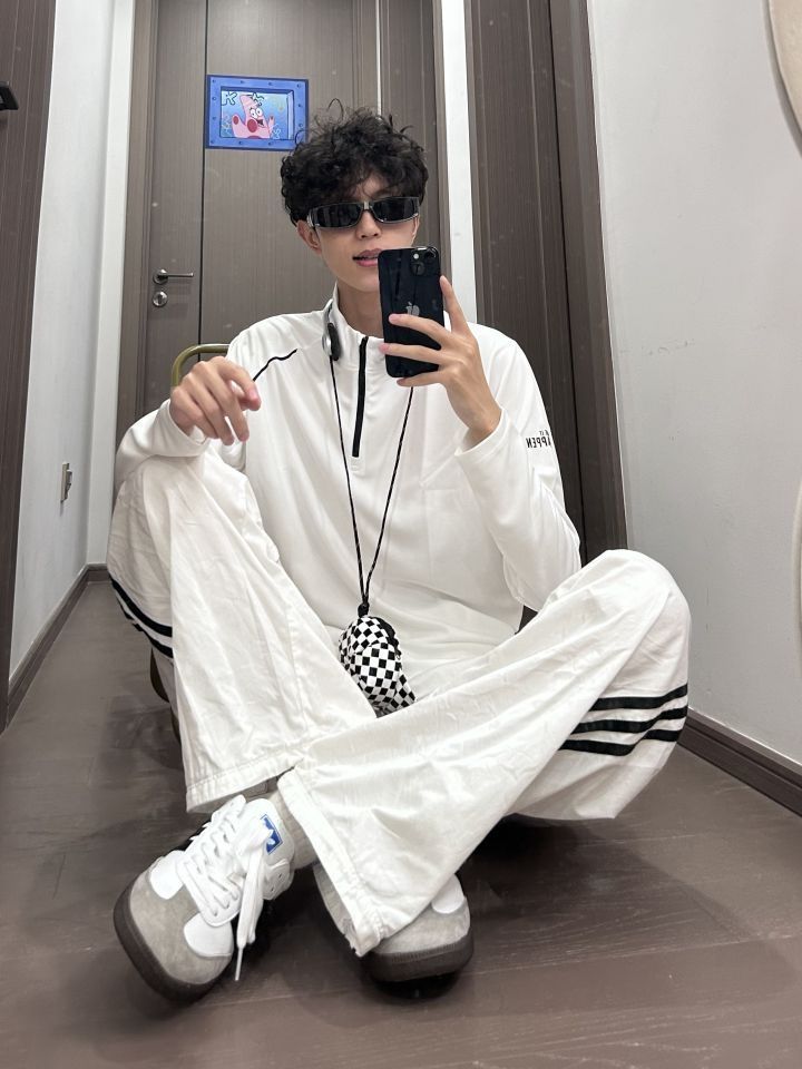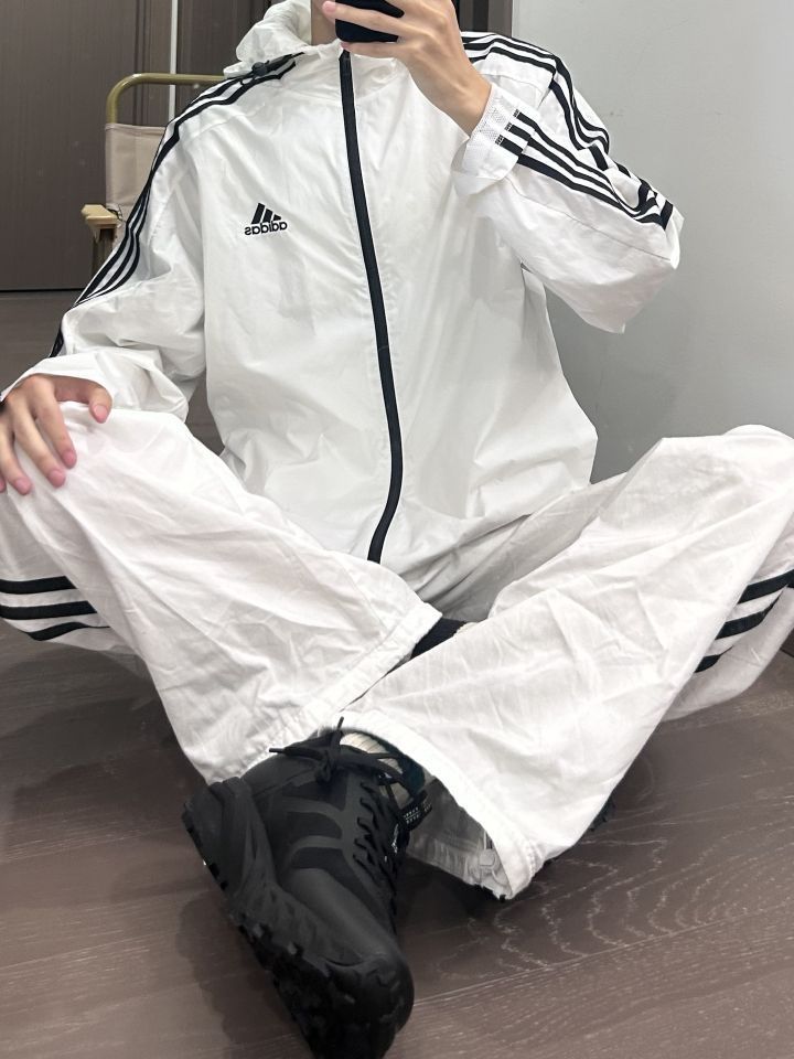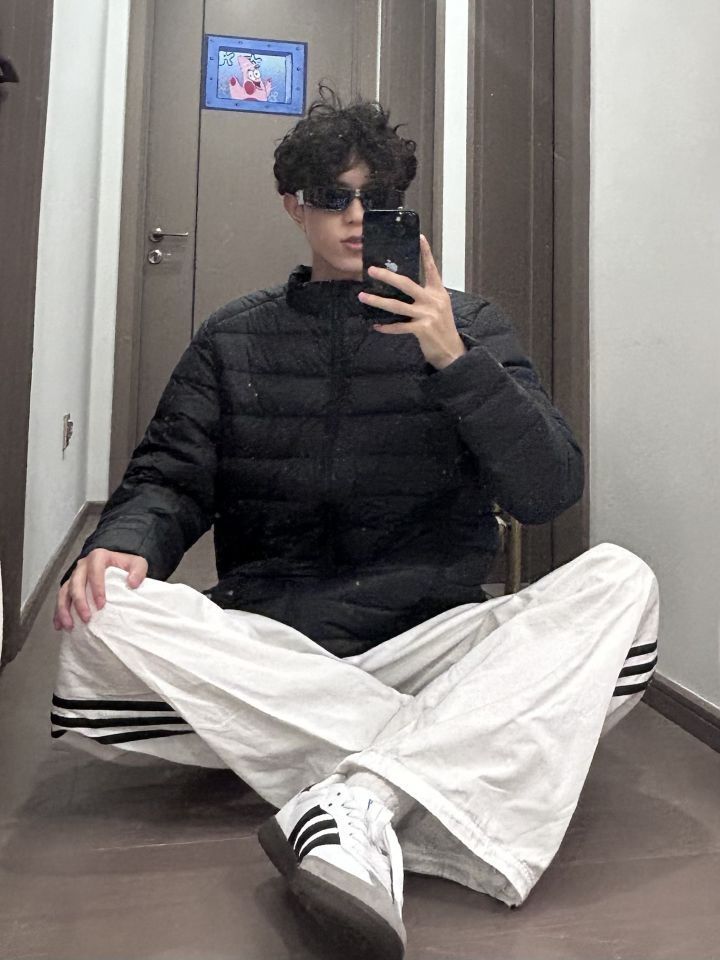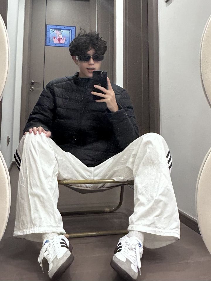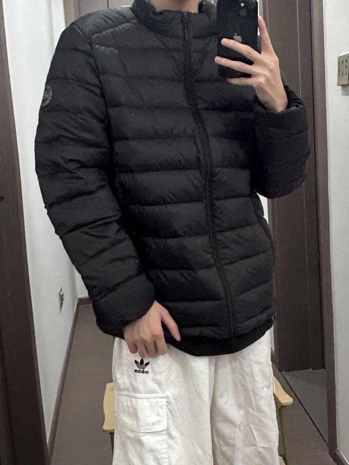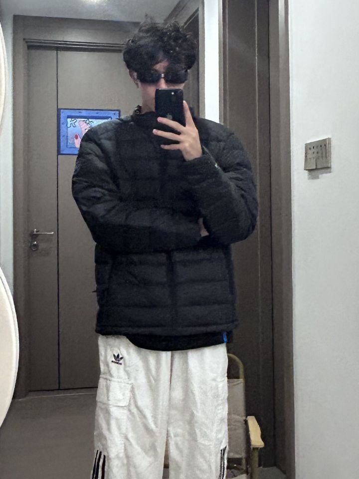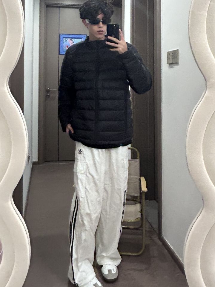 👕: PELLIOT 羽绒服 👖: adidas originals 休闲裤 👟: adidas originals 德训鞋 上身一件黑色的排骨羽绒服 下身搭配一条白色的条纹裤 再穿一双黑白色的德训鞋 夏天的羽绒服性价比就很高 黑色的羽绒服也很耐穿 可以穿很久诶