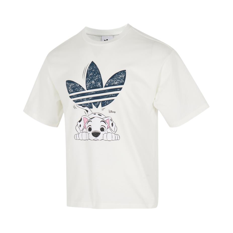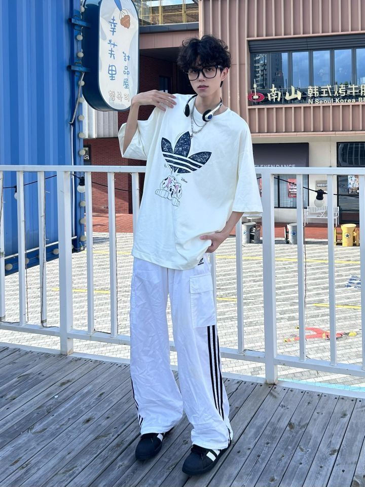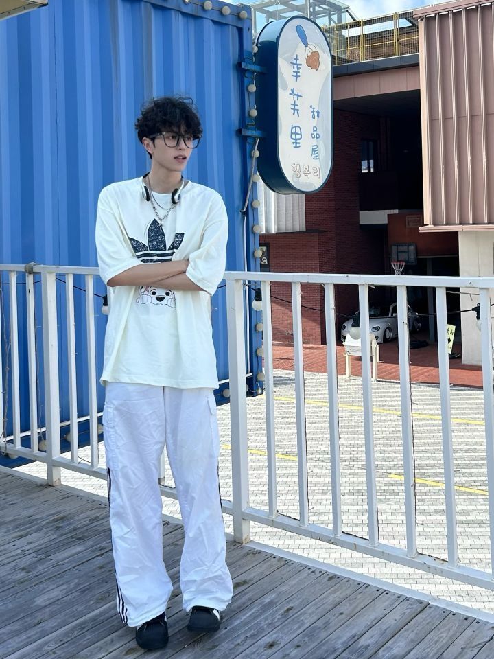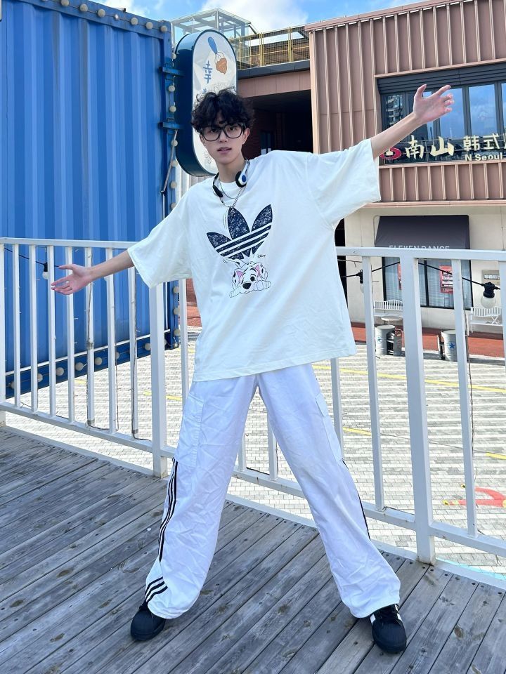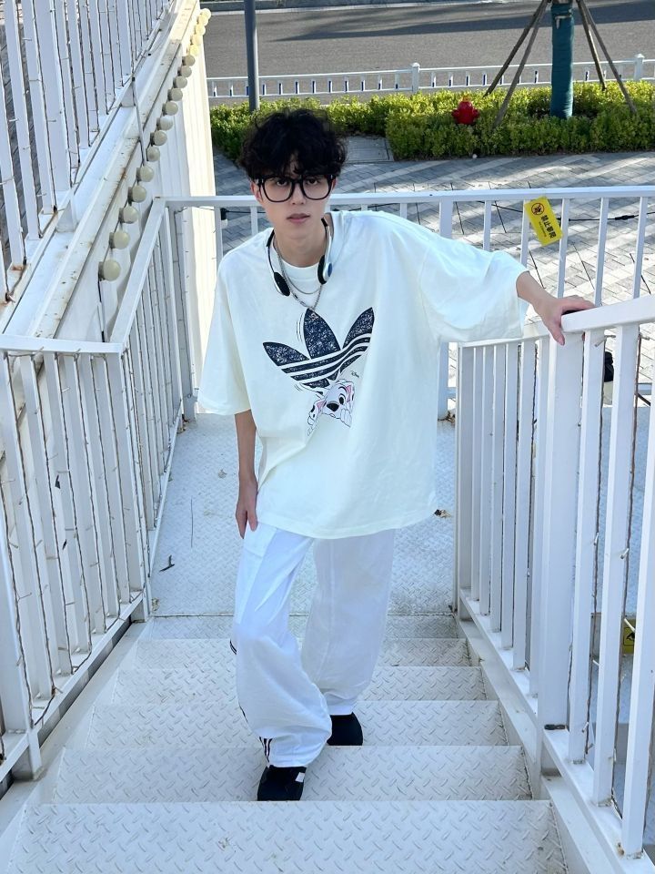 老王啊老王,不愧是行走的衣架子 虽然穿出来的效果没你那么好 但是对于普通人而言已经超nice啦 上身一件卡通小狗印花短袖 下身搭配一条白色的条纹裤 再穿一双黑色的贝壳头 阿迪跟迪士尼联名的衣服 就很可爱诶 很搭配这种年少的感觉