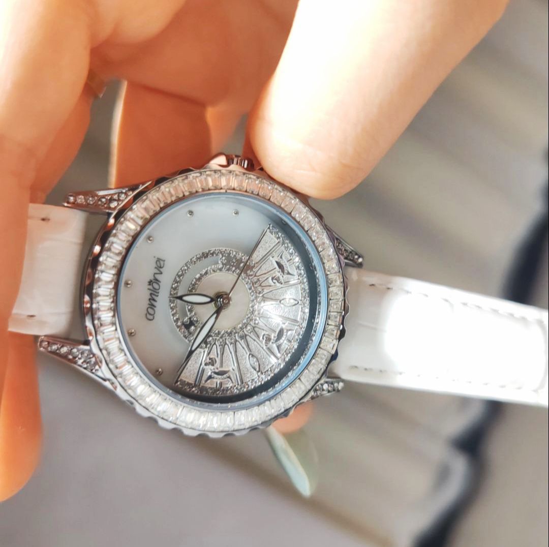 哇趣..我的表盘会转圈圈诶!!! 夏天真的好适合戴这种清爽手表啊 自康洛薇COMLORVEIblingbling的表盘还 会转圈圈诶 我觉得白色皮表带挺百搭的啊戴在手上没事 的时候就想甩甩