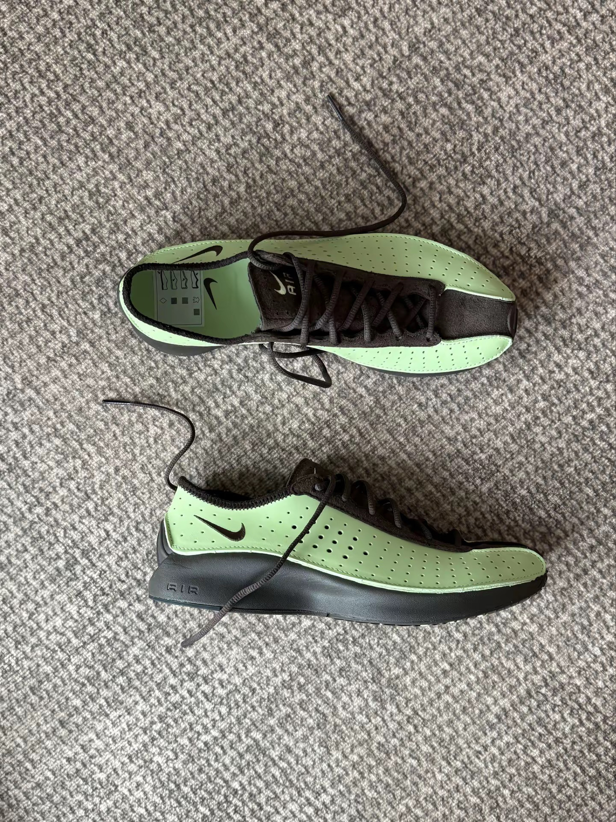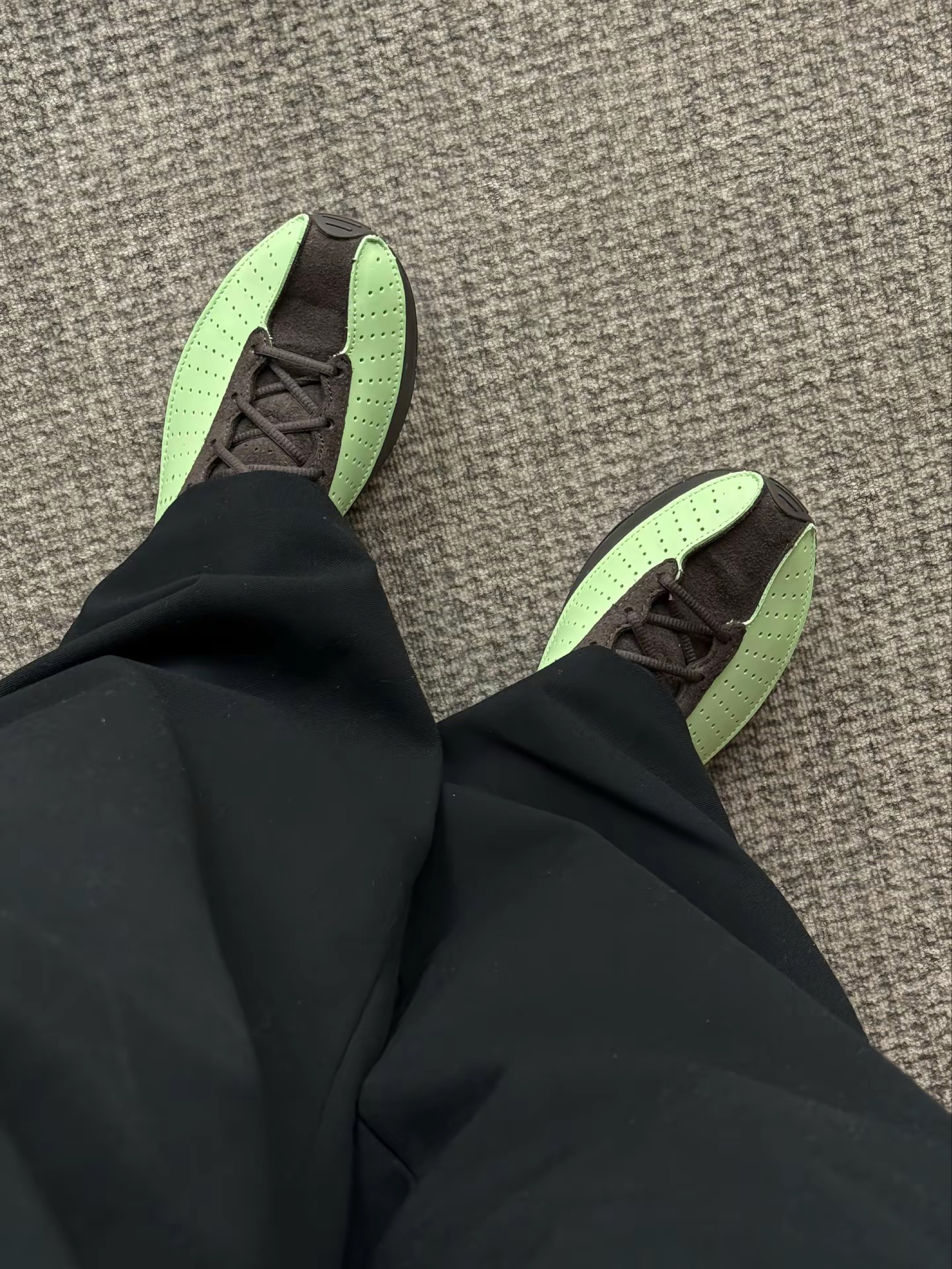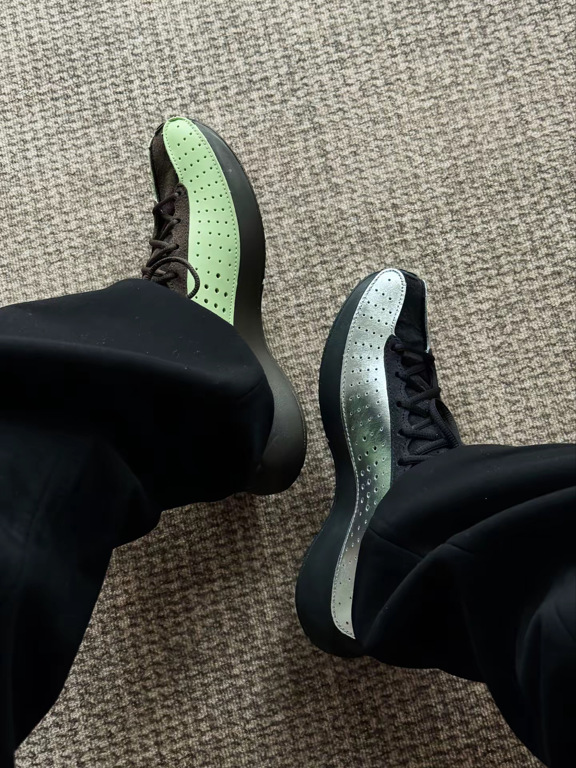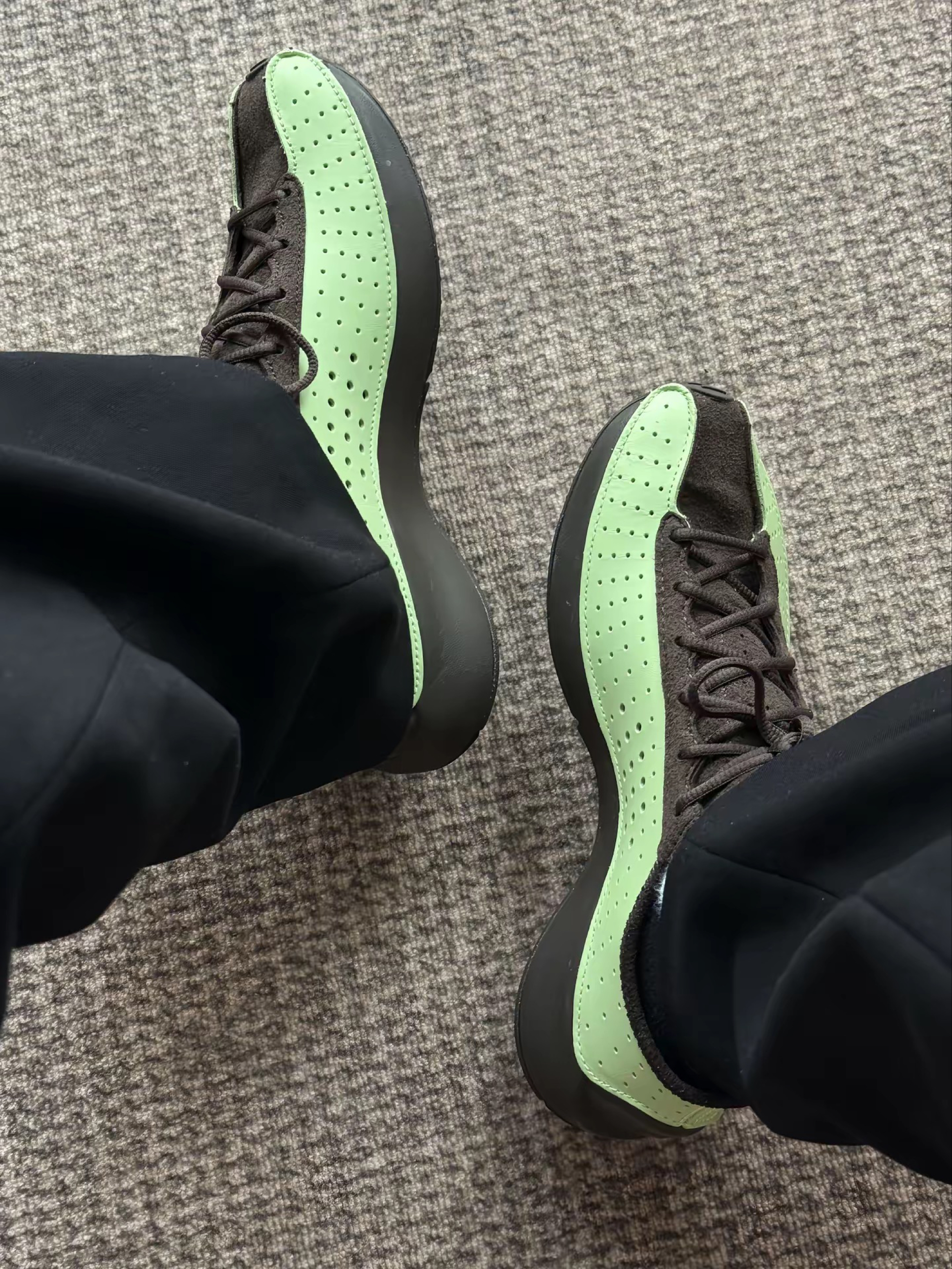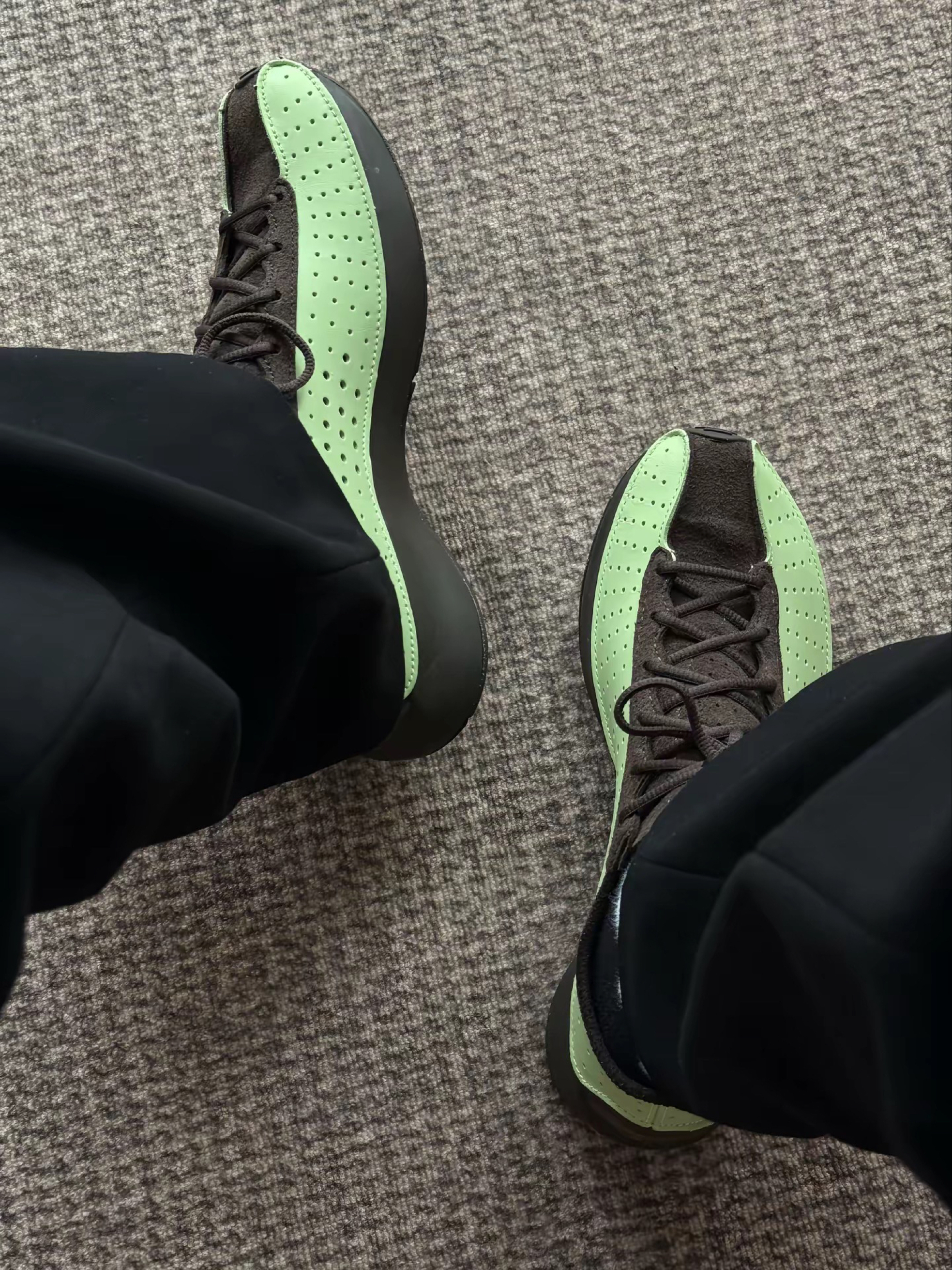 四月份发银色那双的时候,就跟大家说了后面会入手这双绿色给大家分享一下,毕竟最早就是因为绿色才关注到的这个鞋型。 绿色这双搭配了一个棕色的绒面,又是一个牛油果巧克力配色。薄薄的鞋身,上面还有一堆孔,可以说是格外透气。这个颜色也很好搭配,穿阔腿裤盖住鞋面真的很有vibe了。 上次银色是买了大半码,感觉不太舒服。绿色我直接选择了大两码,挺合适的,扁平足由于足弓支撑引起的不适感也消除了。大家觉得银色和...