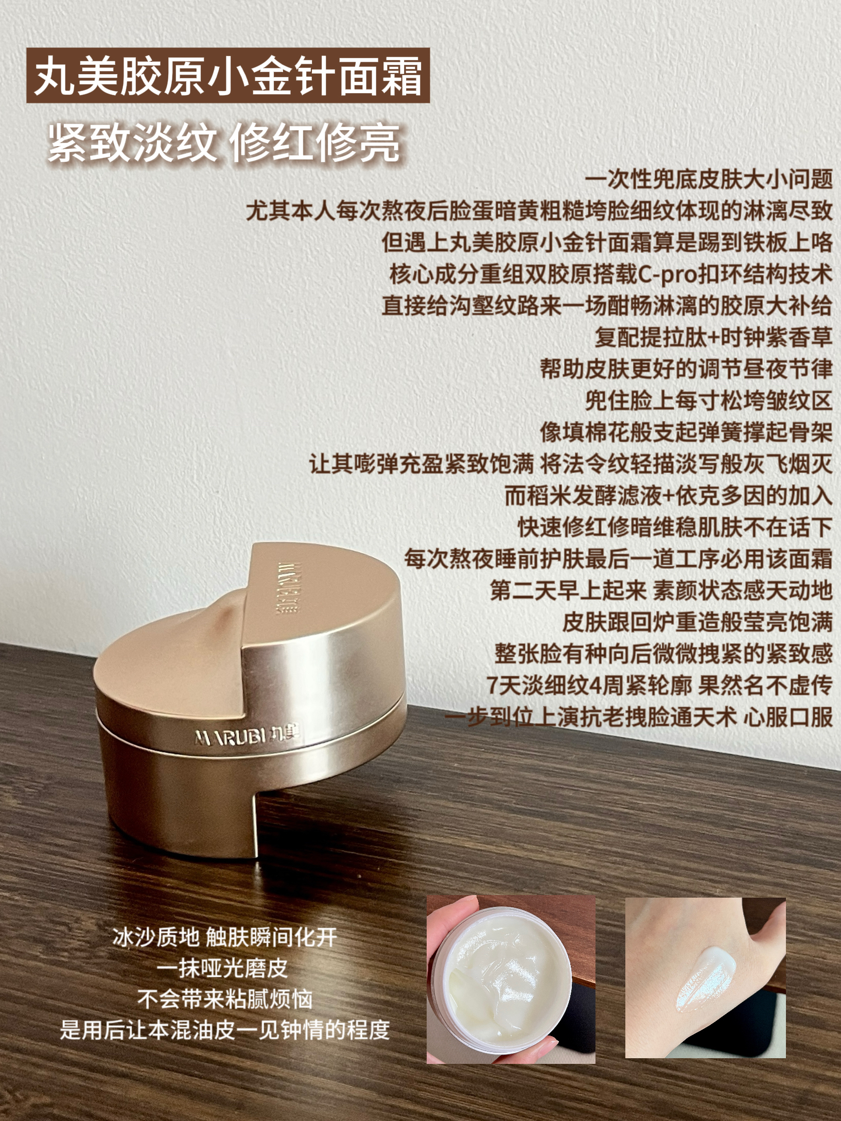 从小在电视广告上的:弹弹弹弹奏鱼尾纹 洗脑本人 到现在将要跨上30岁年龄步伐家里必屯小金针面霜 丸美这一路走来用实力演绎什么叫真正的有效抗老 第一次接触面霜还是在快过年朋友作为新春贺礼送了我一瓶 那段时间的熬夜搓麻将清晨走亲戚拜年 让我皮肤又垮又黄 显老好几岁 想着是朋友送的不用白不用 接连用了两三天左右 皮肤回春速度让我感激涕零 直接搞自信恨不得日日通宵 相比没用前皮肤粗糙细摸干纹叠生 用后原相...