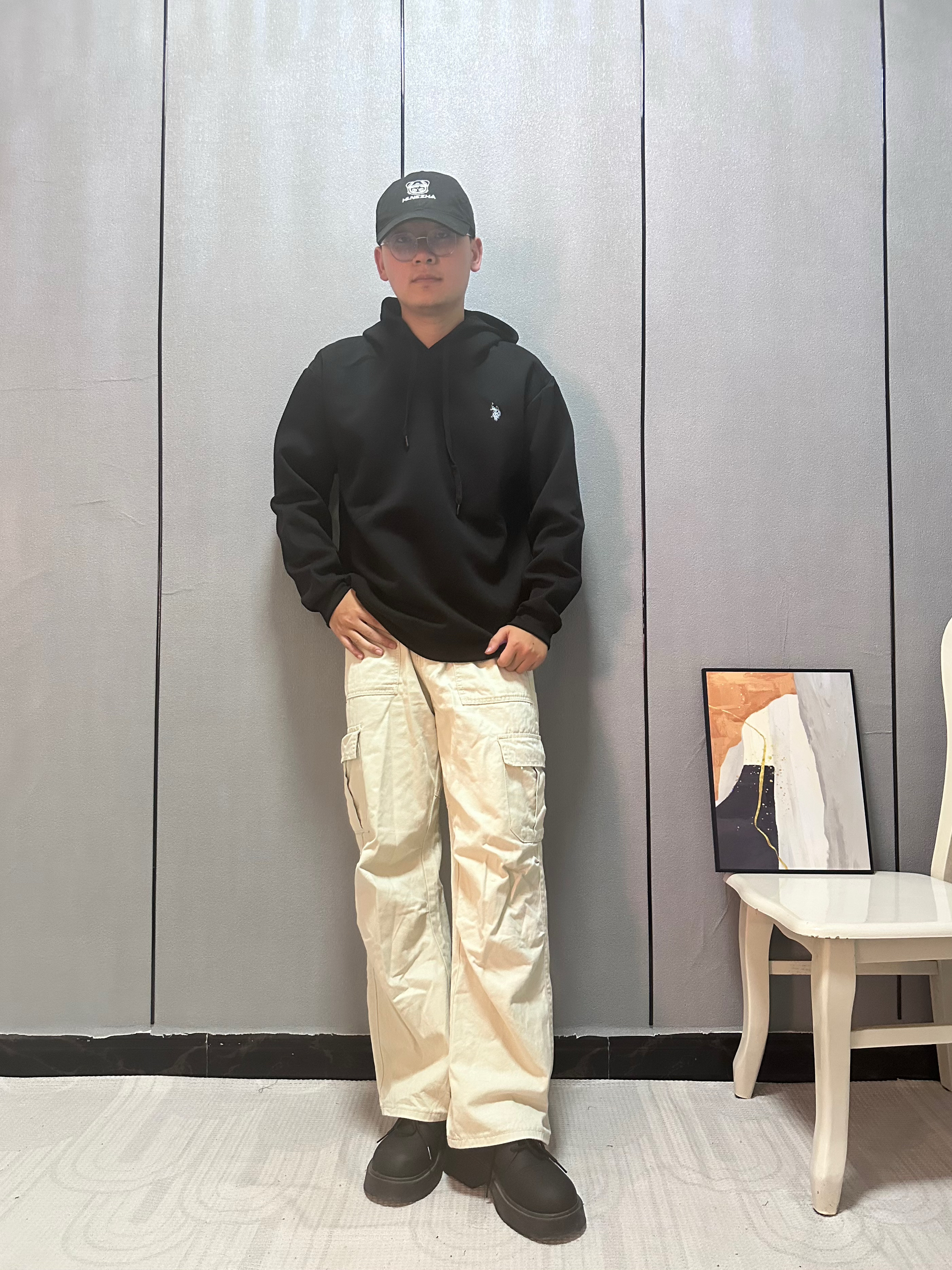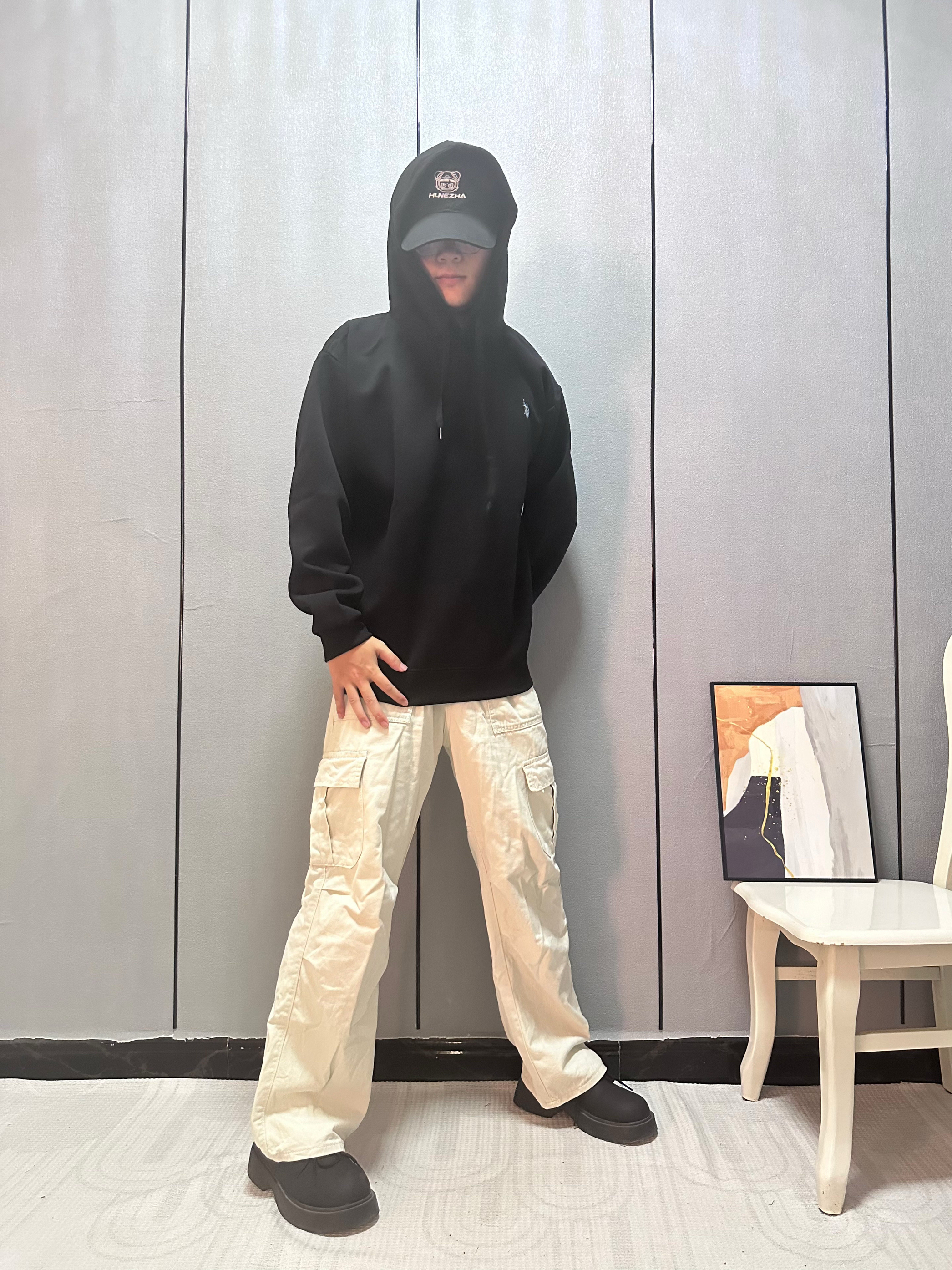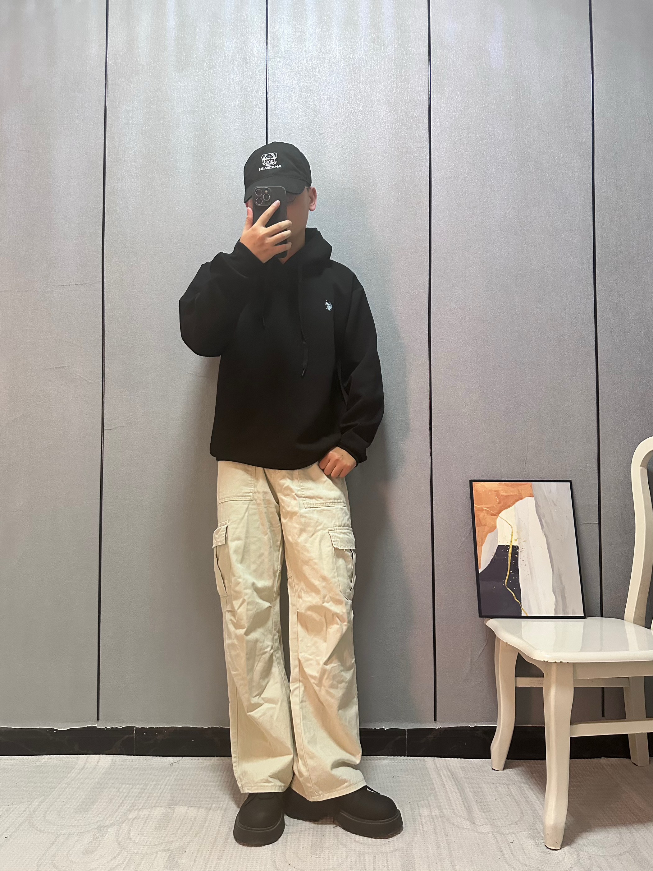 周末就爱这么穿! 👦🏻 上身是软糯亲肤的黑色连帽卫衣 👇 下身搭配一条卡其色工装裤 宽松的裤腿和大地色系 💨 黑与卡的配色经典又干净 穿起来零束缚,不用费力思考就有型 自在得不想脱下来✨