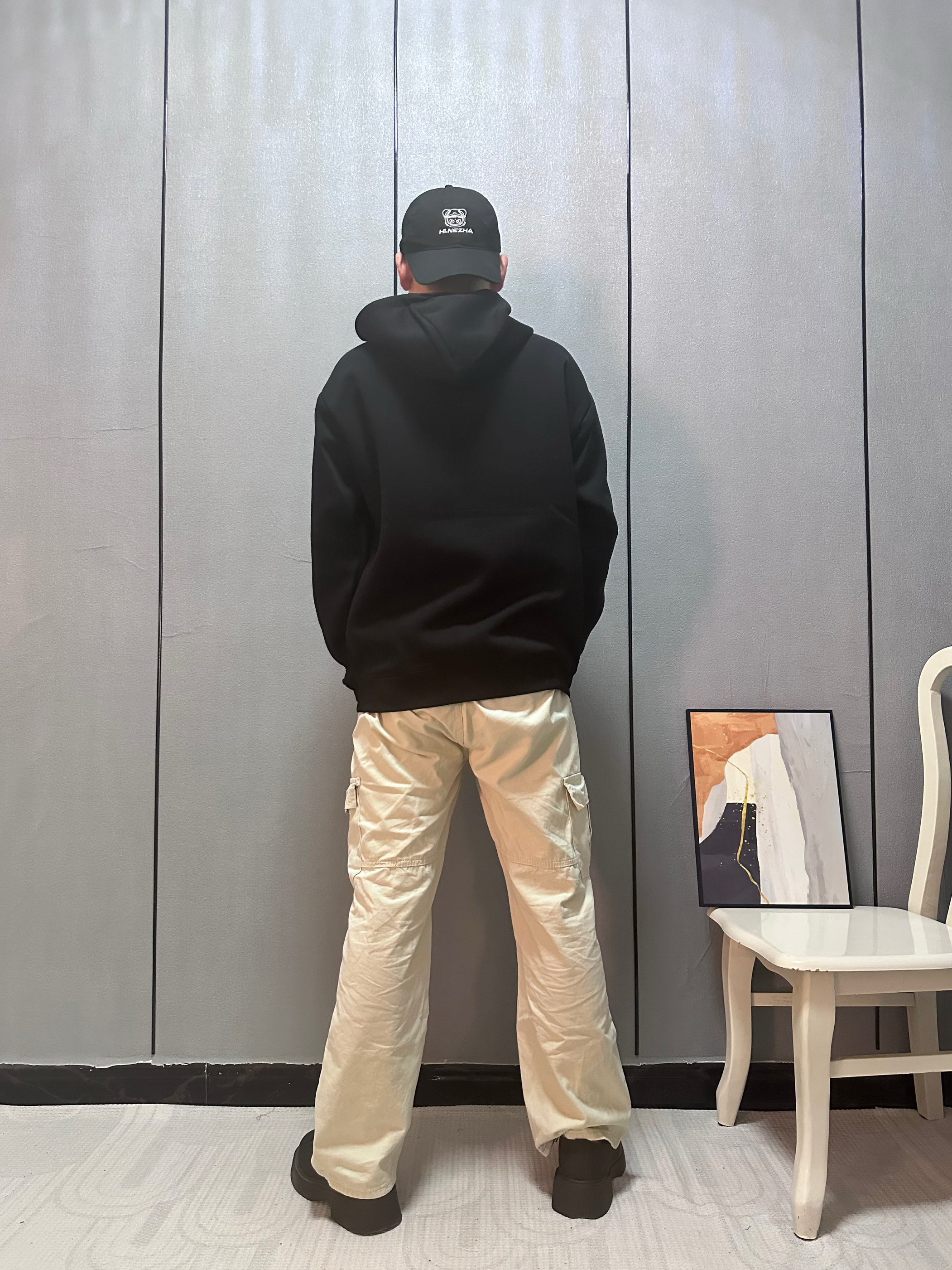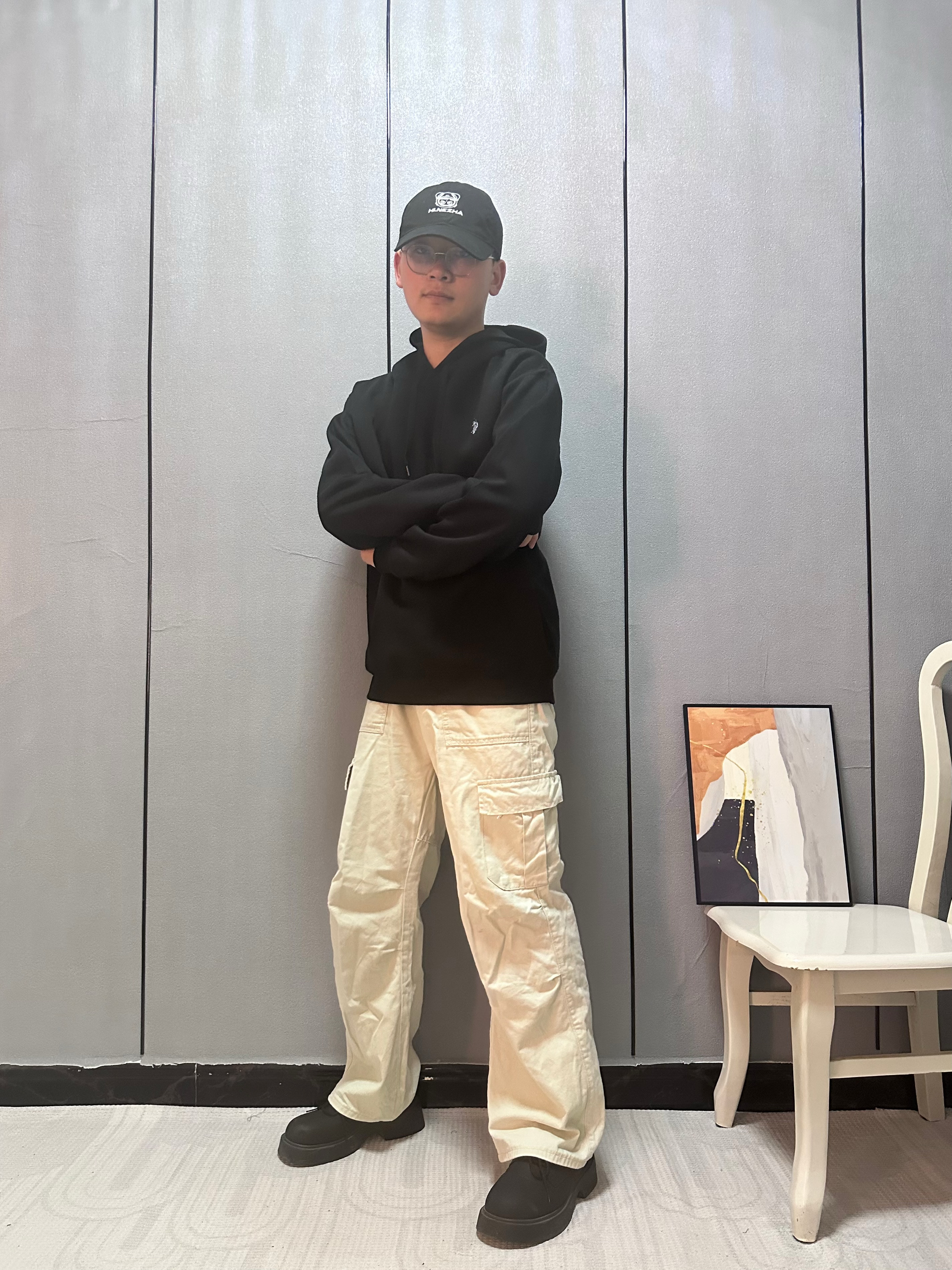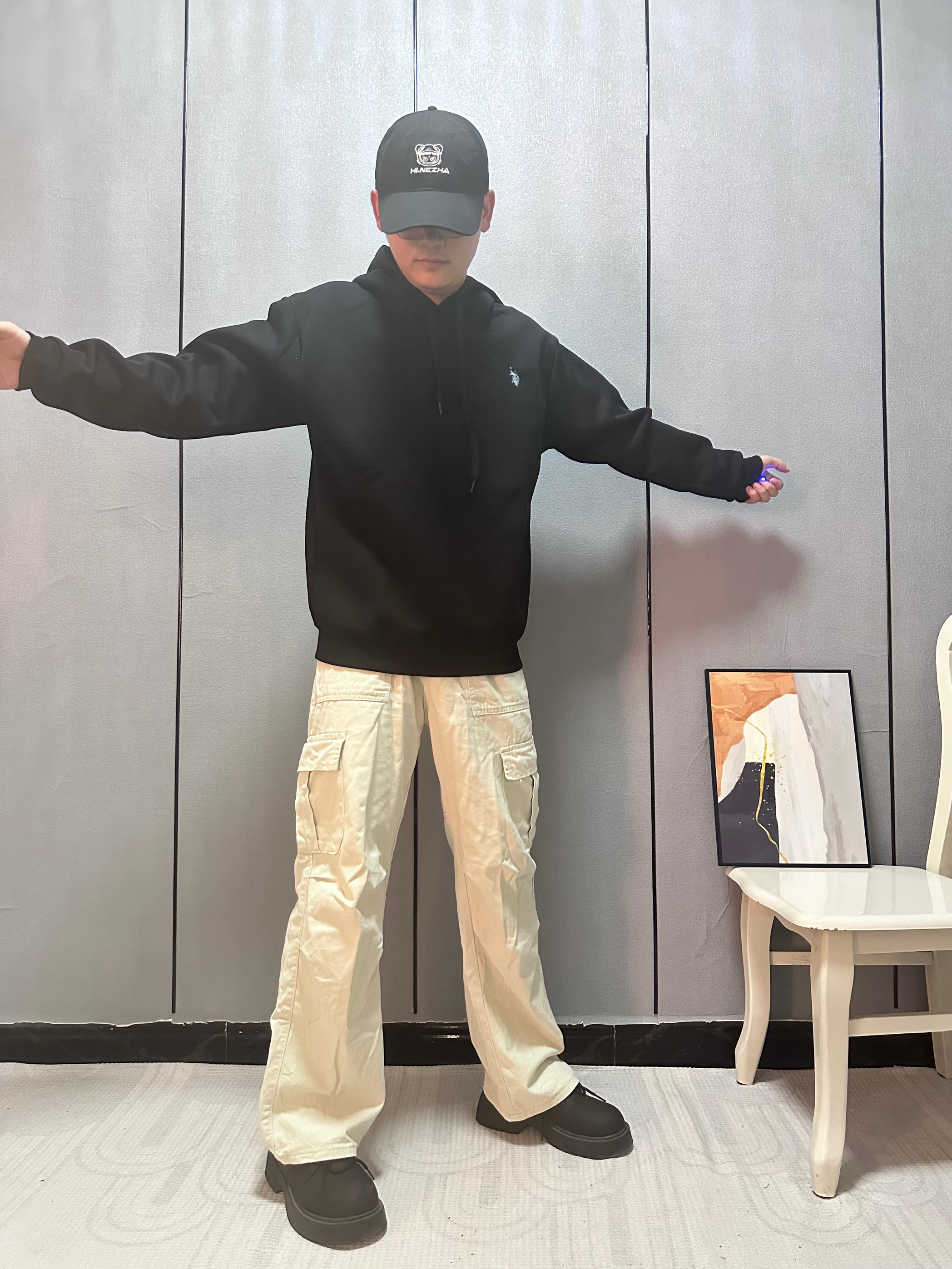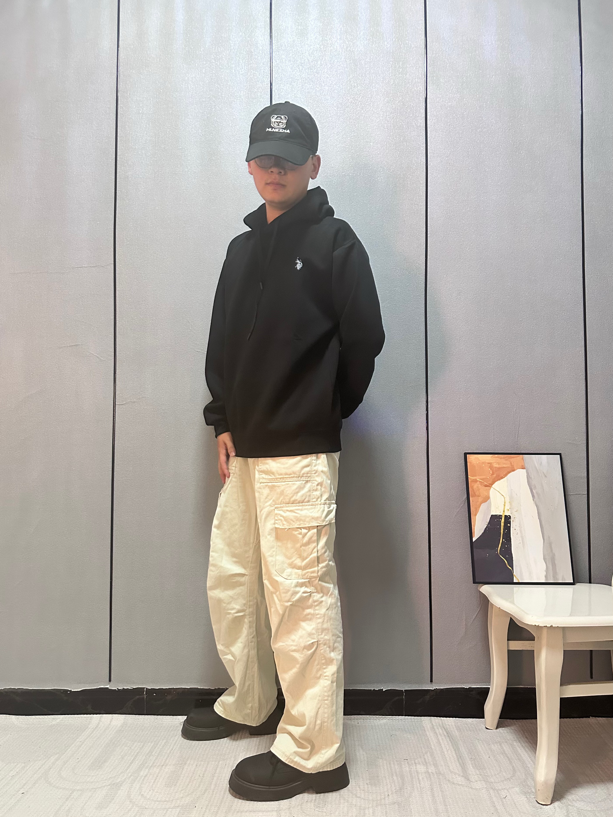 周末就爱这么穿! 👦🏻 上身是软糯亲肤的黑色连帽卫衣 👇 下身搭配一条卡其色工装裤 宽松的裤腿和大地色系 💨 黑与卡的配色经典又干净 穿起来零束缚,不用费力思考就有型 自在得不想脱下来✨