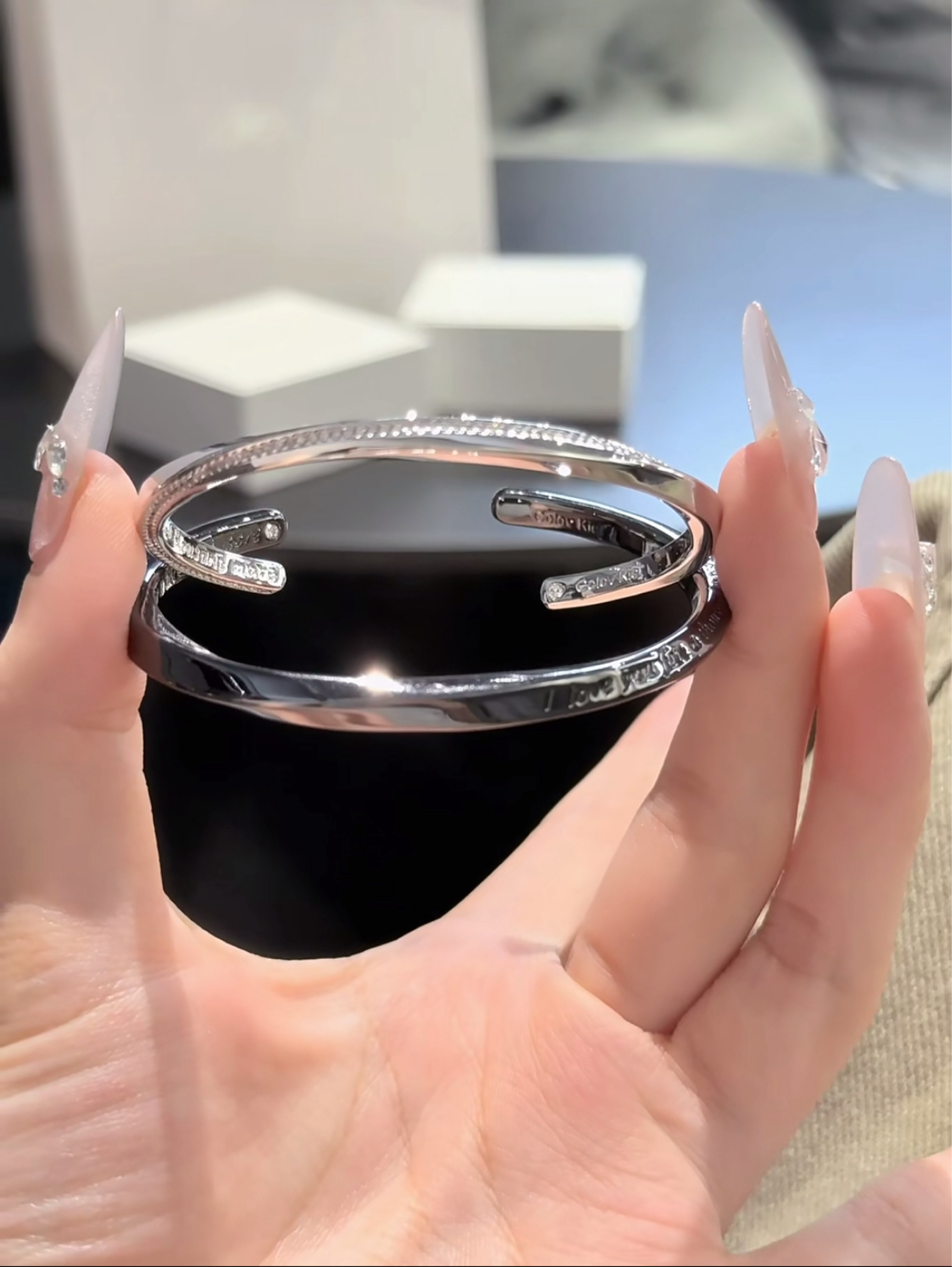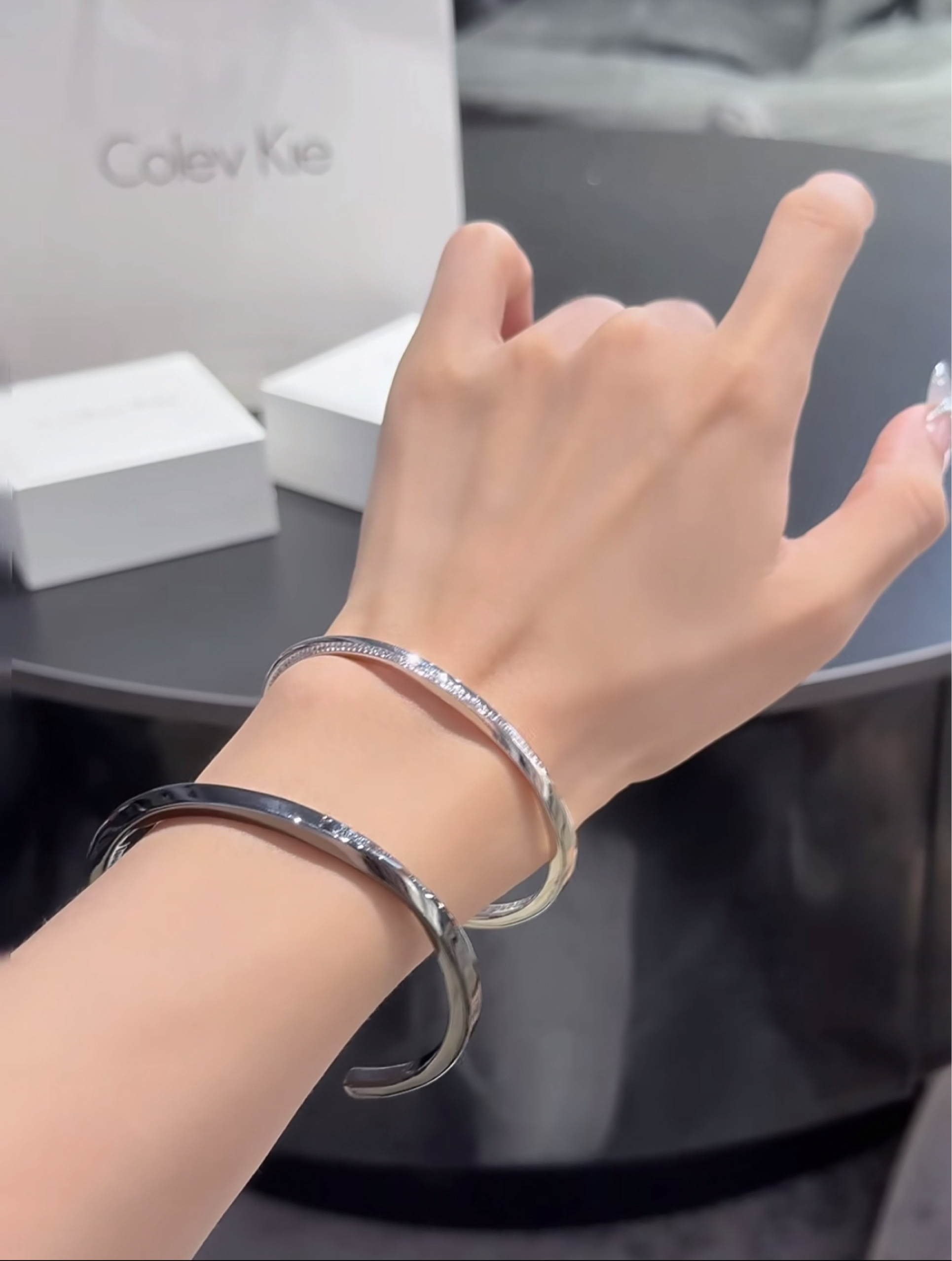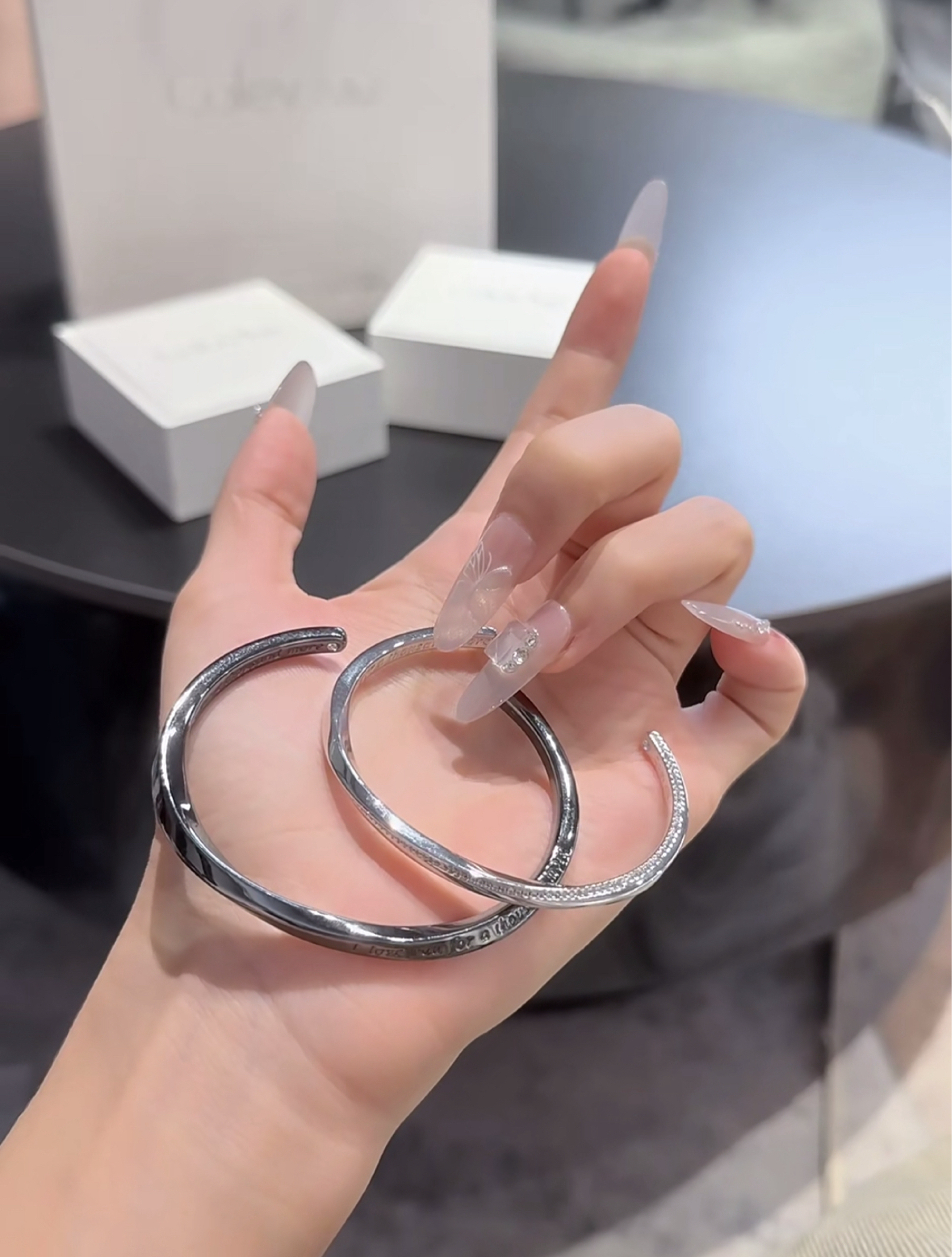今天戴这对手镯是小CK家的镯子 在镯子上镶着细细的钻石和刻印着字 女款的是银闪闪的感觉 男款的就是亮黑色的款 还是蛮适合日常来佩戴的 平时配个吊带和T恤都是挺百搭 要是送给小姐妹或者当七夕礼物的话 都是很合适的