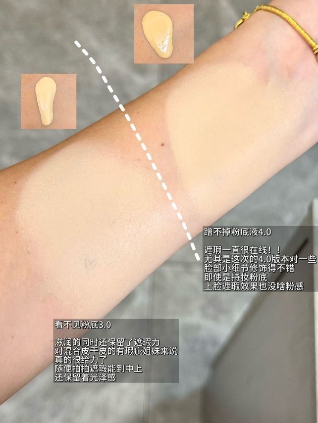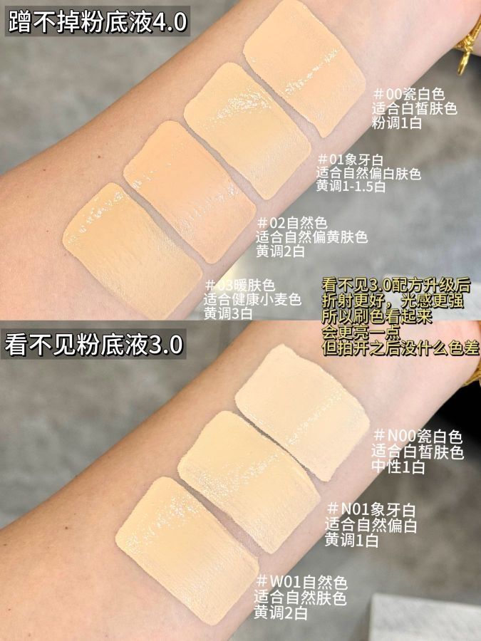 纠结PL家这两款爆款粉底液的姐妹看过来!看不见3.0适合干皮混干,蹭不掉4.0适合油皮混油,这俩简直各有亮点! 🎀PL看不见粉底液3.0 薄涂是清透的奶油肌,厚涂无瑕原生水光肌,一瓶两个妆效!!共3个色号~这次的配方折射更好了,光感比旧版本都更强,1.0版已经够好用了,这次新升级的3.0版本不但兼顾了1.0的轻薄滋润还有2.0的持妆高遮瑕,润到心坎!而且拍开蛮通透,薄涂一层遮瑕力都够了,粉感几...