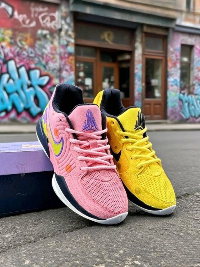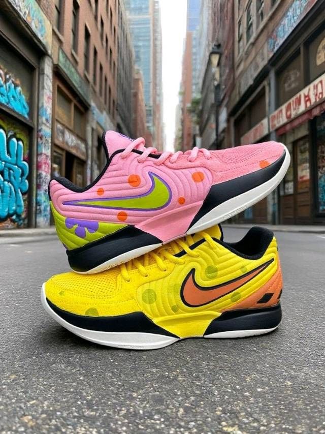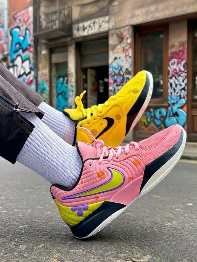 谁懂Nike 这双鞋子啊 黄色那只像海绵宝宝的欢乐黄🧽 粉色这只像派大星的俏皮粉🎀 打球时脚感轻快 平时穿去逛街 配工装裤或短裤 街头感拿捏 低头瞅鞋 仿佛把童年伙伴穿脚上 超有意思!