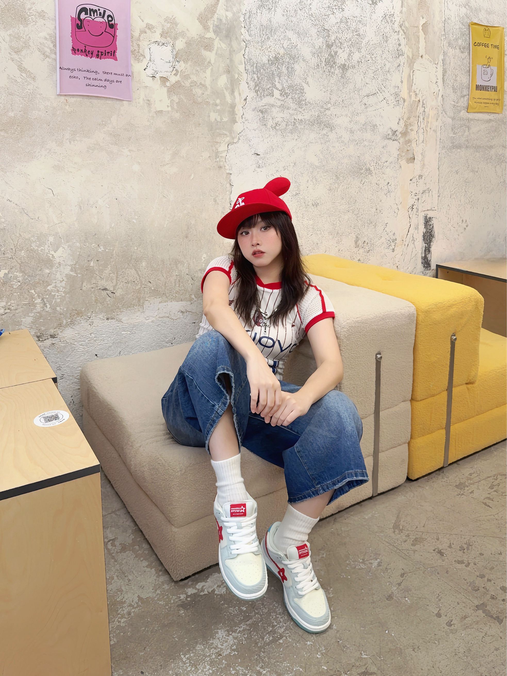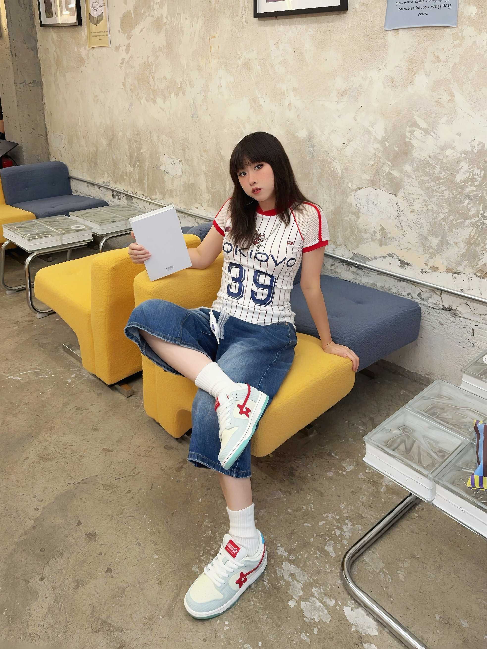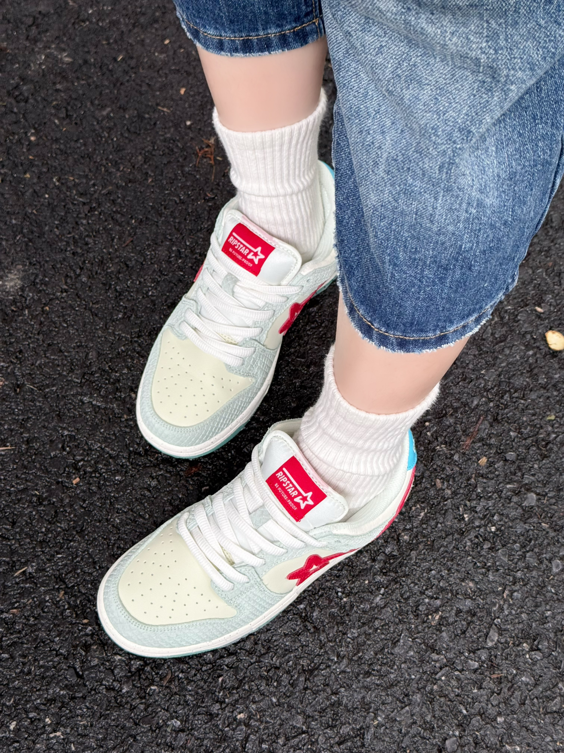 🧷夏天怎么能不穿美式风 🛹街头风ootd:球衣短袖+牛仔中裤,Ripstar美式板鞋,给夏天来点多巴胺~ 🩵薄荷绿撞色板鞋,配色hin有小众感,鞋面的麟片设计也很特别,不愧是蛇年限定,上脚满满的美式vibe🆒