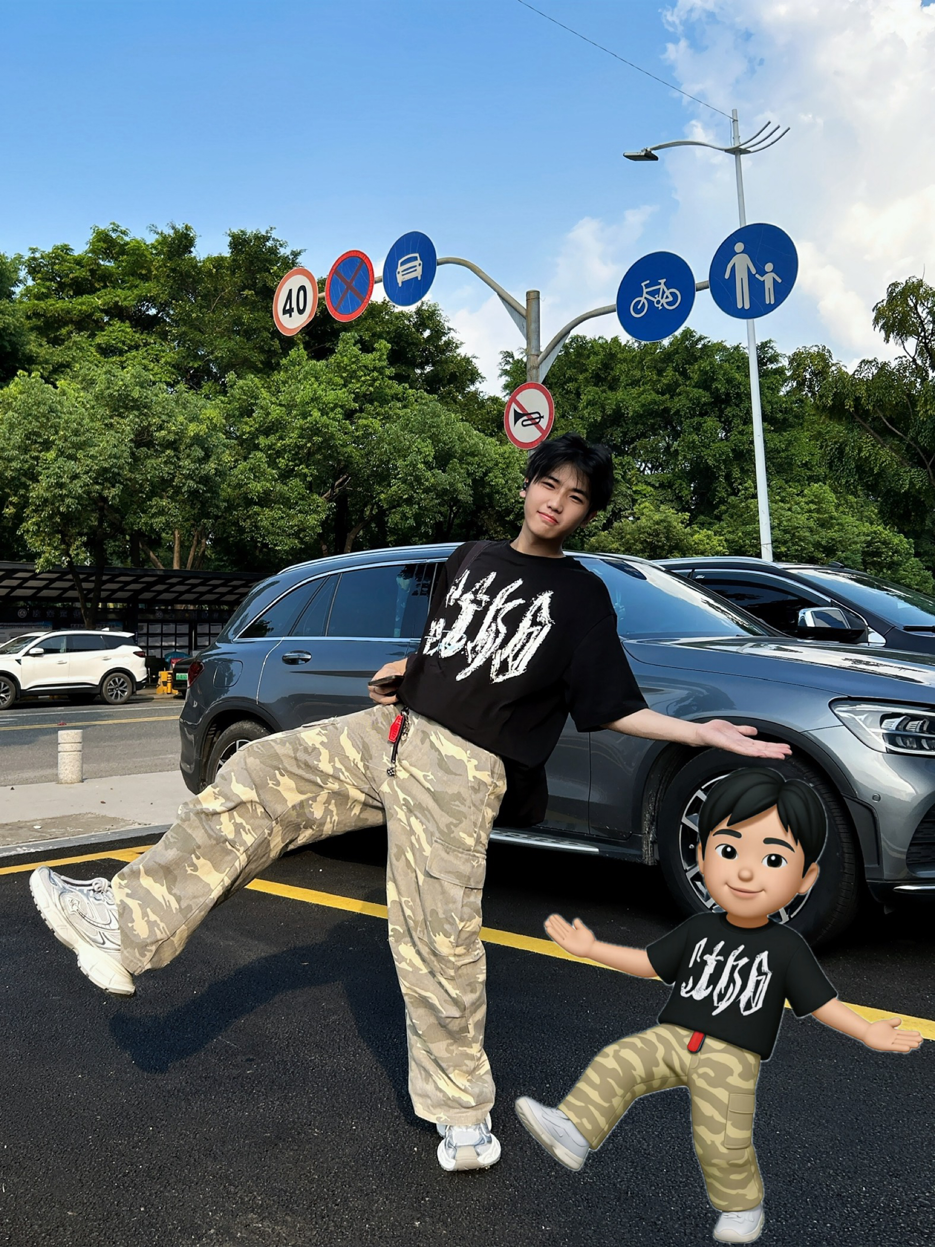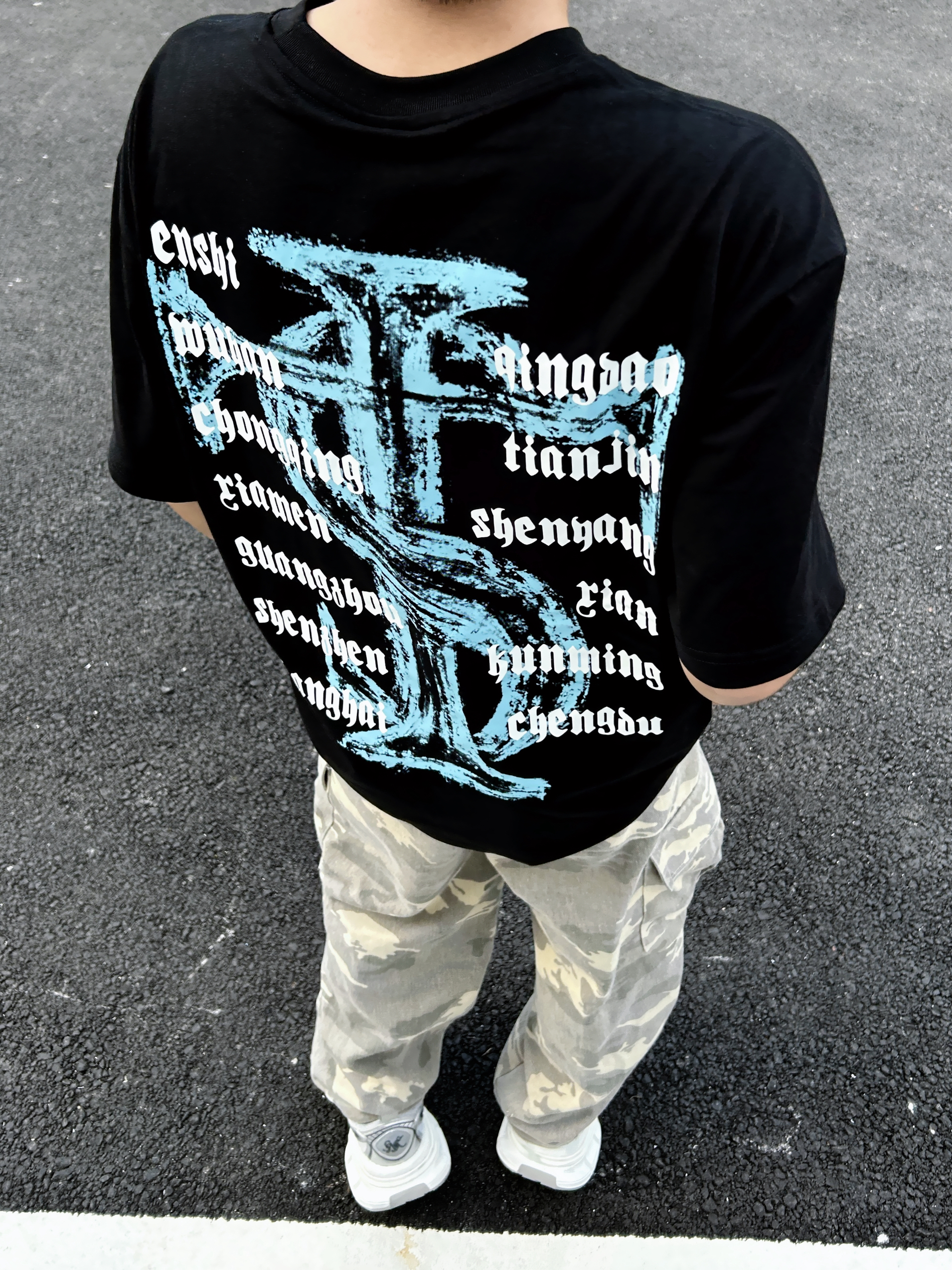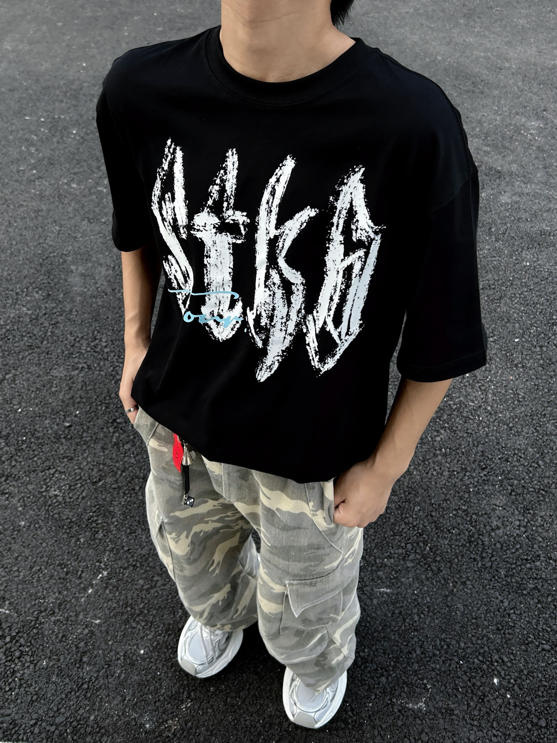 ☀️被阳光“晒”出灵感 跟着Emoji小人搞套街头松弛感穿搭! 字母印花黑T 简约又带劲 迷彩裤一穿直接拉满随性氛围 再踩双老爹鞋,出街走路都带风~ 日常这么搭,轻松拿捏街头潮感 主打一个不费力的帅!