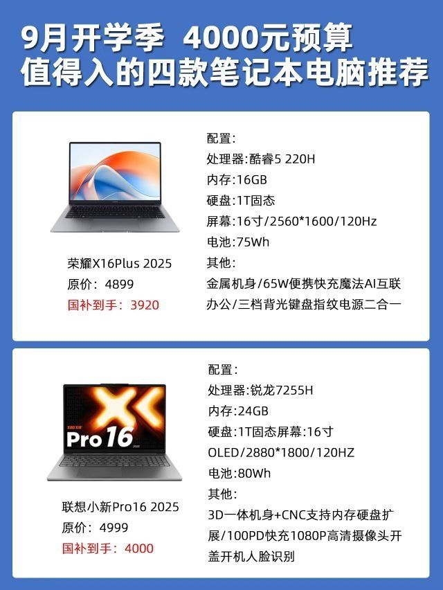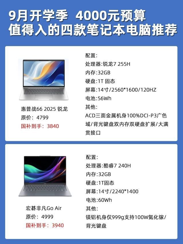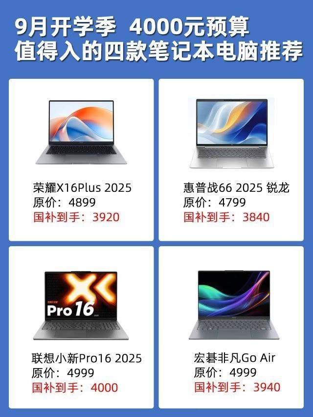 4000 元预算一直是主流选择,叠加国补后,不少原本 5000 元级的笔记本也落入该区间,且国补适用范围正逐步收紧,有需求建议抓紧入手。 推荐机型中,惠普战 66 2025 锐龙版性价比突出,是其许久未推出的高竞争力款;联想小新 Pro16 2025搭载的锐龙处理器,核显性能优势明显,对显卡有一定要求的用户可重点关注;宏碁非凡 Go Air以 999g 的超轻薄机身,成为差旅频繁用户的优选;而荣...