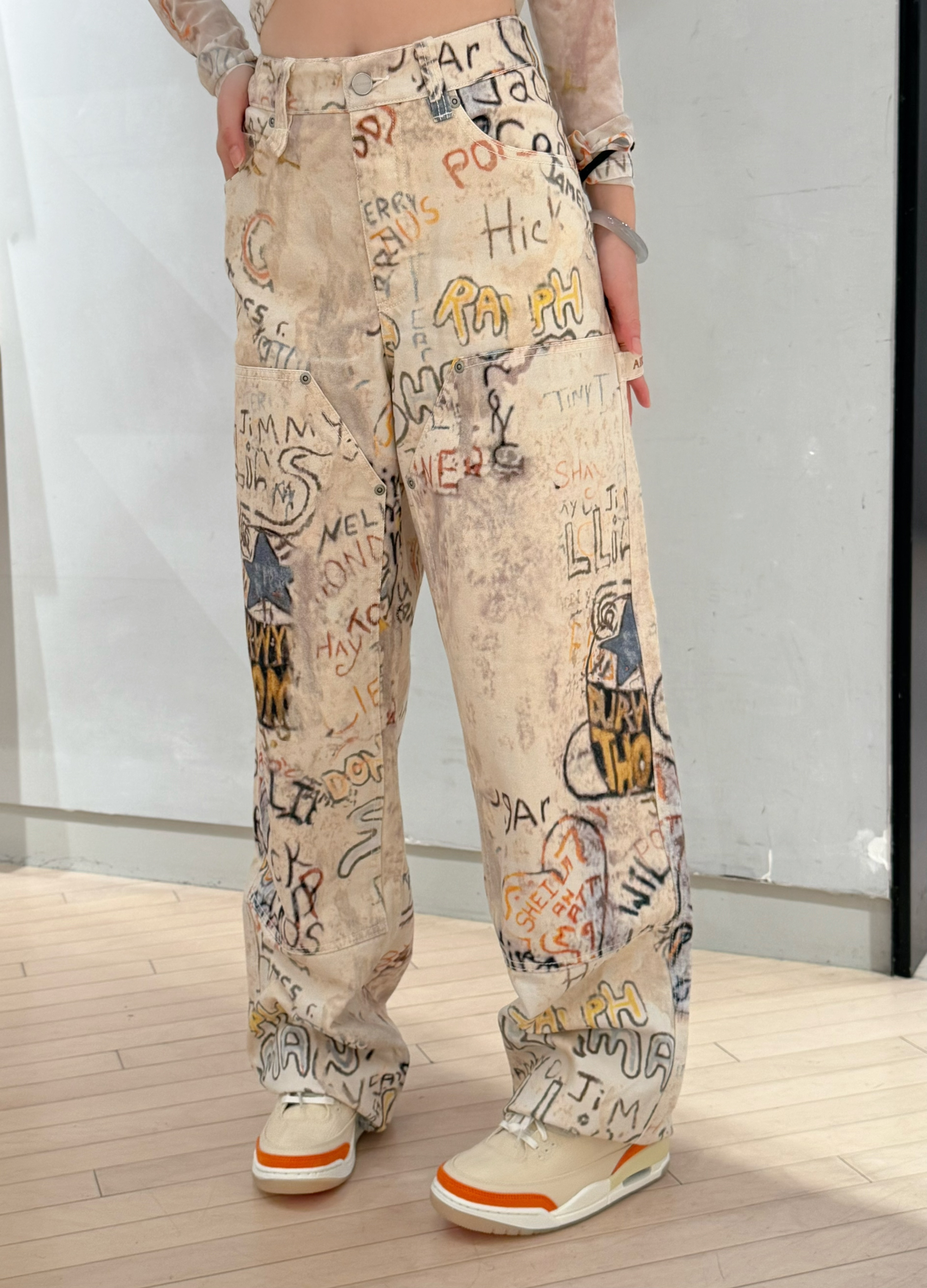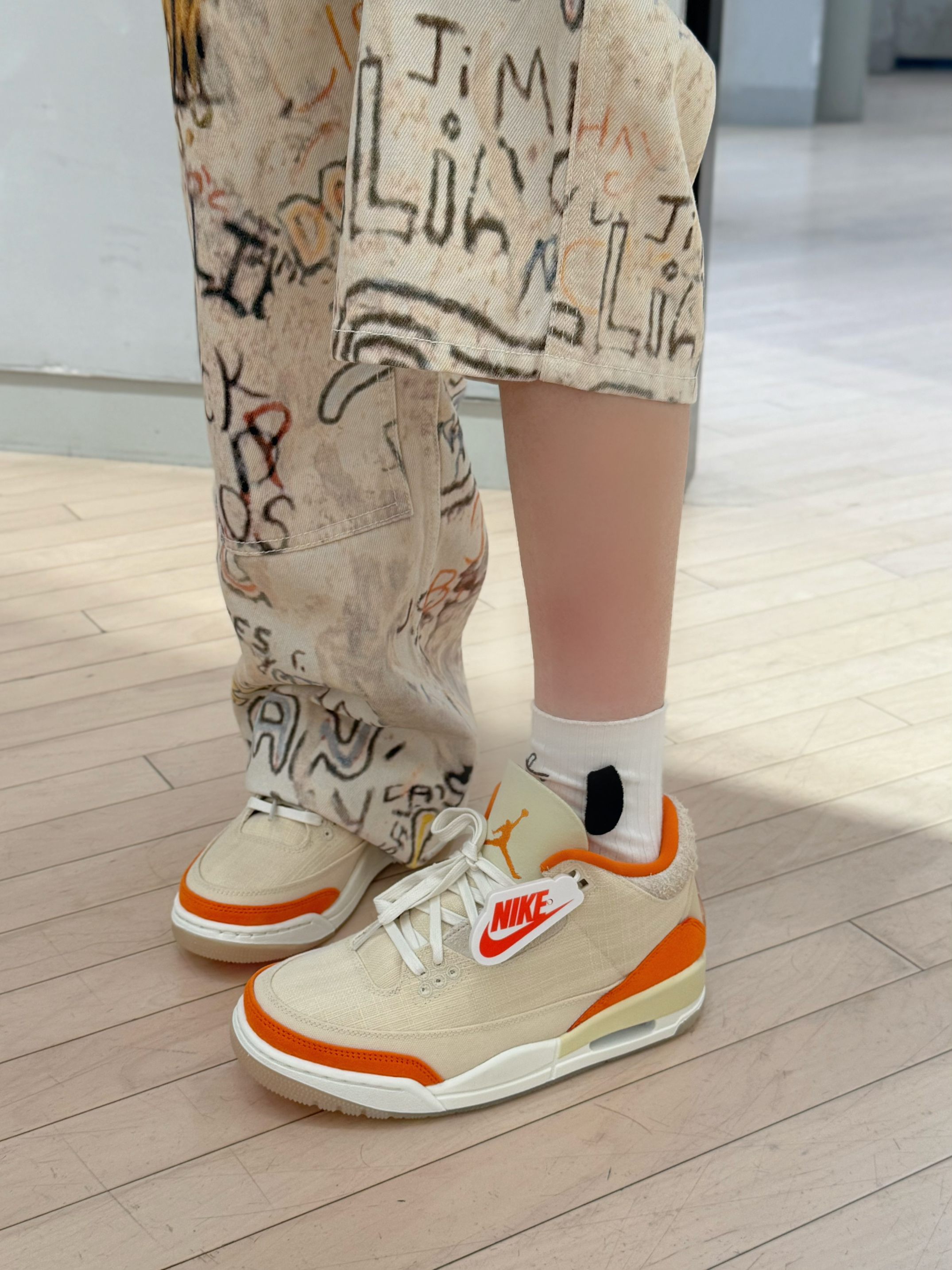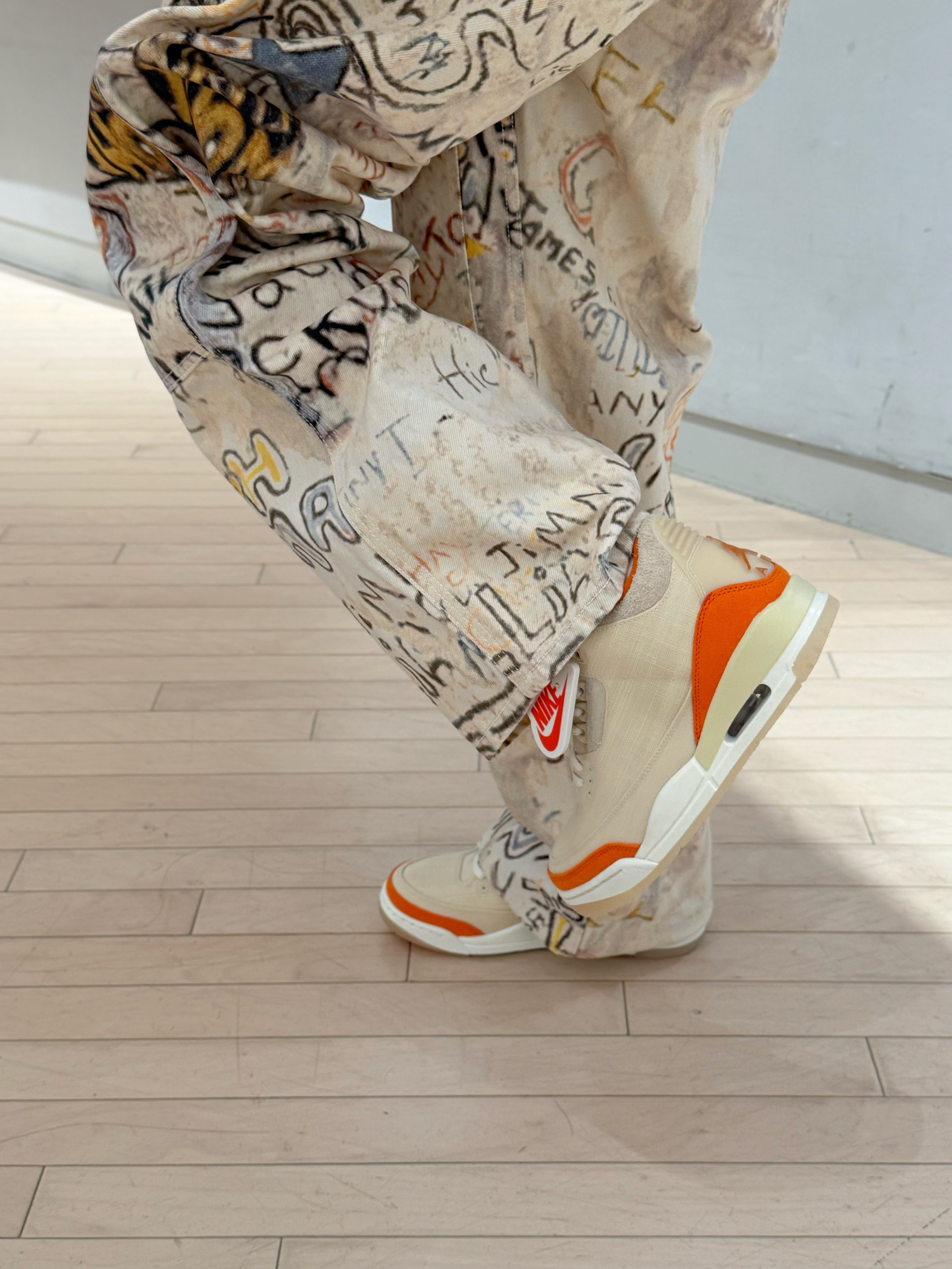 今日穿搭修身花纹T➕牛仔裤涂鸦裤 这套上身真酷呀! 👟是AJ3🍊的新配色鞋身整体采用了杏色搭配橙色组 合而成 鞋面材质则是以帆布材质主 耐看款 当👫款绝啦~