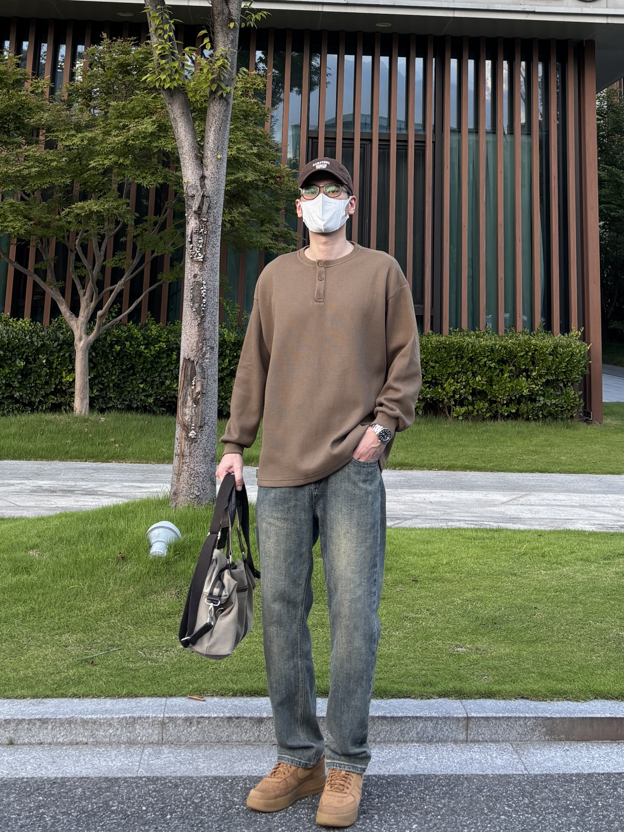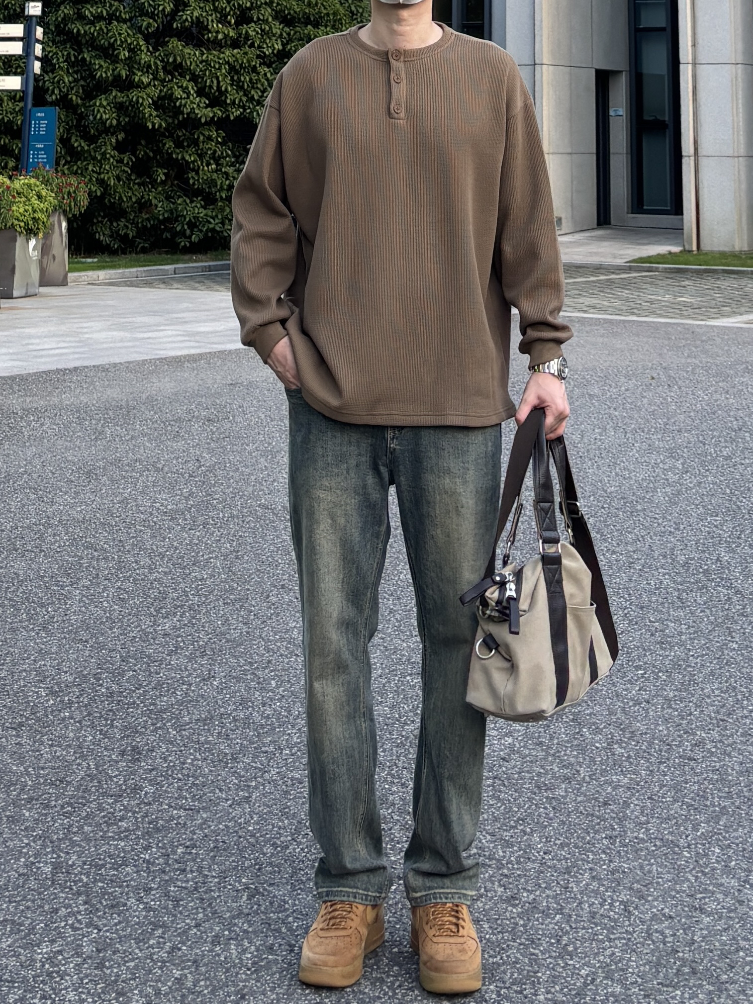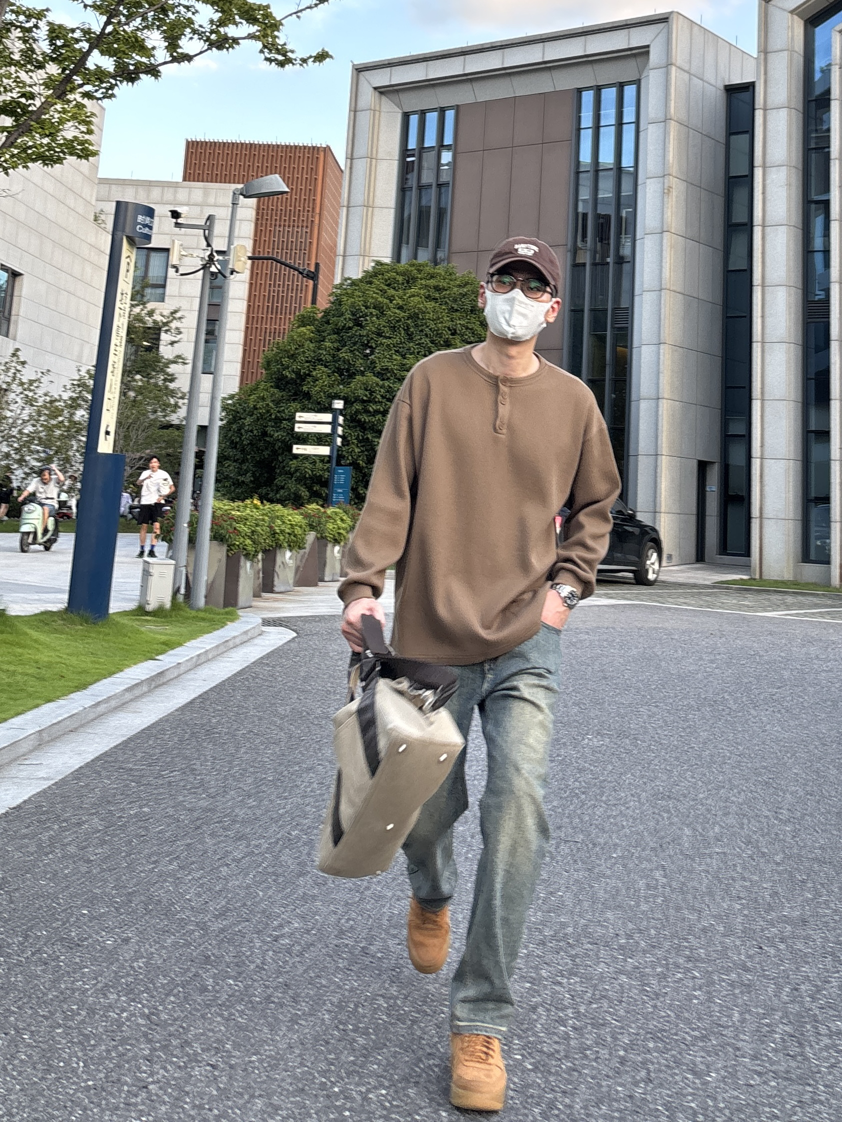 今天这套上衣穿了一件深棕色宽松重磅华夫格亨利领卫衣 ⬇️ 裤子选择简约大方的蓝色直筒水洗牛仔裤 ⬇️ 鞋子上脚经典百搭的小麦色af1 ⬇️ 最后拿一个卡其色帆布拼接手提包 - 今日搭配 衣服裤子:NICE LILI 鞋子:AF1小麦