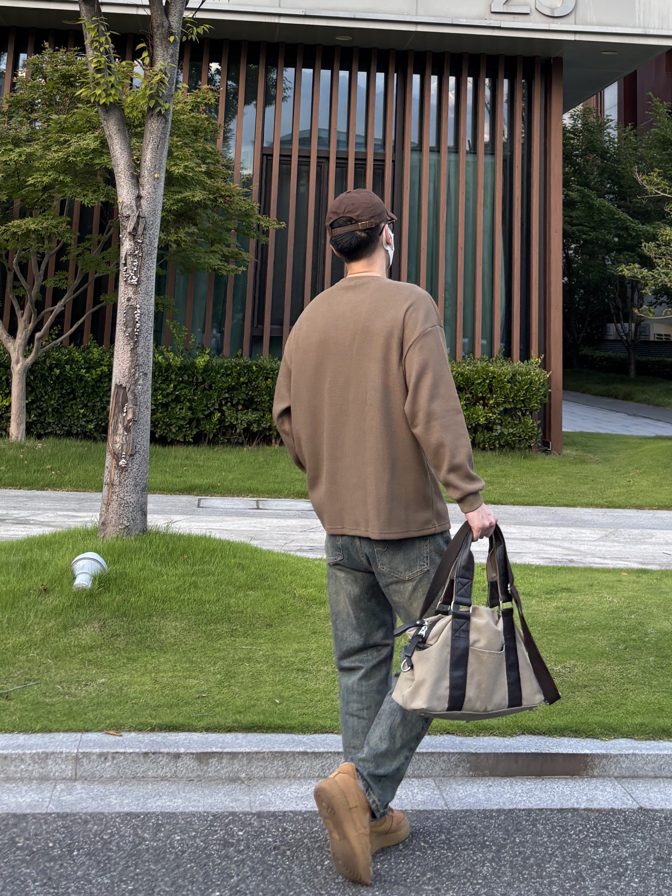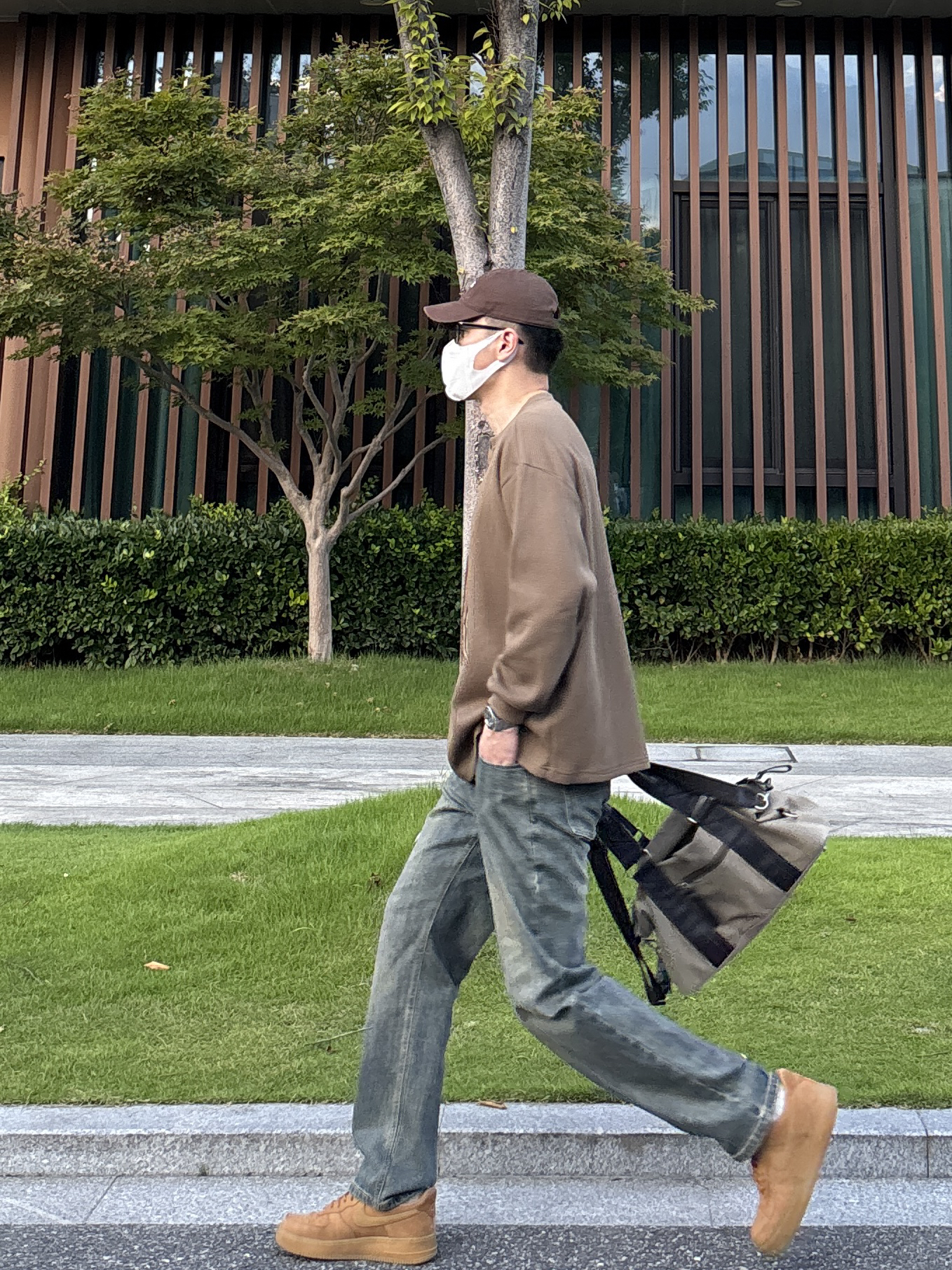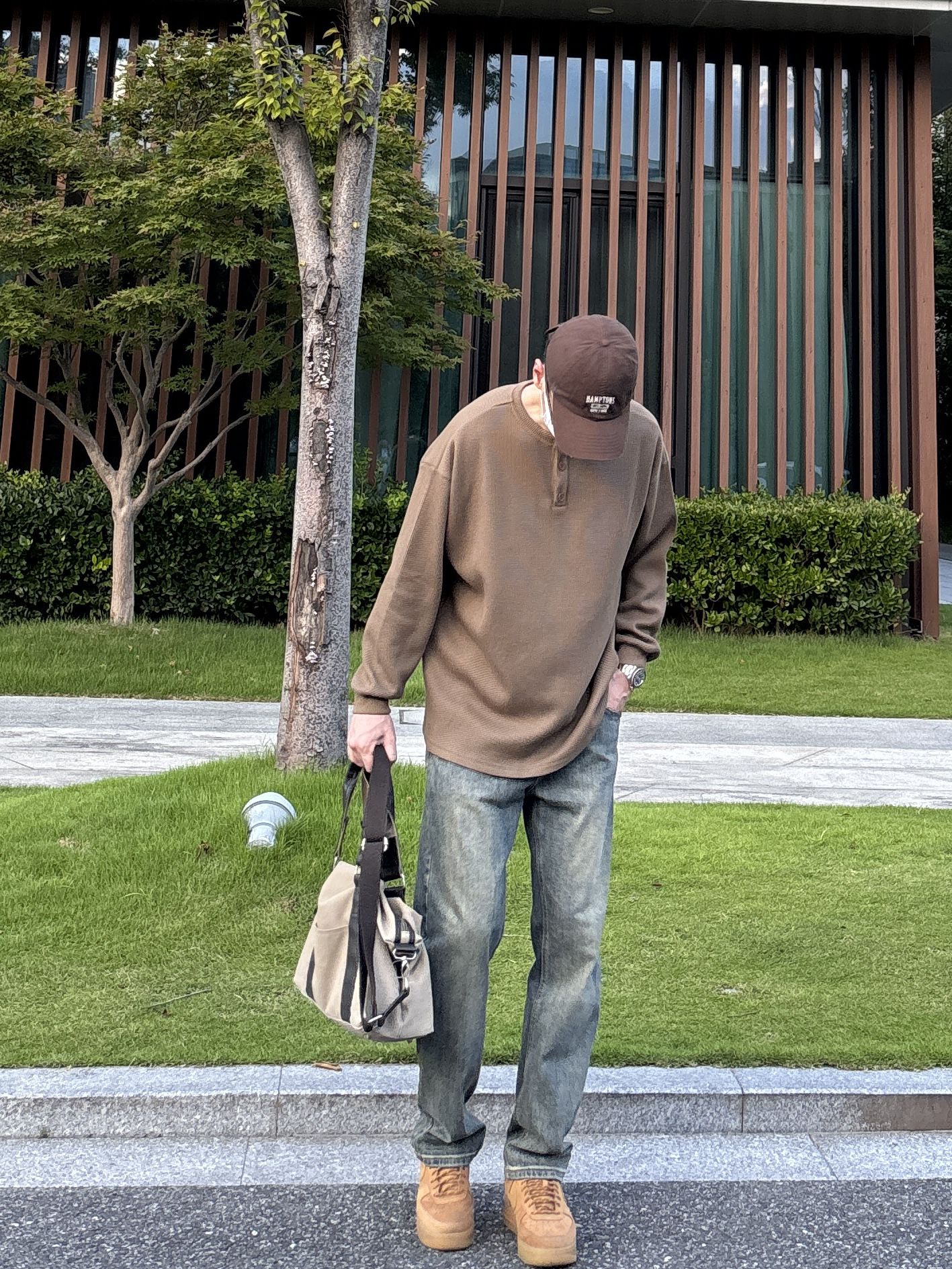 今天这套上衣穿了一件深棕色宽松重磅华夫格亨利领卫衣 ⬇️ 裤子选择简约大方的蓝色直筒水洗牛仔裤 ⬇️ 鞋子上脚经典百搭的小麦色af1 ⬇️ 最后拿一个卡其色帆布拼接手提包 - 今日搭配 衣服裤子:NICE LILI 鞋子:AF1小麦