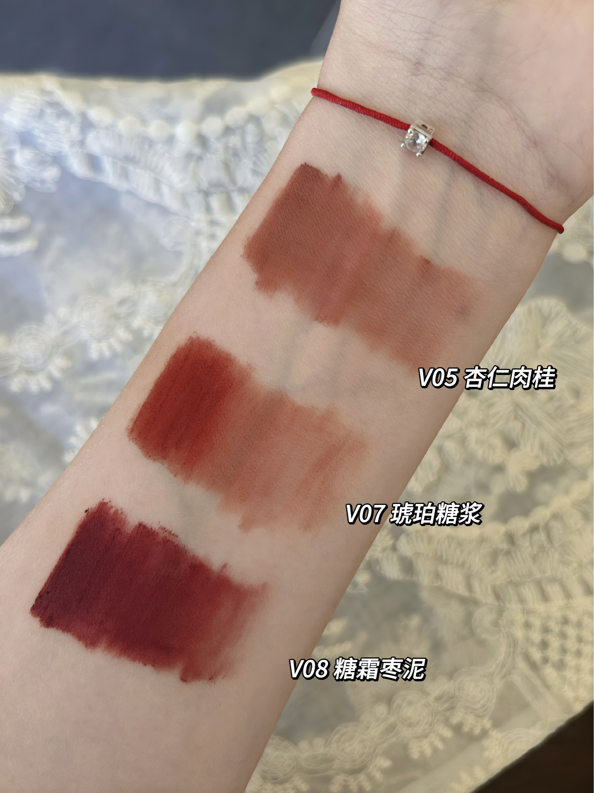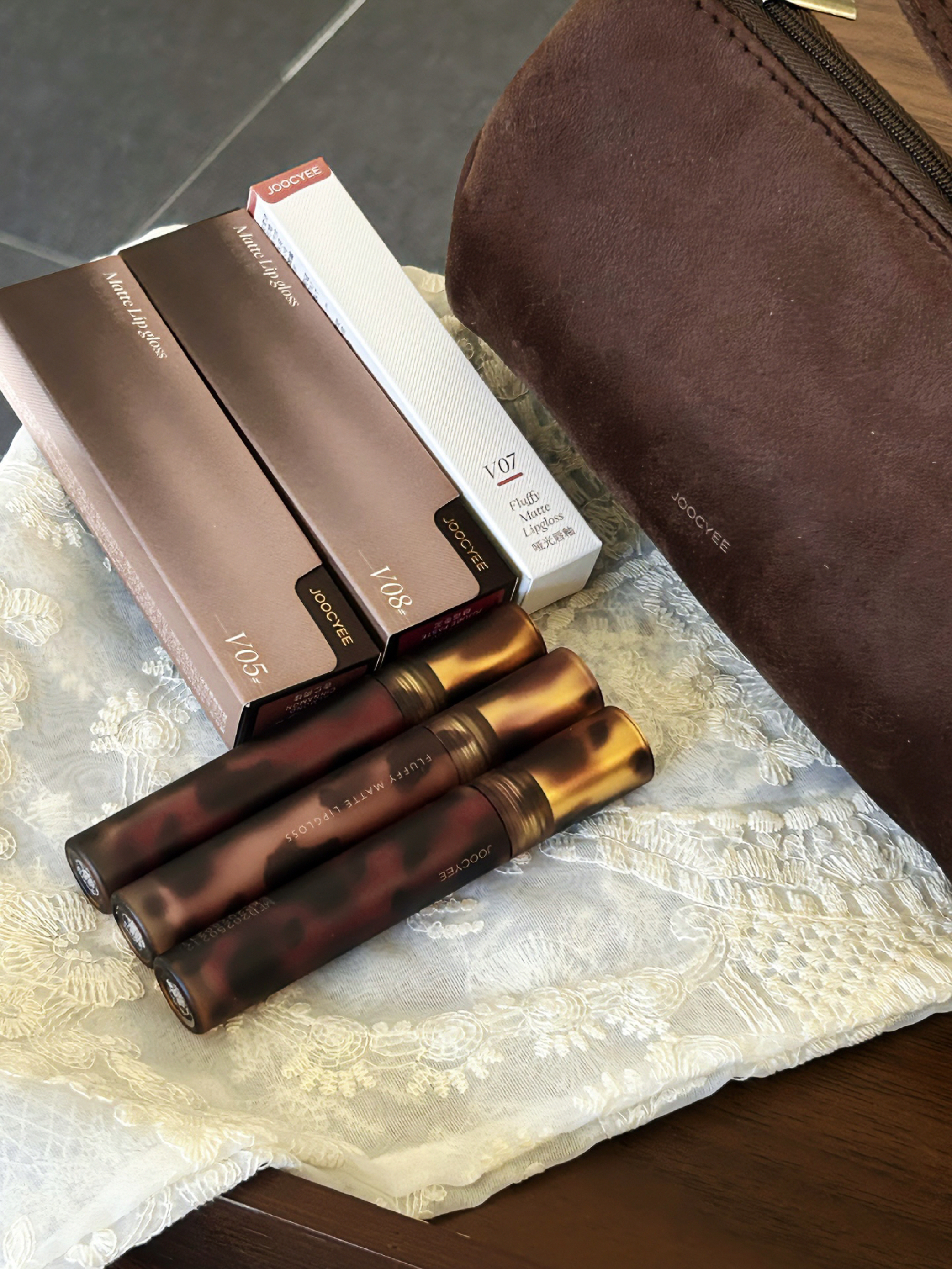 不得不说酵色真的好会啊 这个琥珀唇釉一下子就把我拿捏住~ 一个化妆包+三支哑光唇釉 V05 杏仁肉桂 灰棕调杏仁肉桂色 真的会把整个妆容的高级感拉高一个台阶 是秋冬气质褂的颜色 V07 琥珀糖浆 谁用谁显白的颜色 黄皮大胆涂 焦糖橘棕上唇太好看了 这只纯纯欲欲的 V08糖霜枣泥 复古红棕色 是那种浓郁挂的 嘎嘎提气色