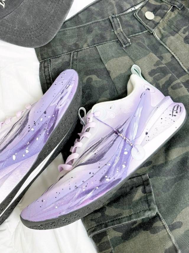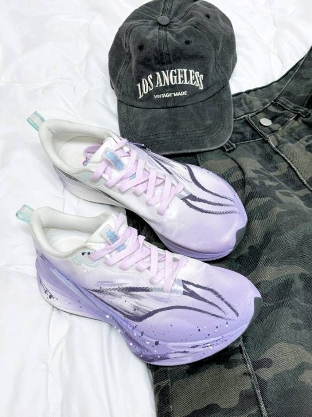 介双跑鞋整体紫色💜的配色加上国风渐变的设计,分分钟心动💕出门回头率超高💯 鞋子整体上脚给我的感觉就是很轻便软弹🍃,鞋面䨻丝设计很透气,夏天穿也不会闷脚🦶不论是跑步还是日常通勤雀实很舒适✅ 鞋子渐变紫色的设计很有韵味也不很百搭,日常搭配休闲裤短裙👗甜美有氛围💯搭配短裤🩳运动裤吸睛有活力🥰👟