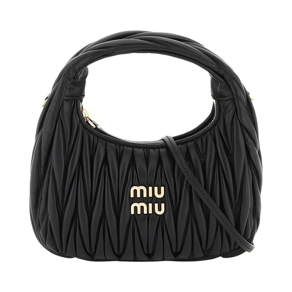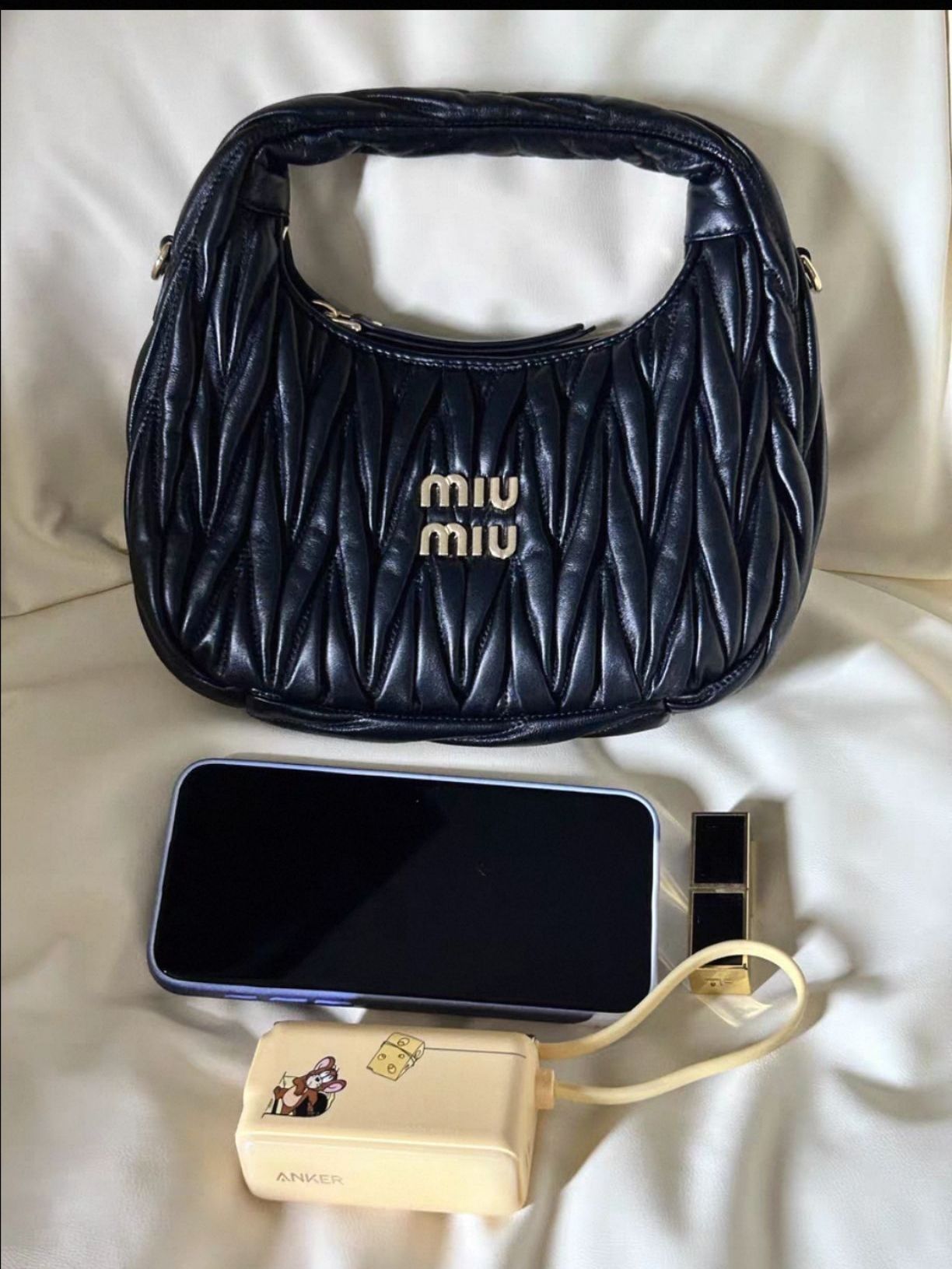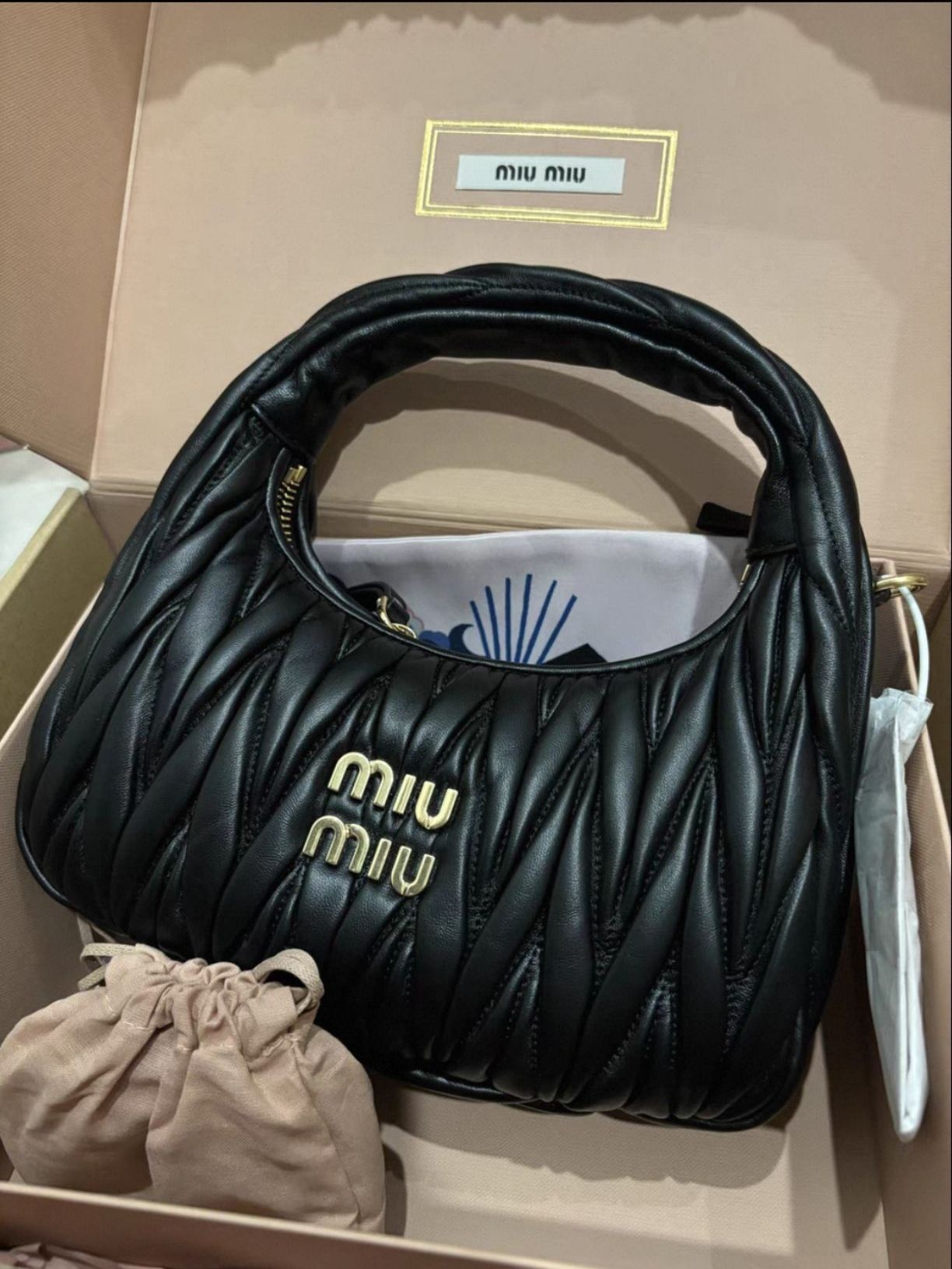 本篇笔记关联了MIU MIU Matelassé Hobo 小号 软羊革凸纹绗缝提花拉链开合时尚纯色褶皱金属刻字徽标Logo手提单肩包 黑色等商品,为用户提供真实的使用体验和购买参考。