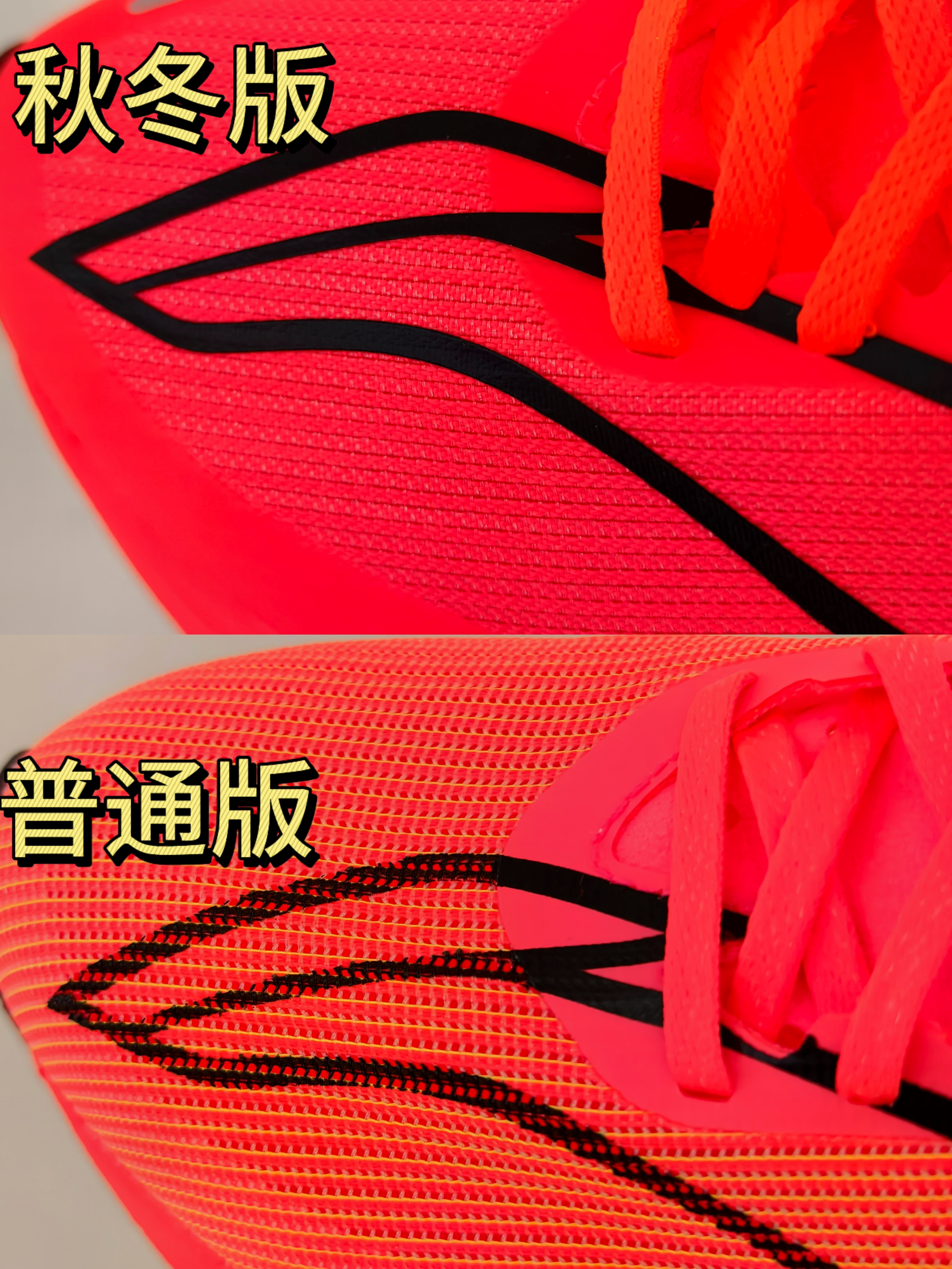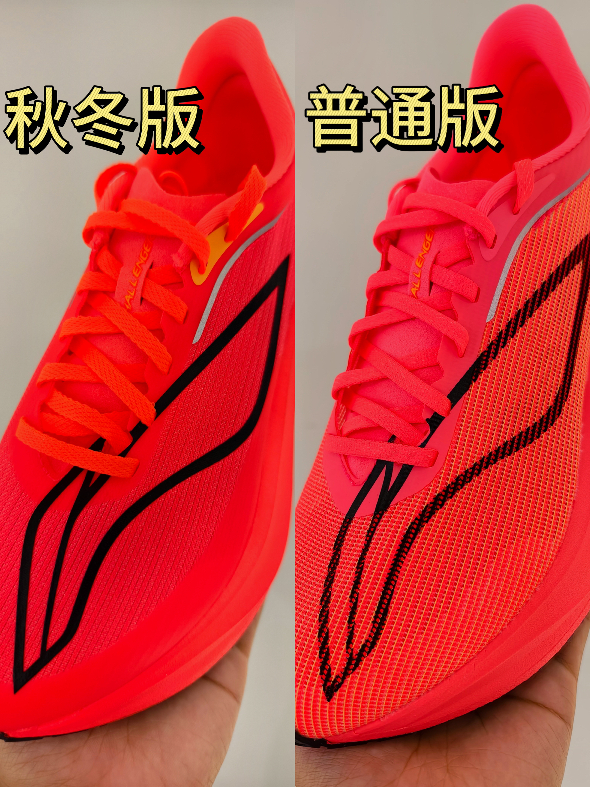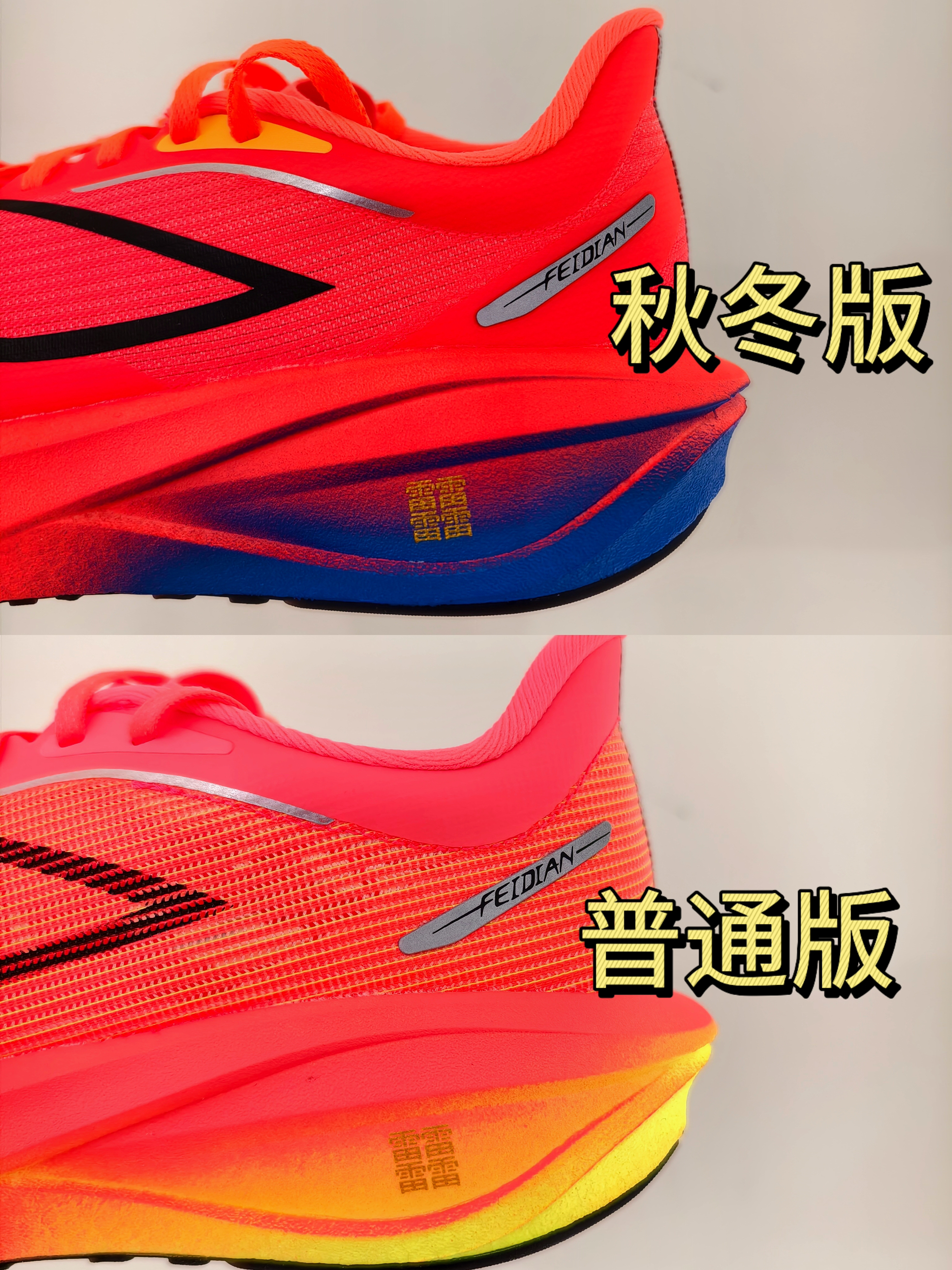 最新的飞电5C秋冬版已经上线了,和目前有款配色几乎一模一样,给大家将两款配色区别直观呈现出来。 比较能直接感受的,就是鞋面的变化,对鞋面有特殊需求的朋友可以留意。