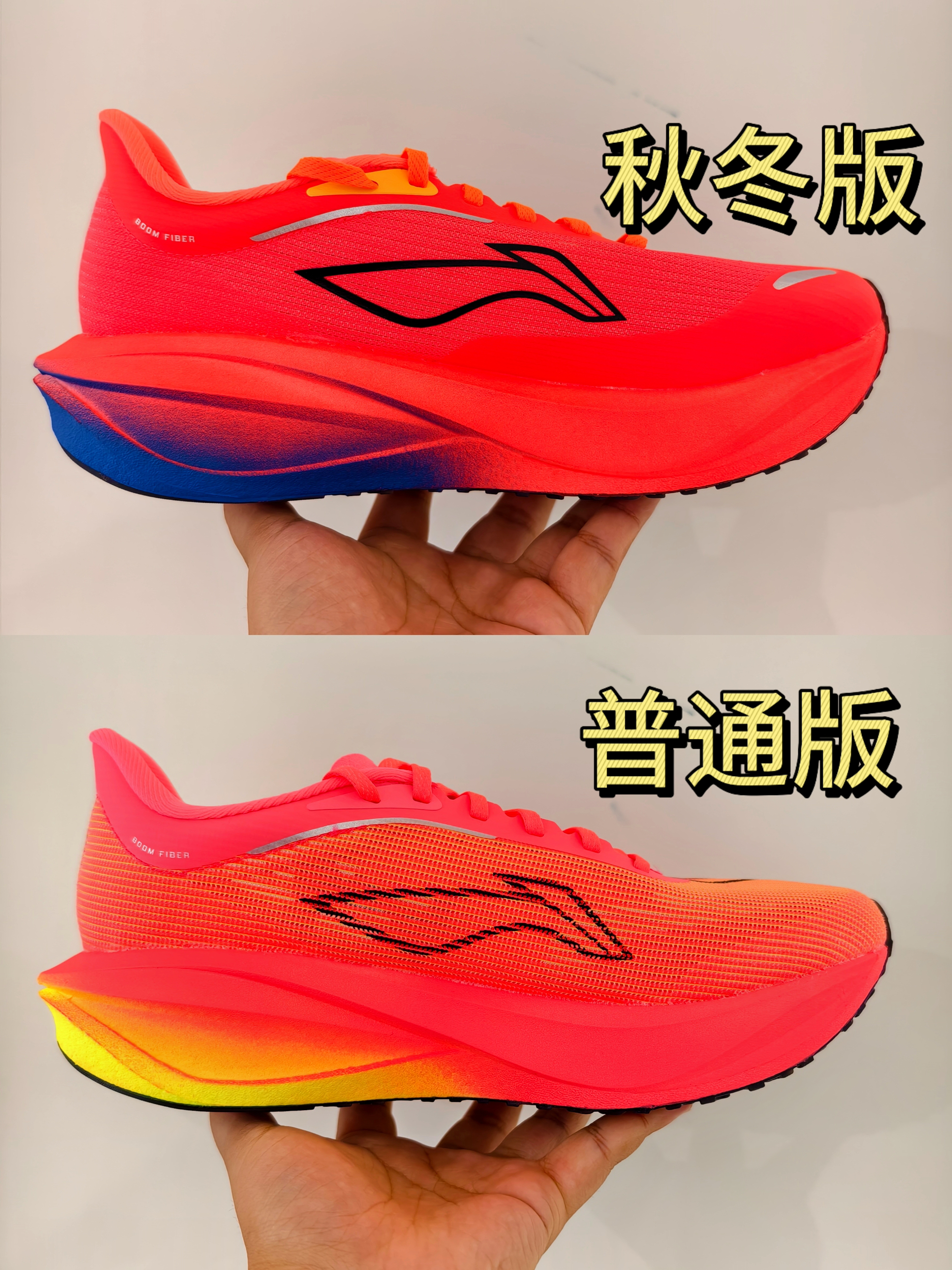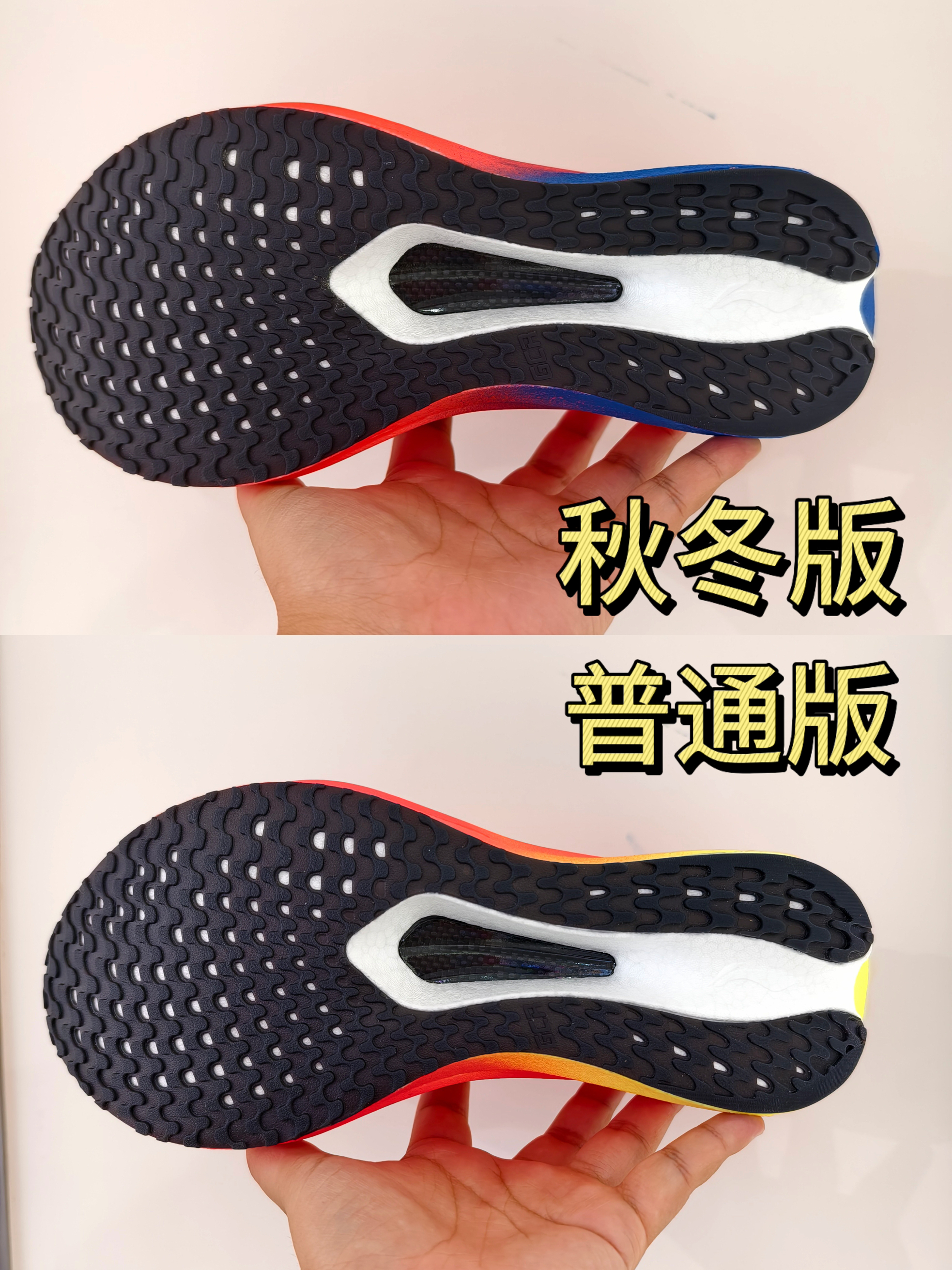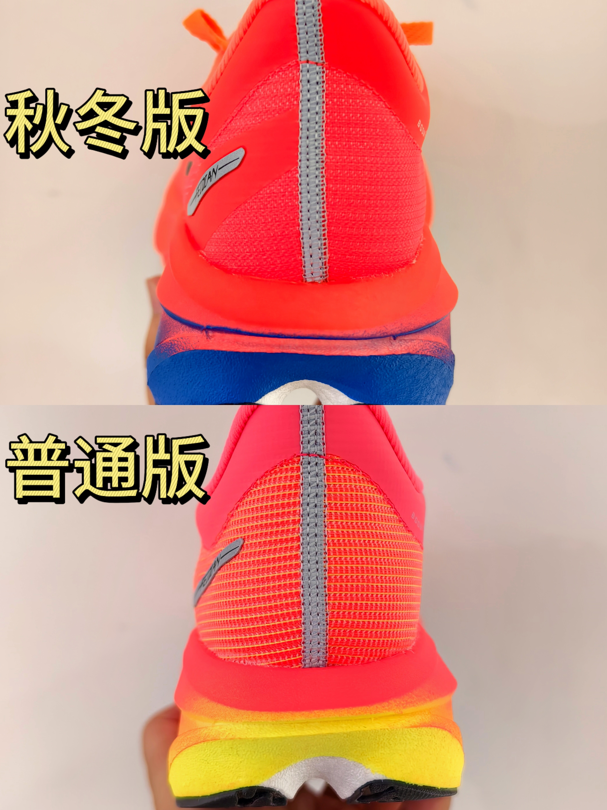 最新的飞电5C秋冬版已经上线了,和目前有款配色几乎一模一样,给大家将两款配色区别直观呈现出来。 比较能直接感受的,就是鞋面的变化,对鞋面有特殊需求的朋友可以留意。