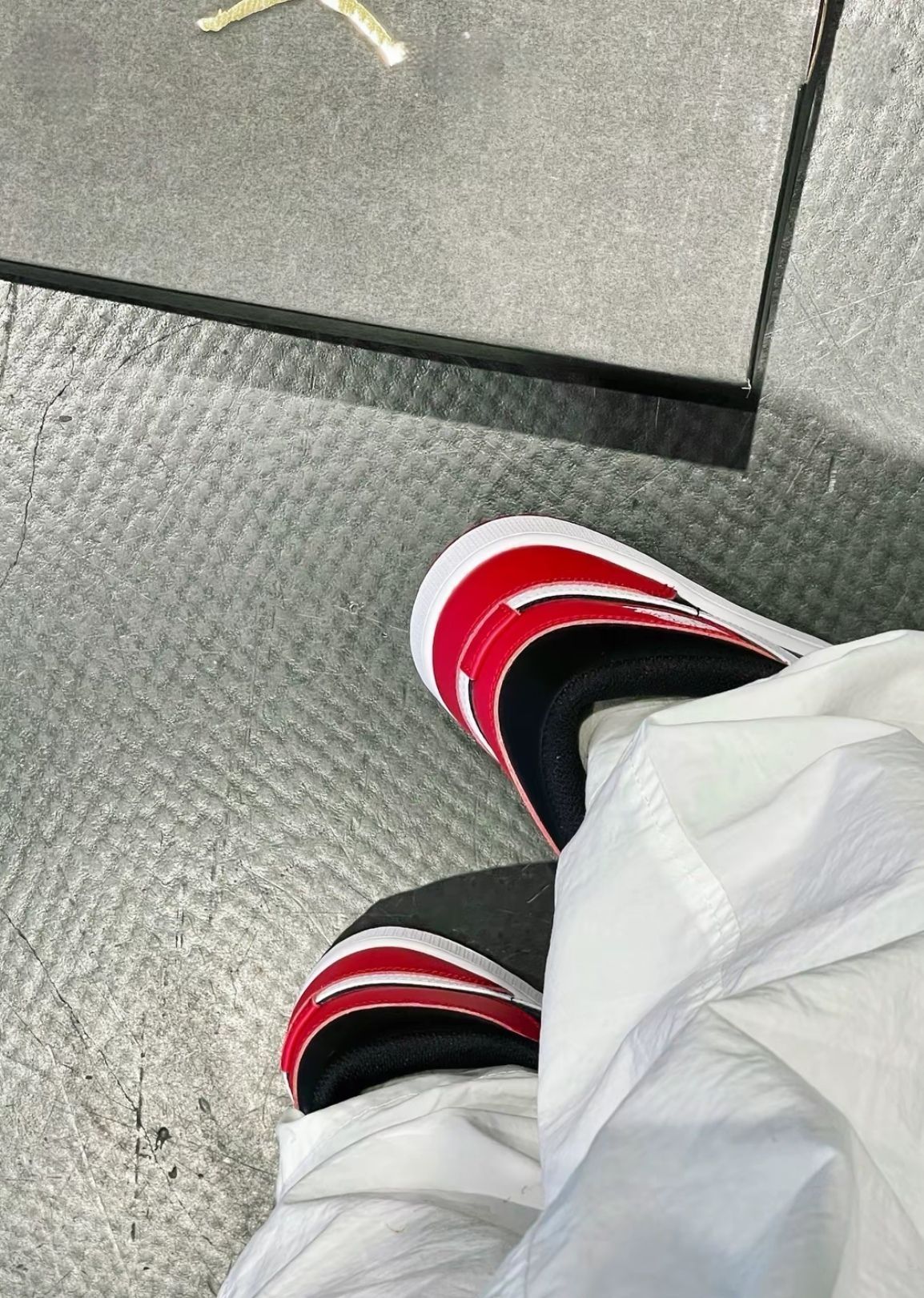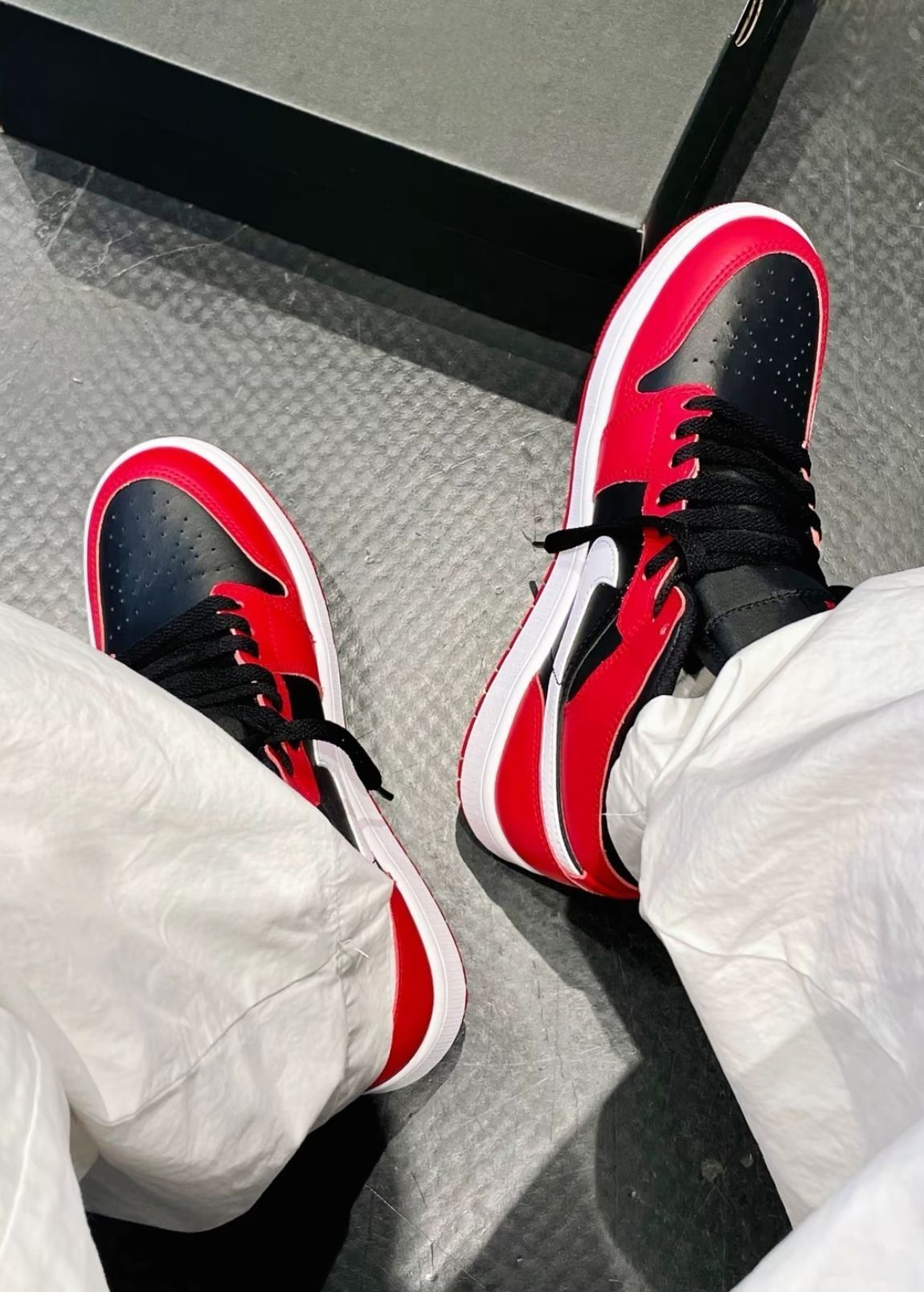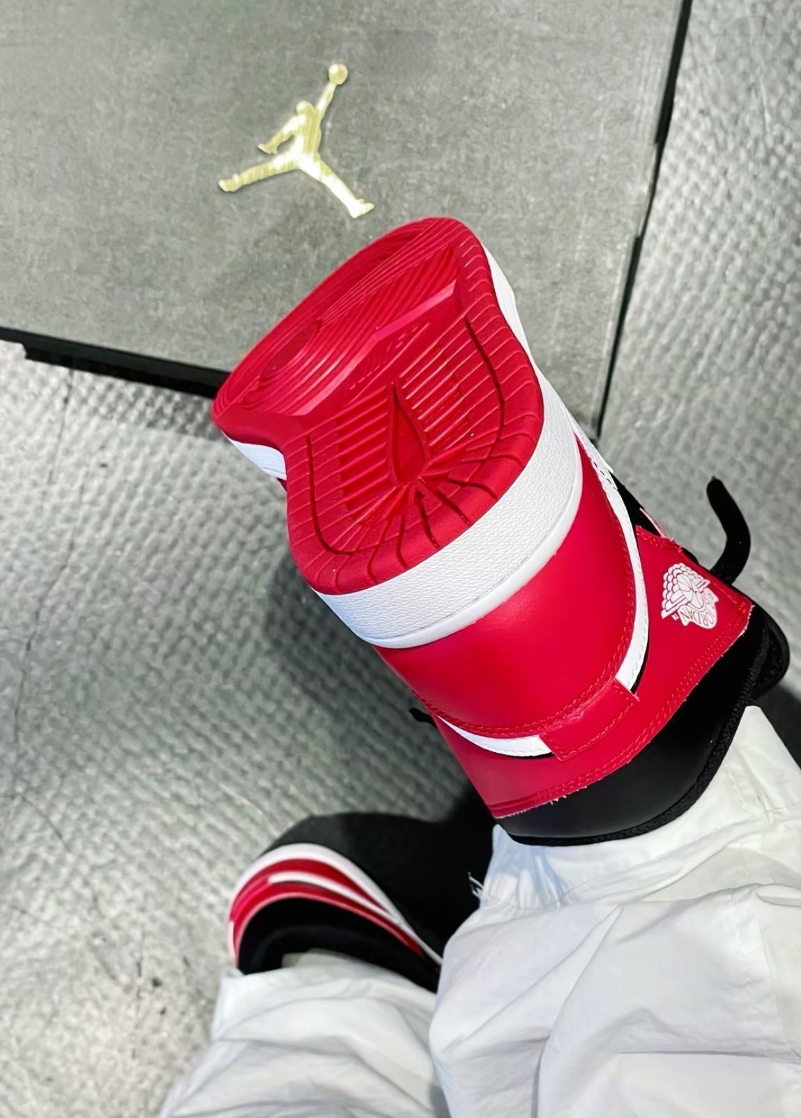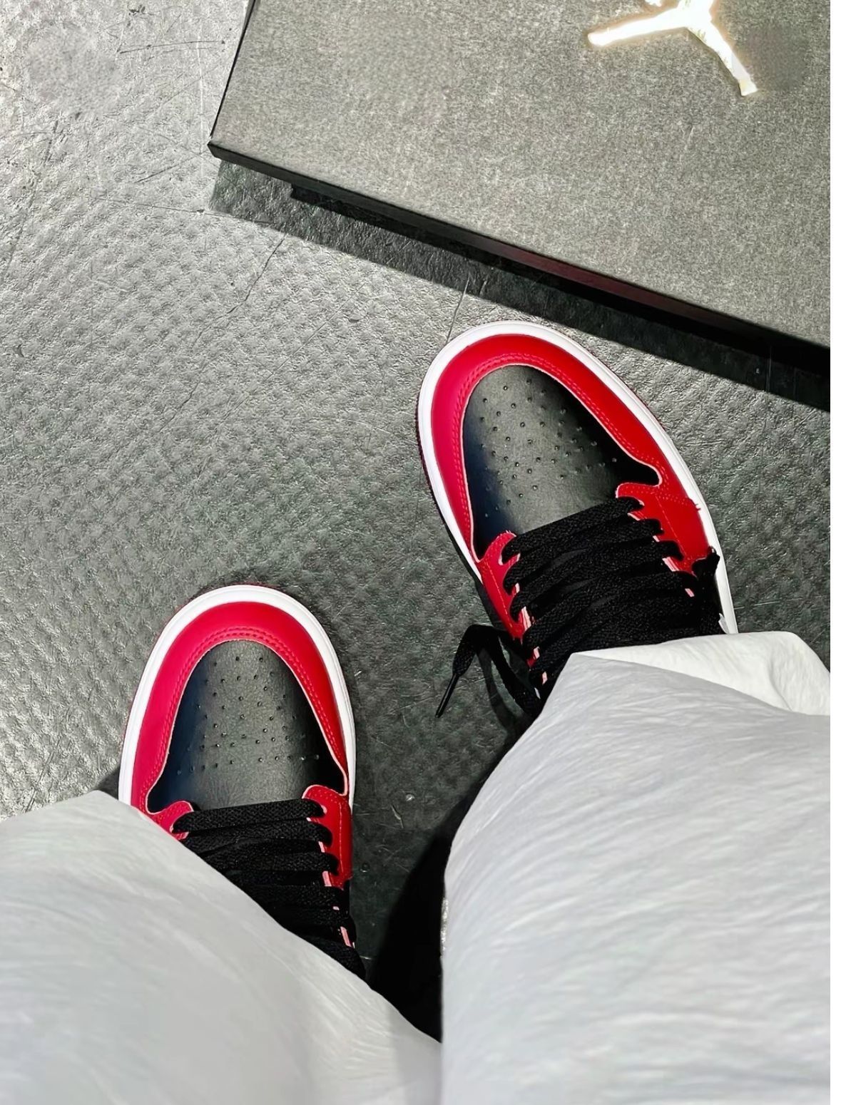 经典黑红拼接,自带街头酷感,搭白裤子秒变潮流尖子生,穿去炸街回头率爆表✨ 皮质细腻有质感,鞋型超正,上脚包裹感满分,走路稳又舒服,暴走一整天都不累~ 鞋盒上金灿灿的飞人Logo 超有排面,自留或送朋友都超赞👍 入手不亏,鞋控必冲!