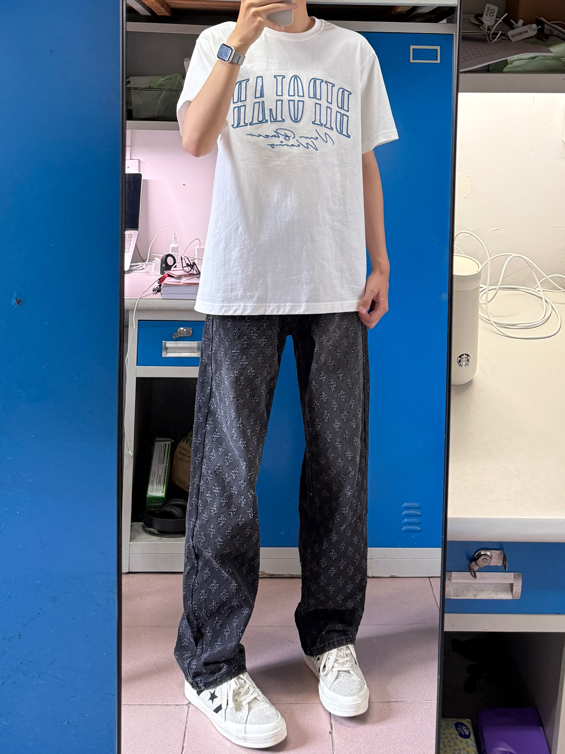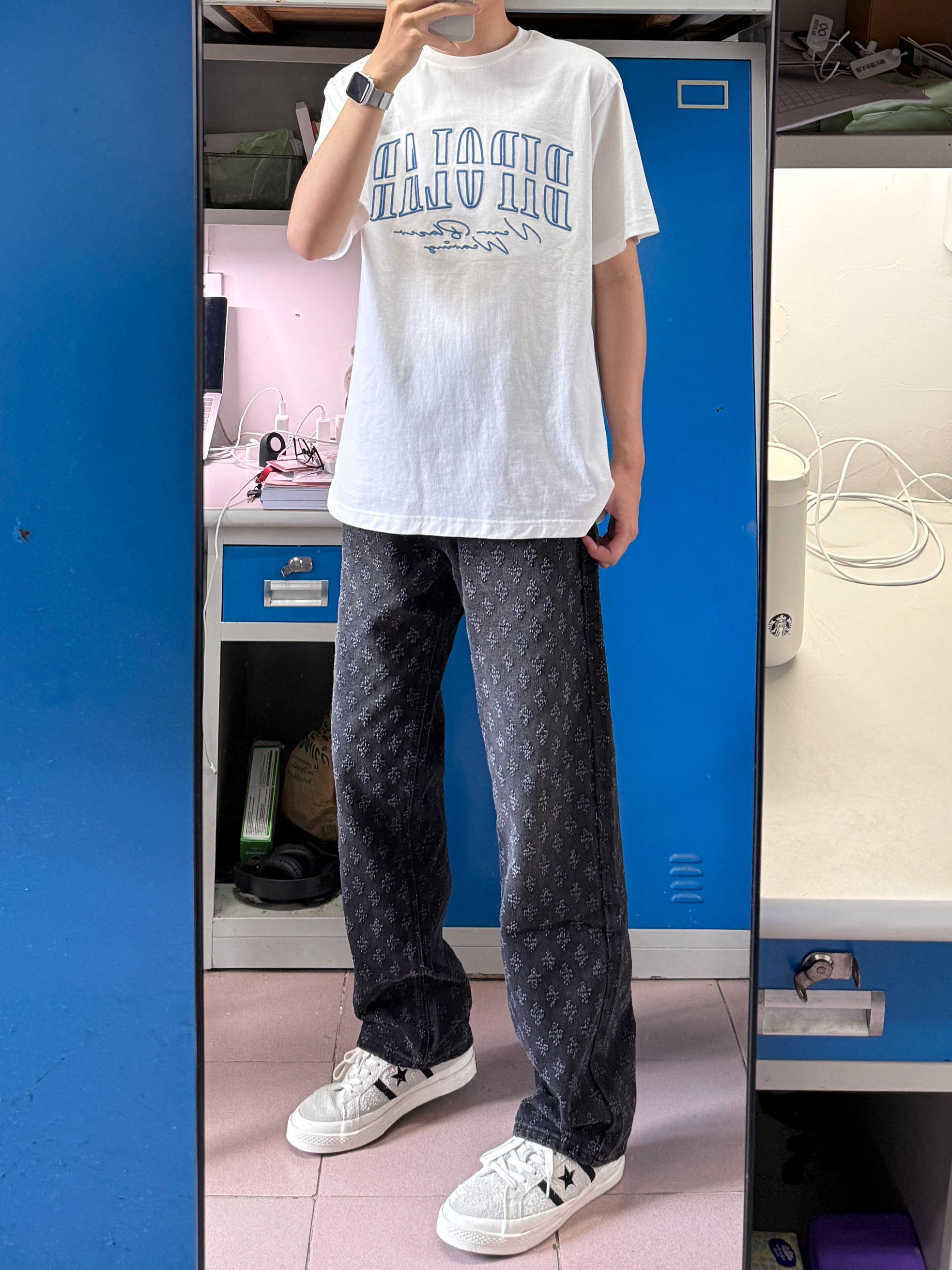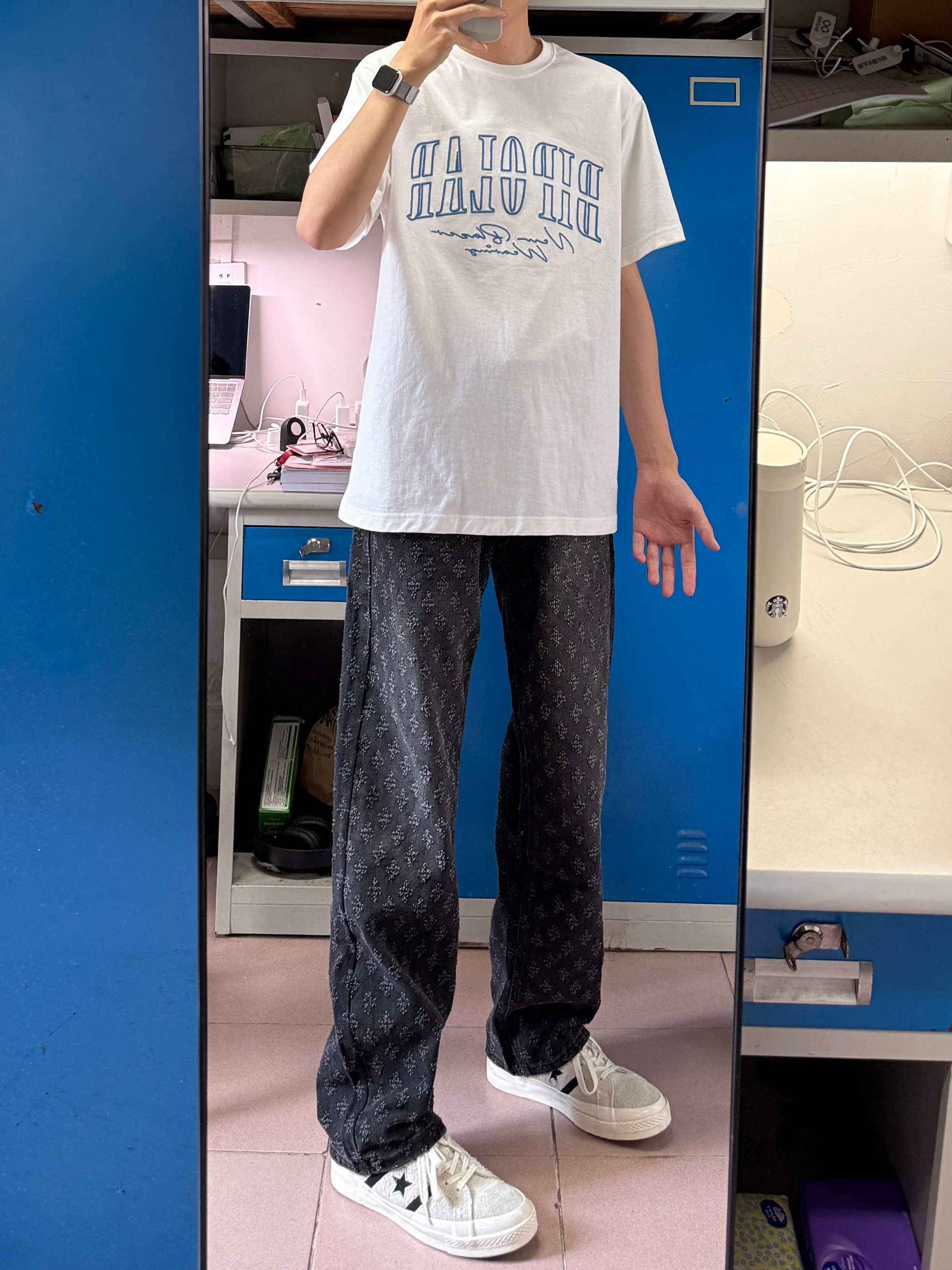 本篇笔记关联了GTRG 高级感提花满印做旧水洗直筒阔腿牛仔裤 G/09061448 黑、BIPOLAR/bipolar 立体绣断开字圆领硅胶落肩直筒短袖T恤 11B470 白等商品,为用户提供真实的使用体验和购买参考。