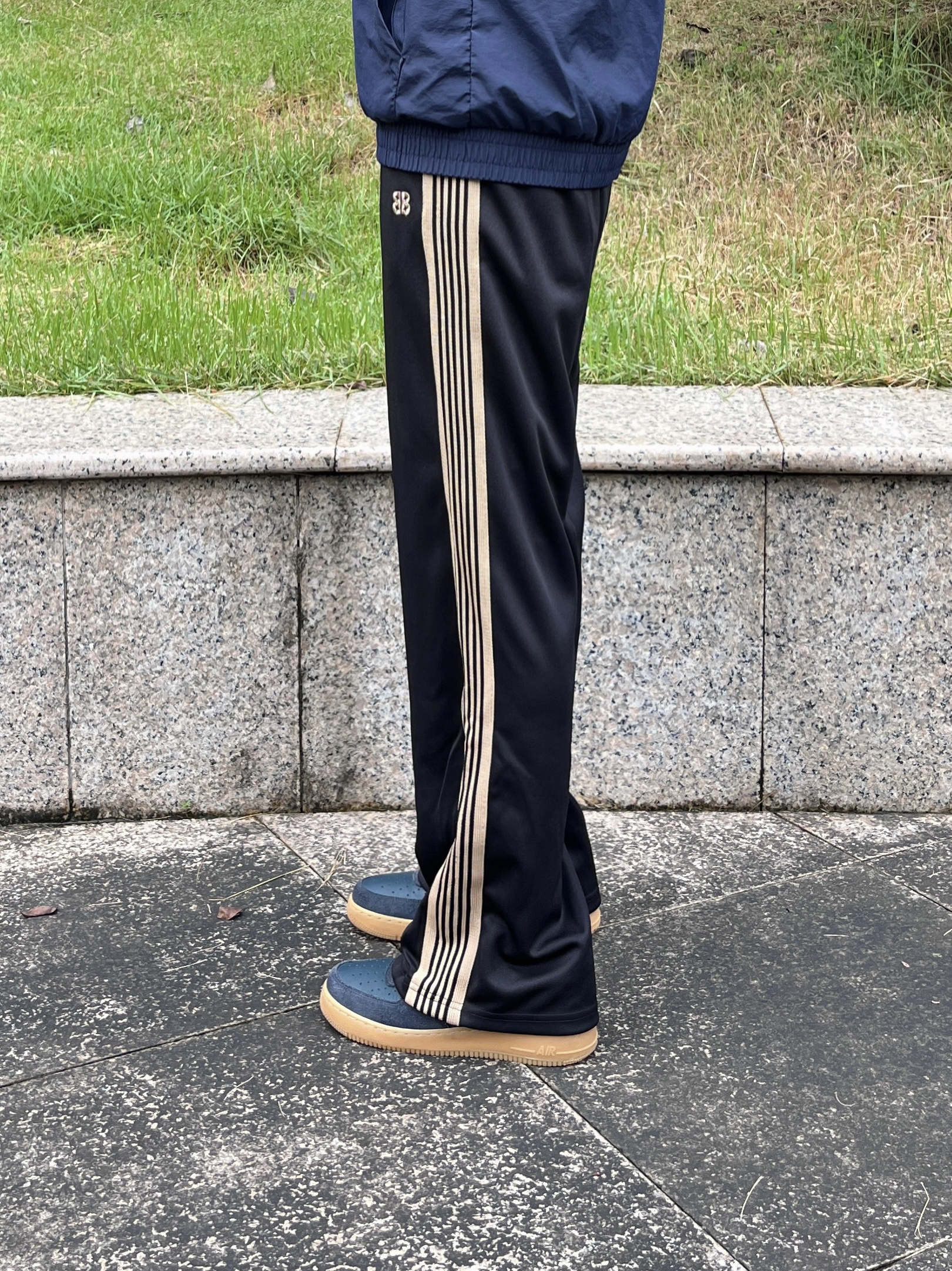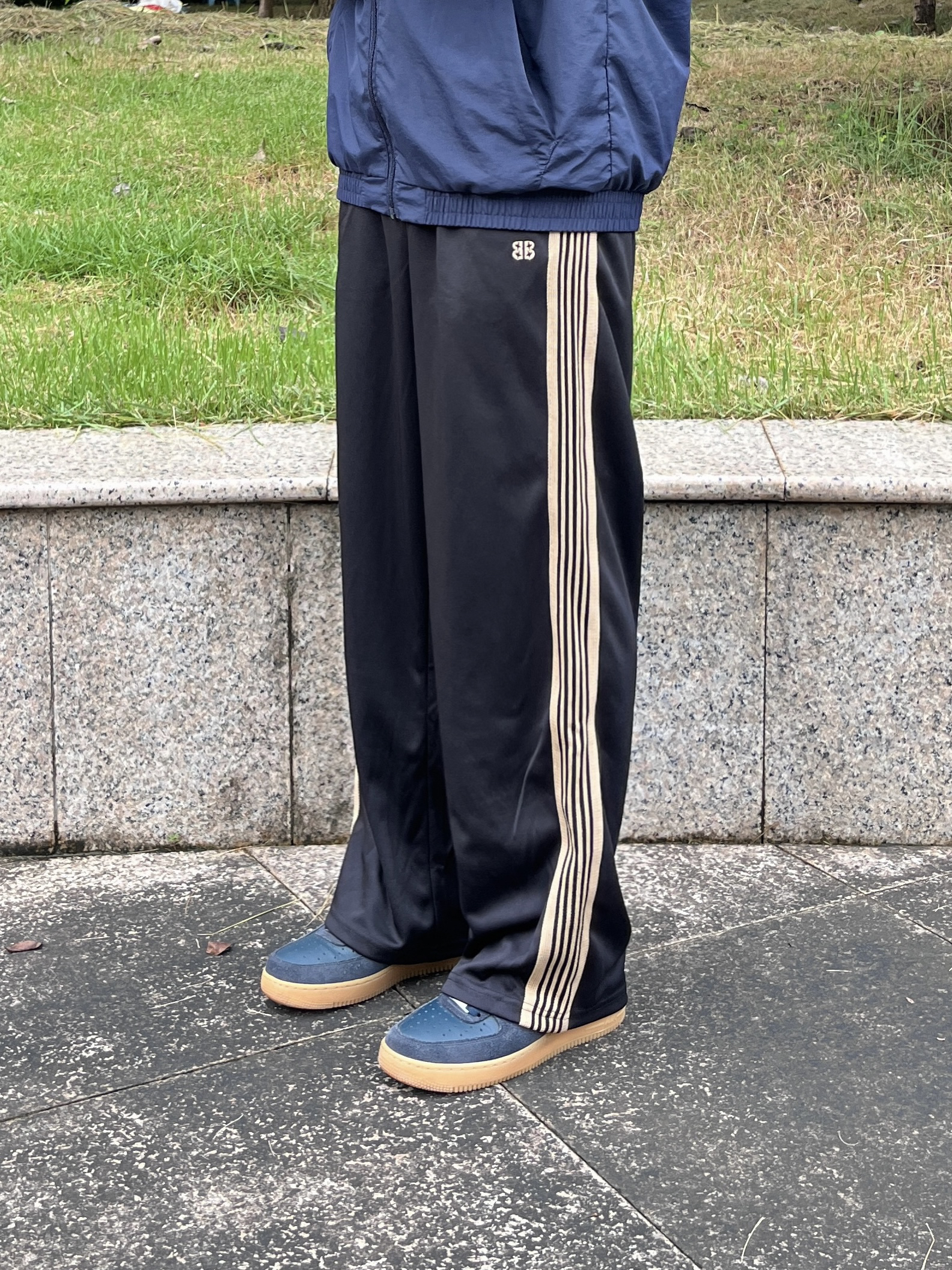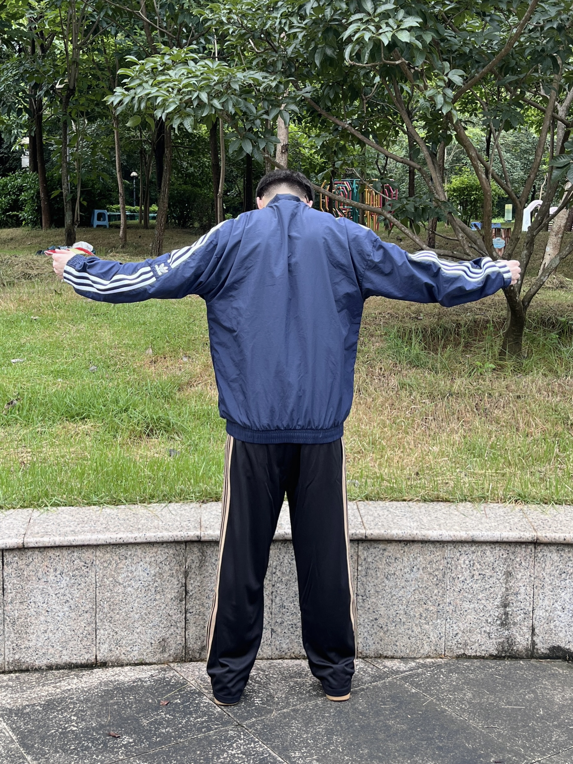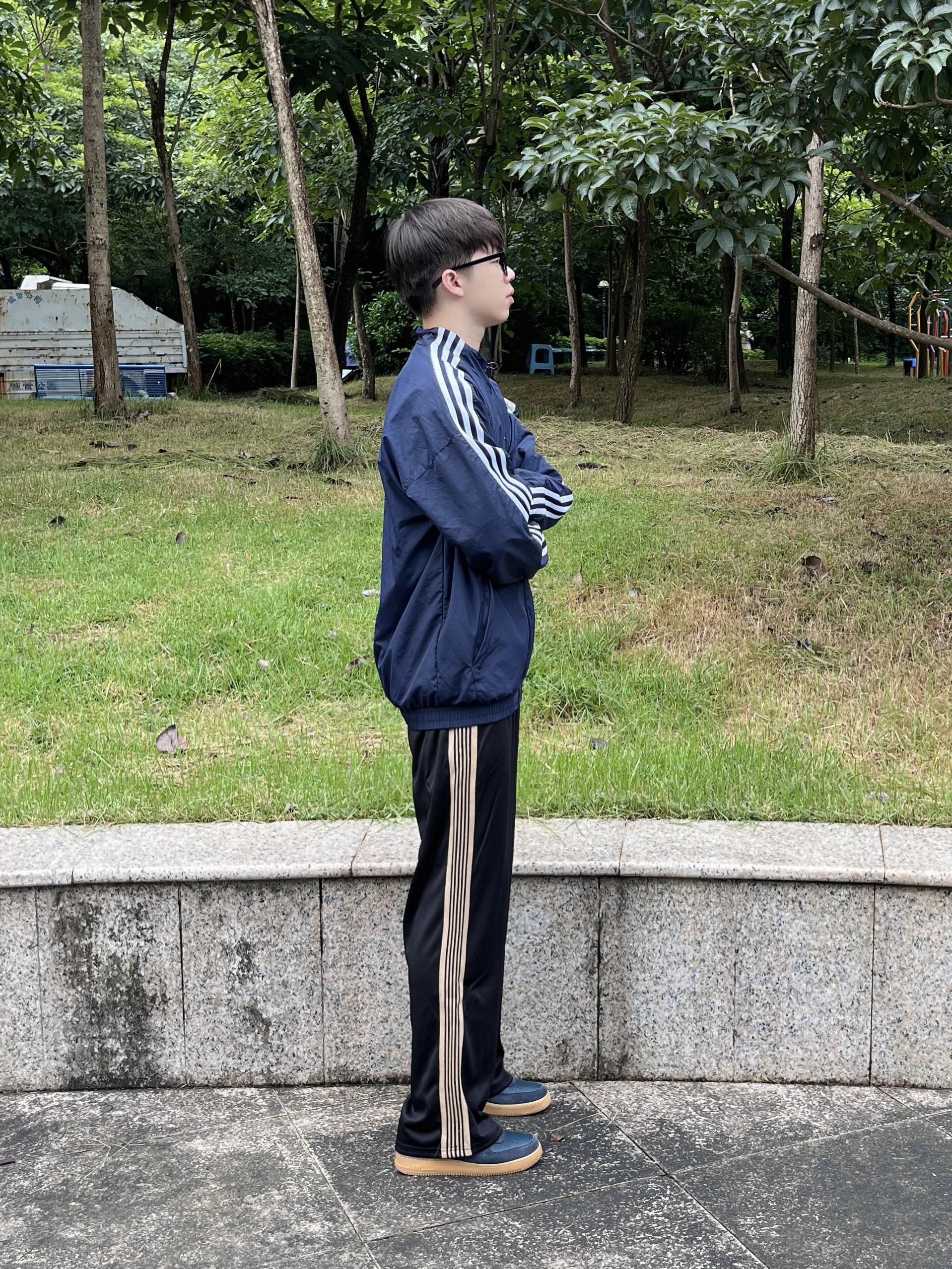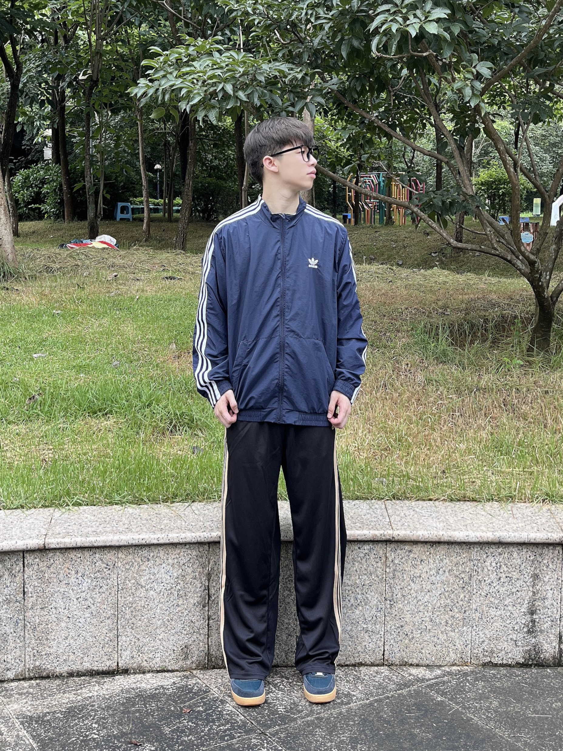 今日份穿搭分享look👀 衣服是藏青色经典阿迪外套👔 搭配 BJHG 的黑色条纹直筒裤👖 颜值美式时尚 撞色织带设计街头风十足 面料舒适透气 上身整体版型也很宽松显腿型🔥 一套搭配下来 户外出街少年感拉满🤩