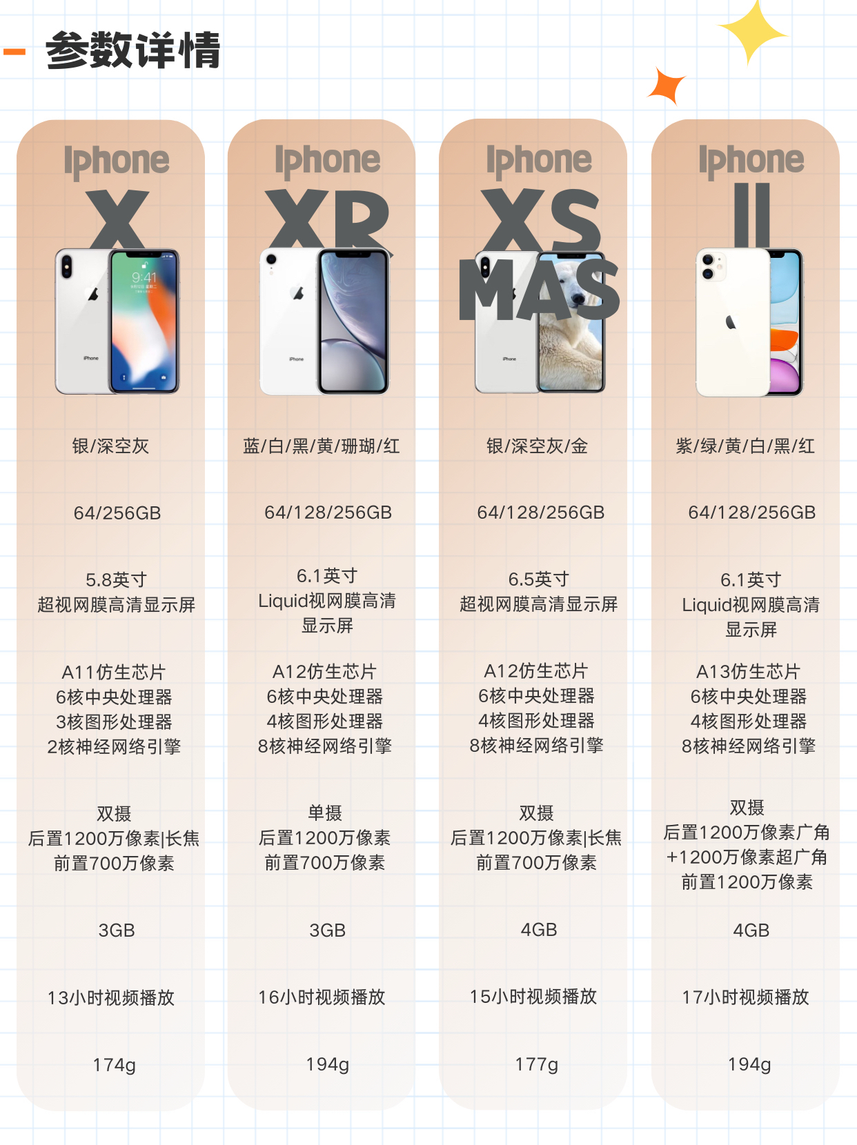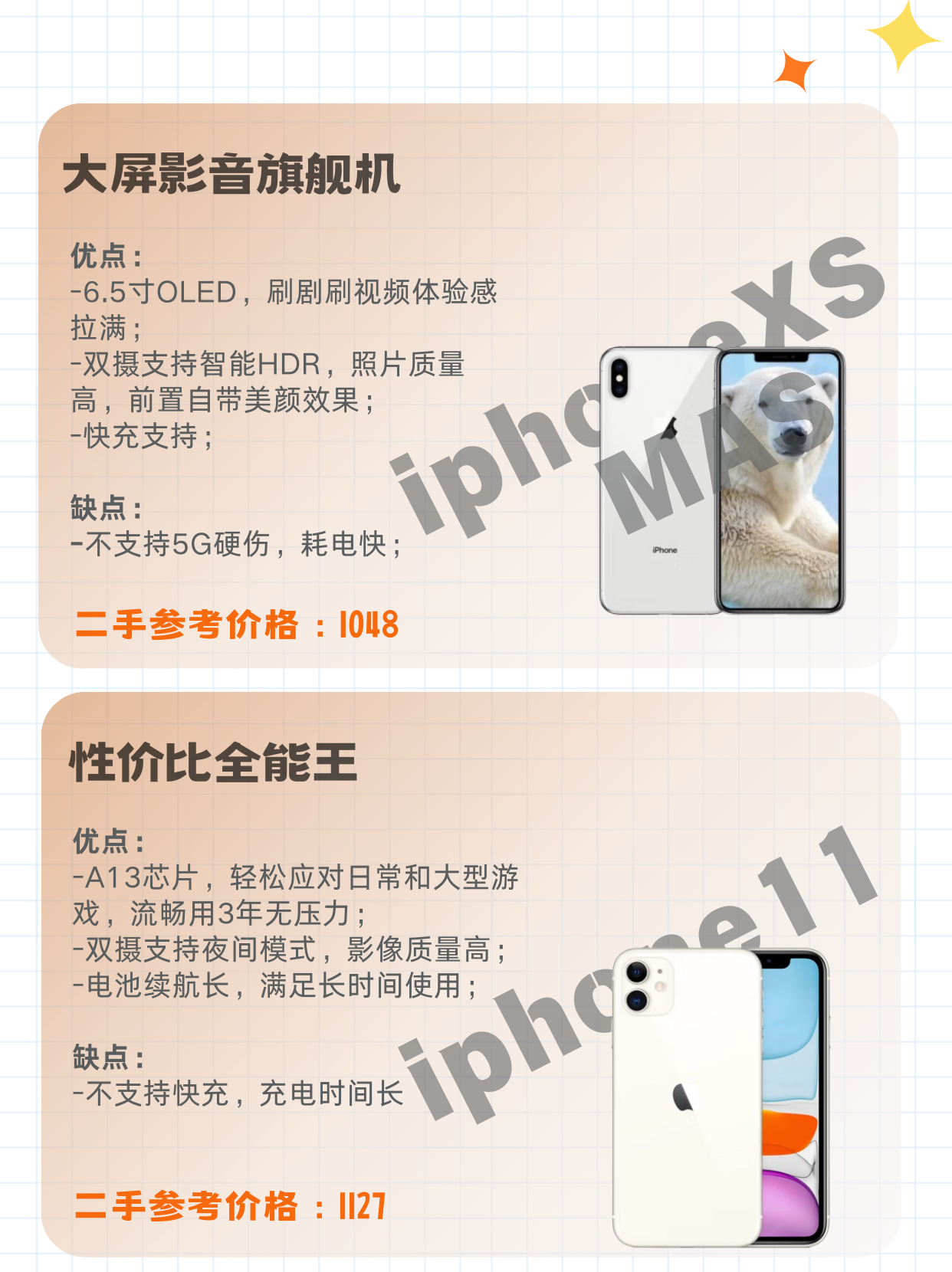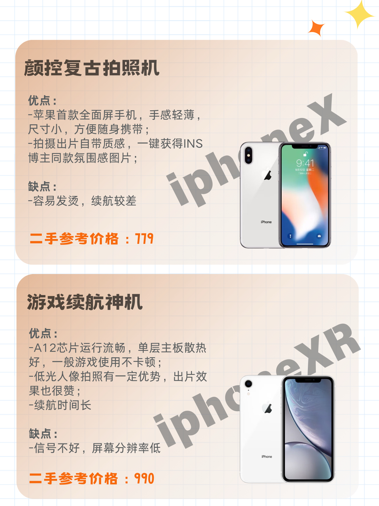 二手iPhone备用机到底选哪款? 📱iPhoneX-颜控复古拍照机 优点: 1️⃣苹果首款全面屏手机,手感轻薄,尺寸小,方便随身携带; 2️⃣拍摄出片自带质感,一键获得INS博主同款氛围感图片; 缺点: ❕容易发烫,续航较差 📱iPhoneXR-游戏续航神机 优点: 1️⃣A12芯片运行流畅,单层主板散热好,一般游戏使用不卡顿; 2️⃣低光人像拍照有一定优势,出片效果也很赞; 3️⃣续航时间...