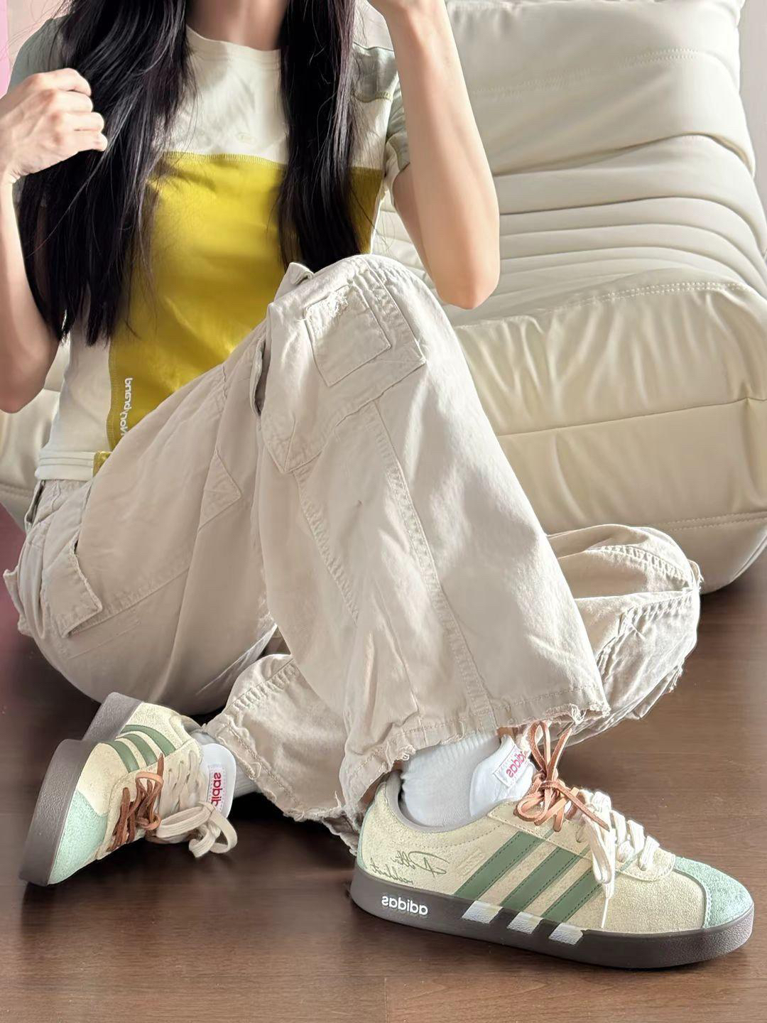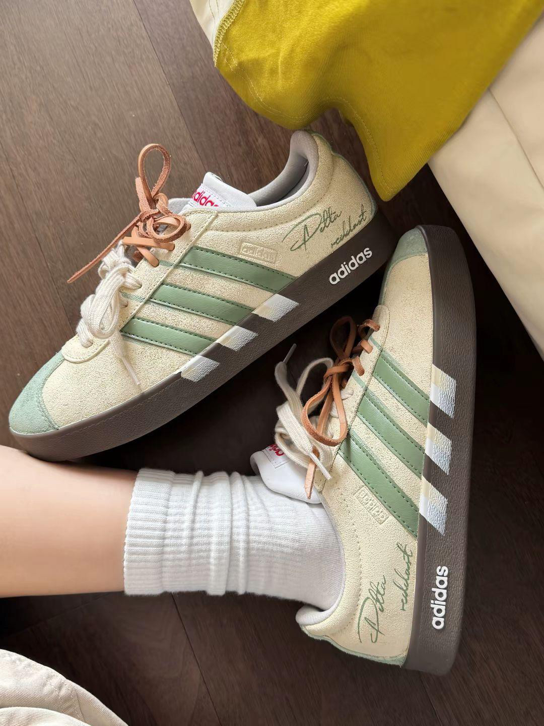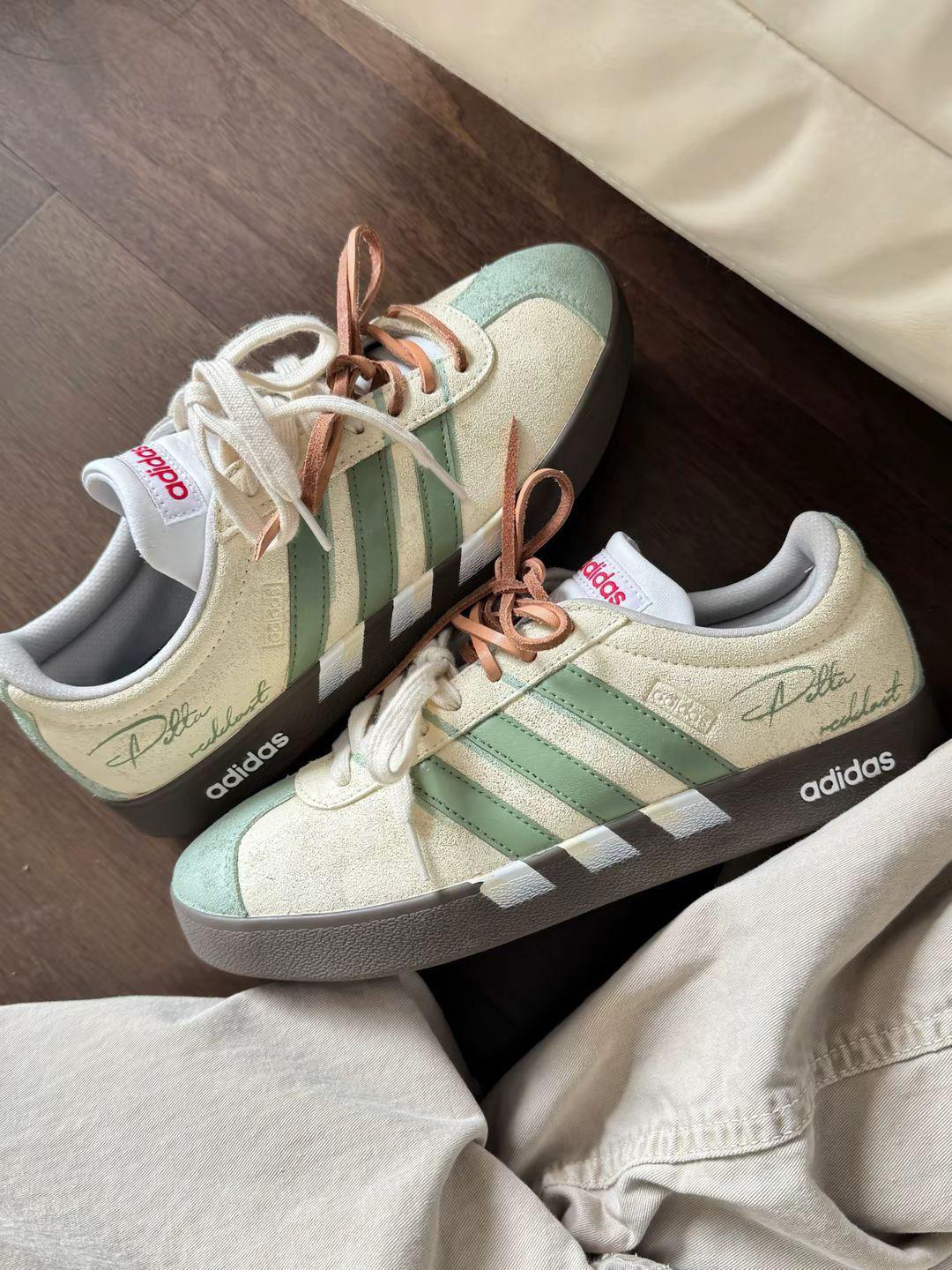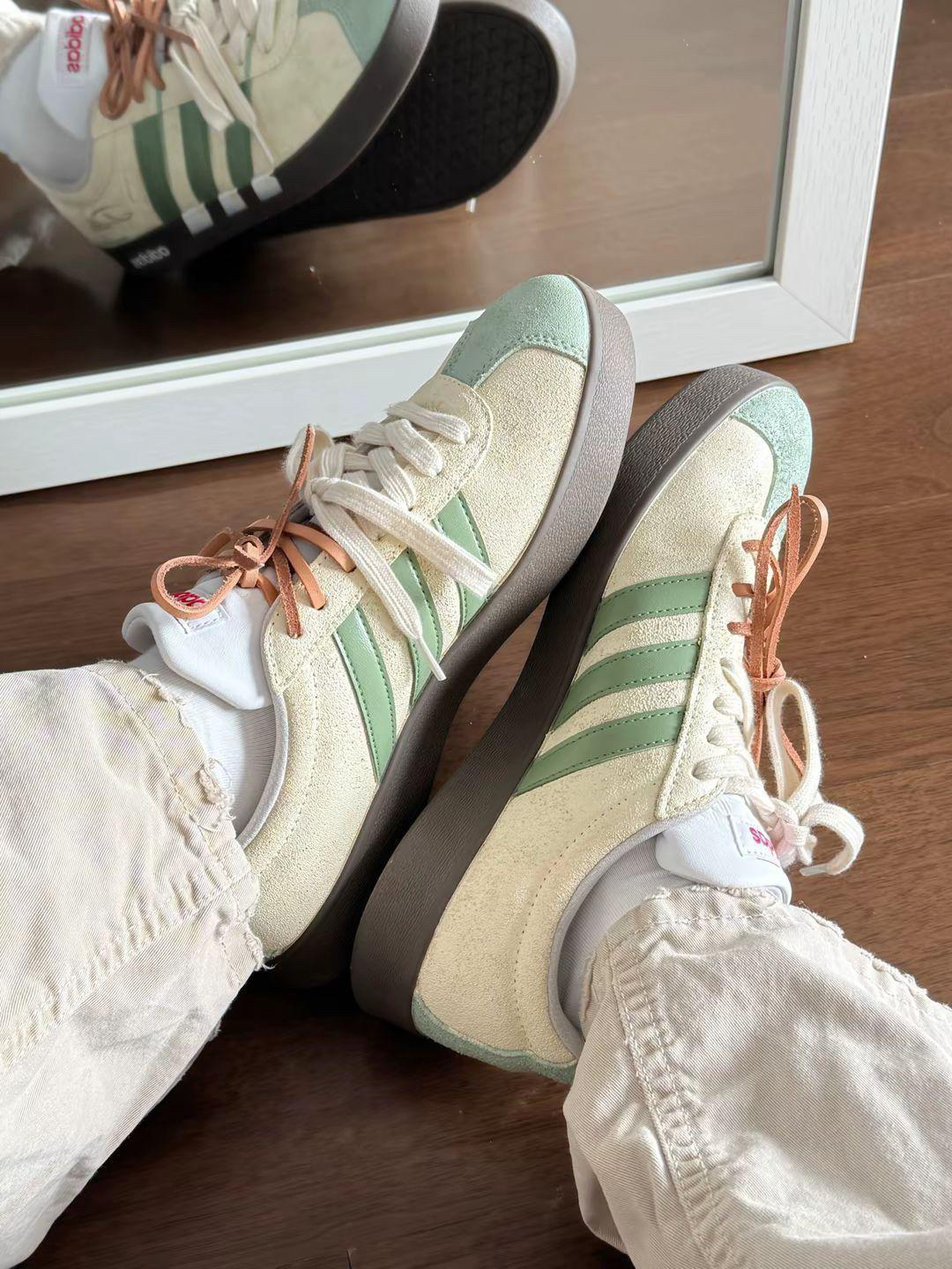 抹茶绿好清新呀 搭配了棕色的双鞋带感觉多了一丝复古感 阿迪court的鞋型还蛮百搭滴 开学的新鞋我已经备好啦 又是有少年感的一天