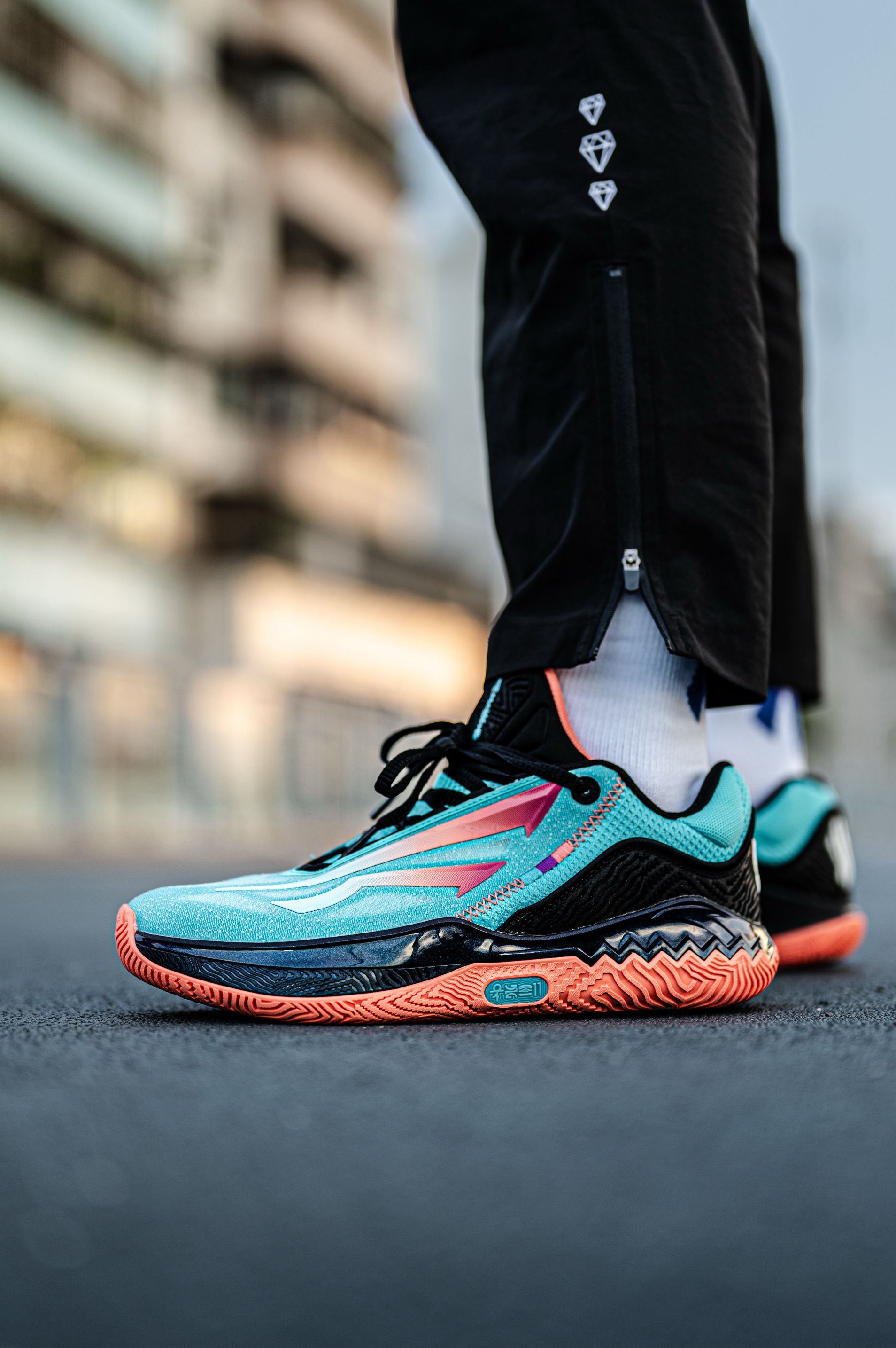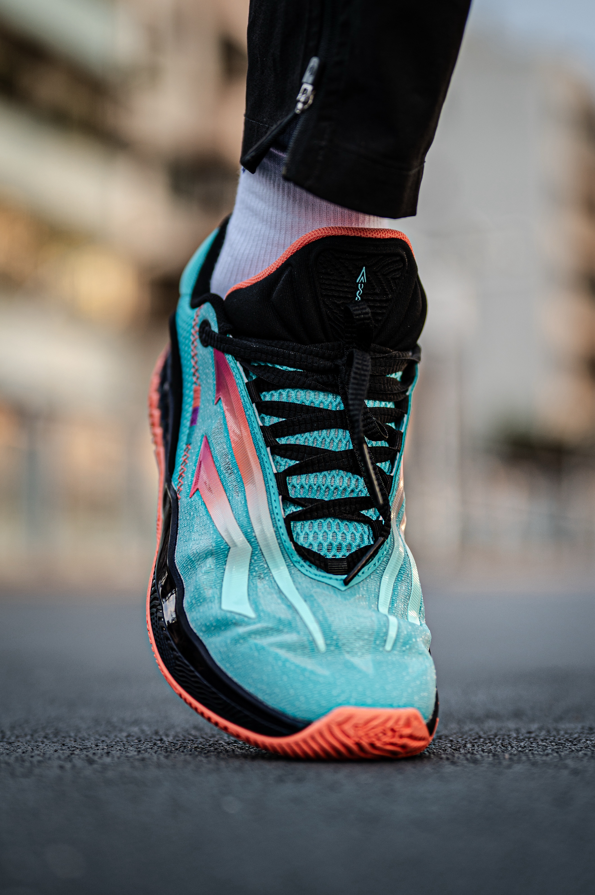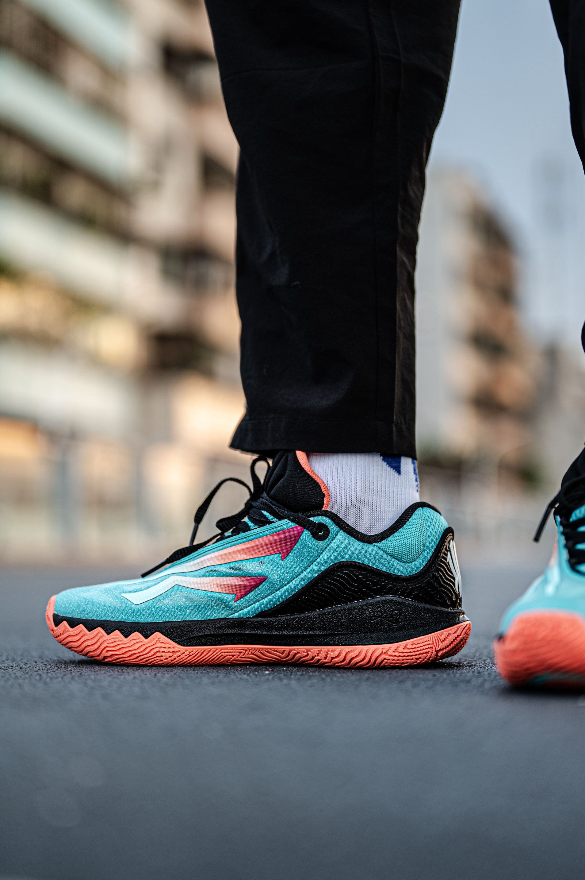 最近穿着这款安踏的KAI SPEED2,我觉得性能和颜值是很能打的,也就是先驱2代,它的性能很贴合后卫变相的打法。 这款晨朦配色采用的蓝黑橙色的结合,颜值是很好看的,而且还耐脏。 大底上翻包边在做极限的大幅度动作能很好控制,全掌A-SHOCK PRO中底,中底脚感是利于突破的韧性。 大底采用的橡胶材质,我认为是很好的兼容内场和外场水泥地的优势。