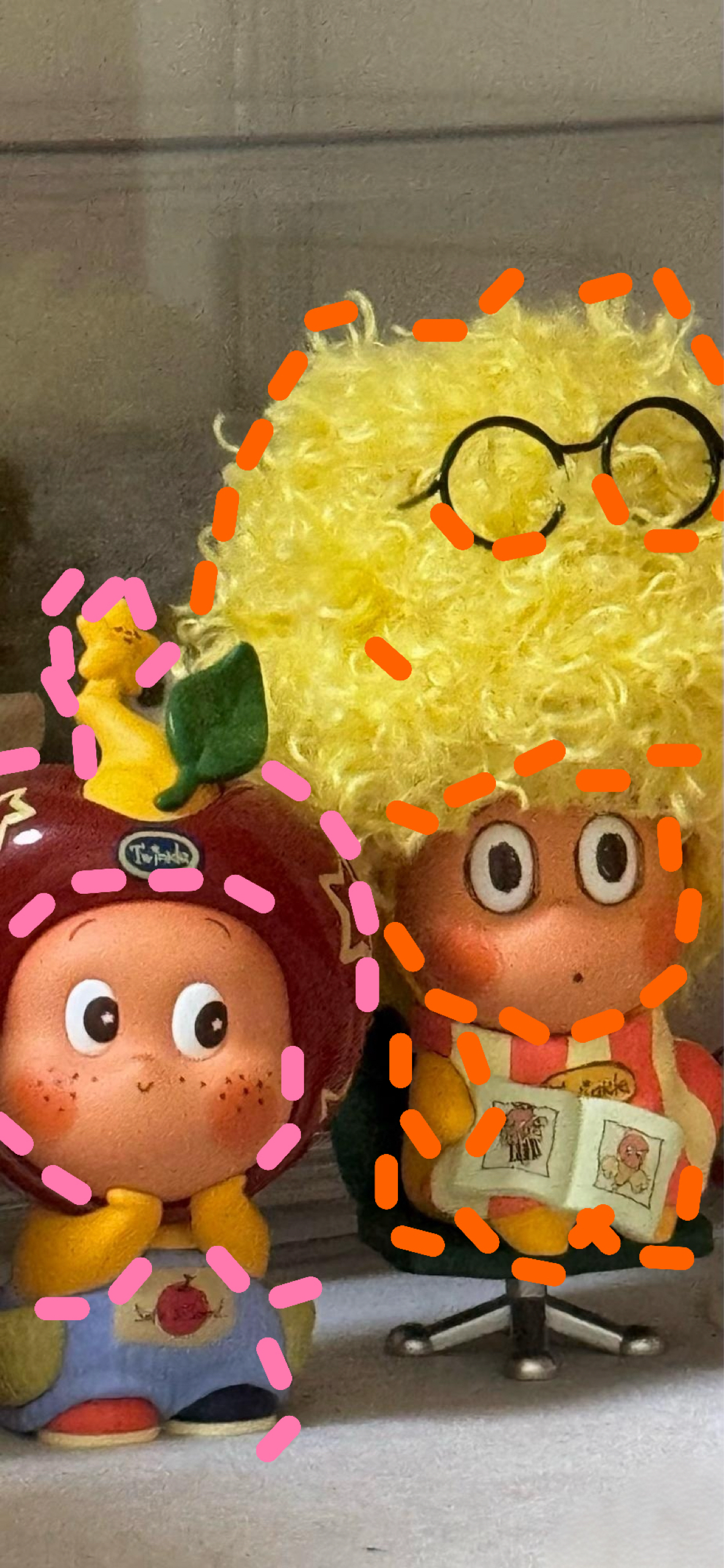 图中是两个可爱的玩偶,左边玩偶头戴苹果造型帽子,身着带苹果图案的蓝裤子,双手托腮;右边玩偶顶着黄色爆炸头,戴着黑框眼镜,穿条纹衣服,坐在转椅上,捧着本有卡通图案的书,模样俏皮有趣 。