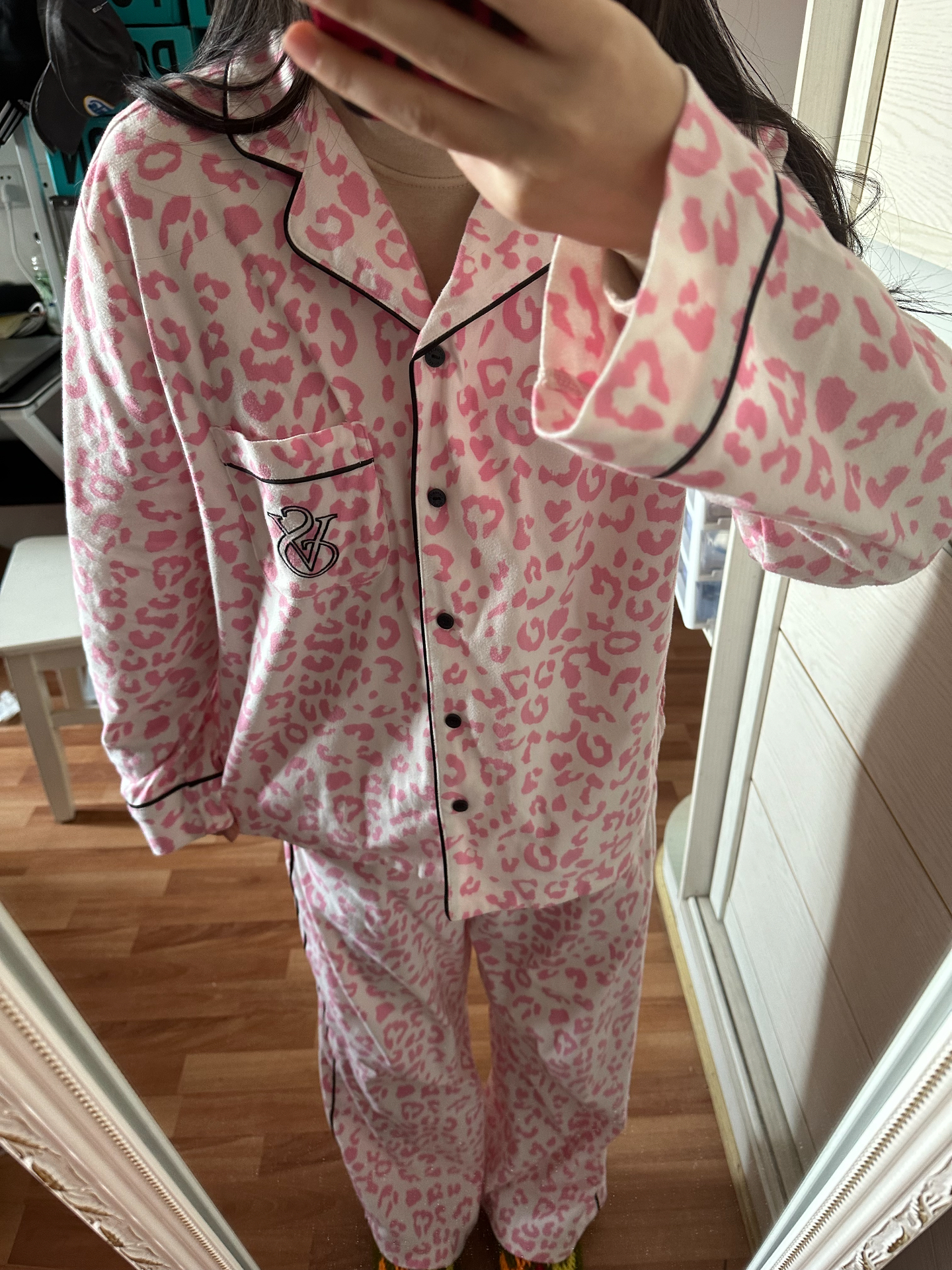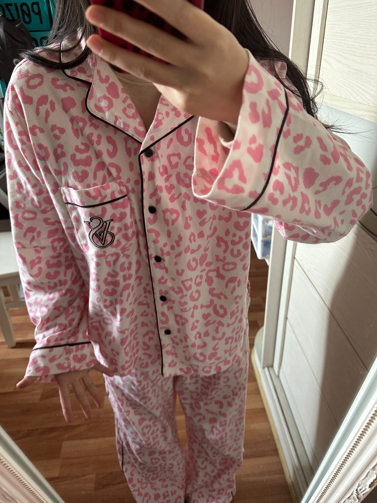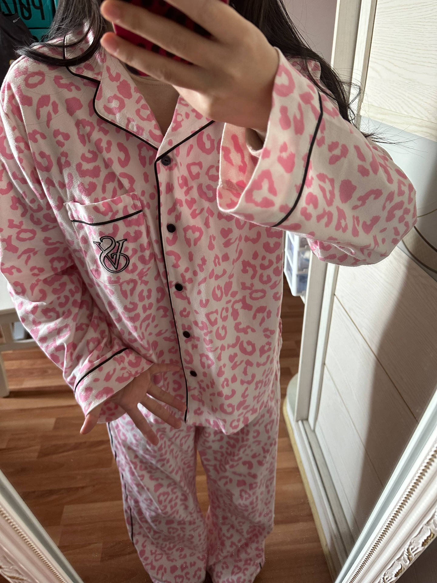 今天上身了新入手的粉红豹纹睡衣💕 颜色好嫩,豹纹不会俗气还很时尚。落肩袖设计很舒服,还有口袋很实用😌。面料是轻舒绒,触感柔软,春天穿正好。 整体还是很爱!