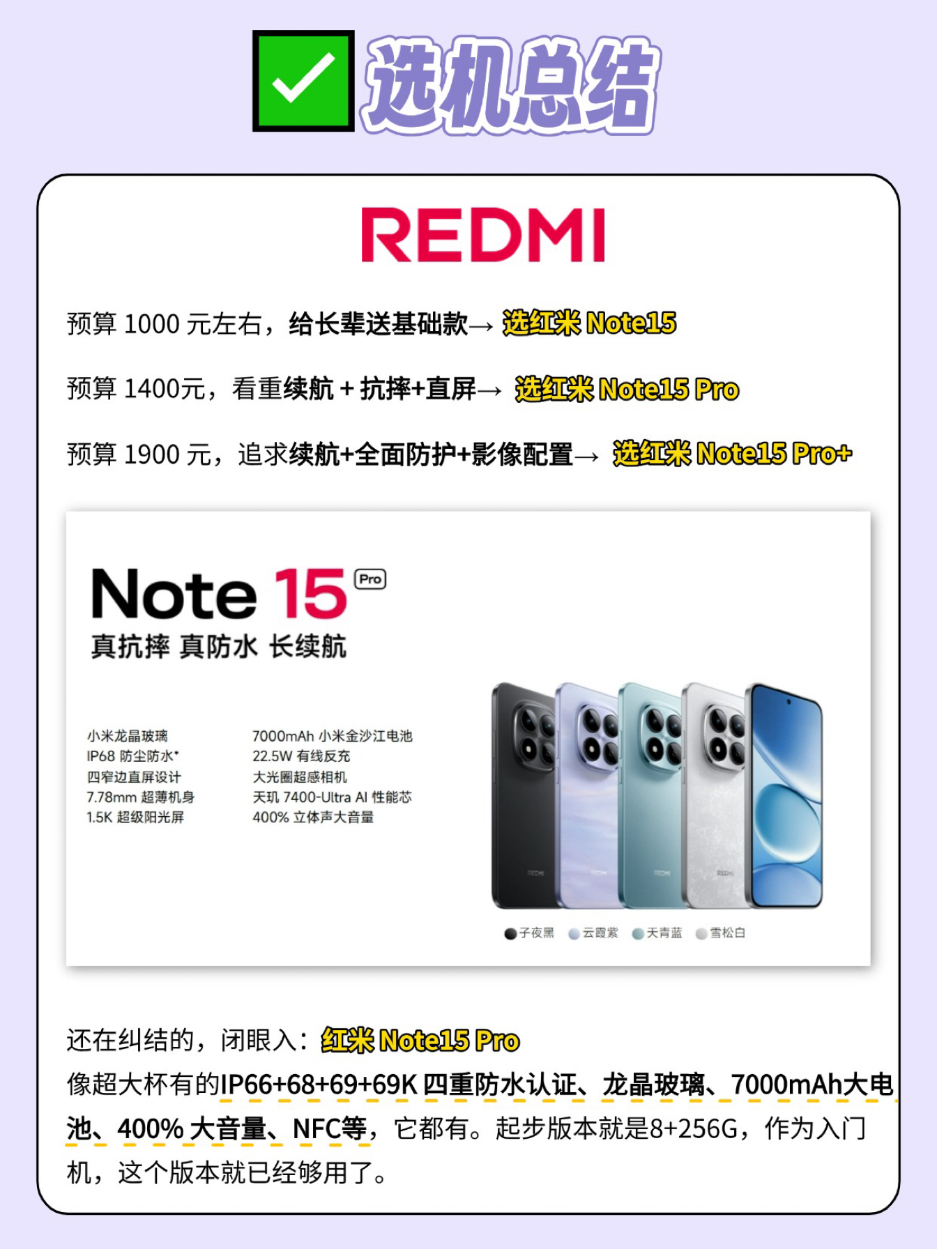 本篇笔记关联了Redmi/红米 Note15 Pro 5G 手机 火山口悬浮Deco IP68旗舰级防水 22.5W反向充电 龙晶玻璃 十倍抗摔 云霞紫、Redmi/红米 Note 15 Pro+ 5G 手机 第四代骁龙7s 7000mAh 龙晶玻璃 支持防抖 实况 防水 长续航 新一代小金刚 全网通 天青蓝、Redmi/红米 Note15 5G 手机 防水防尘 轻薄 红外遥控 星辉白等商品,为用户提供真实的使用体验和购买参考。