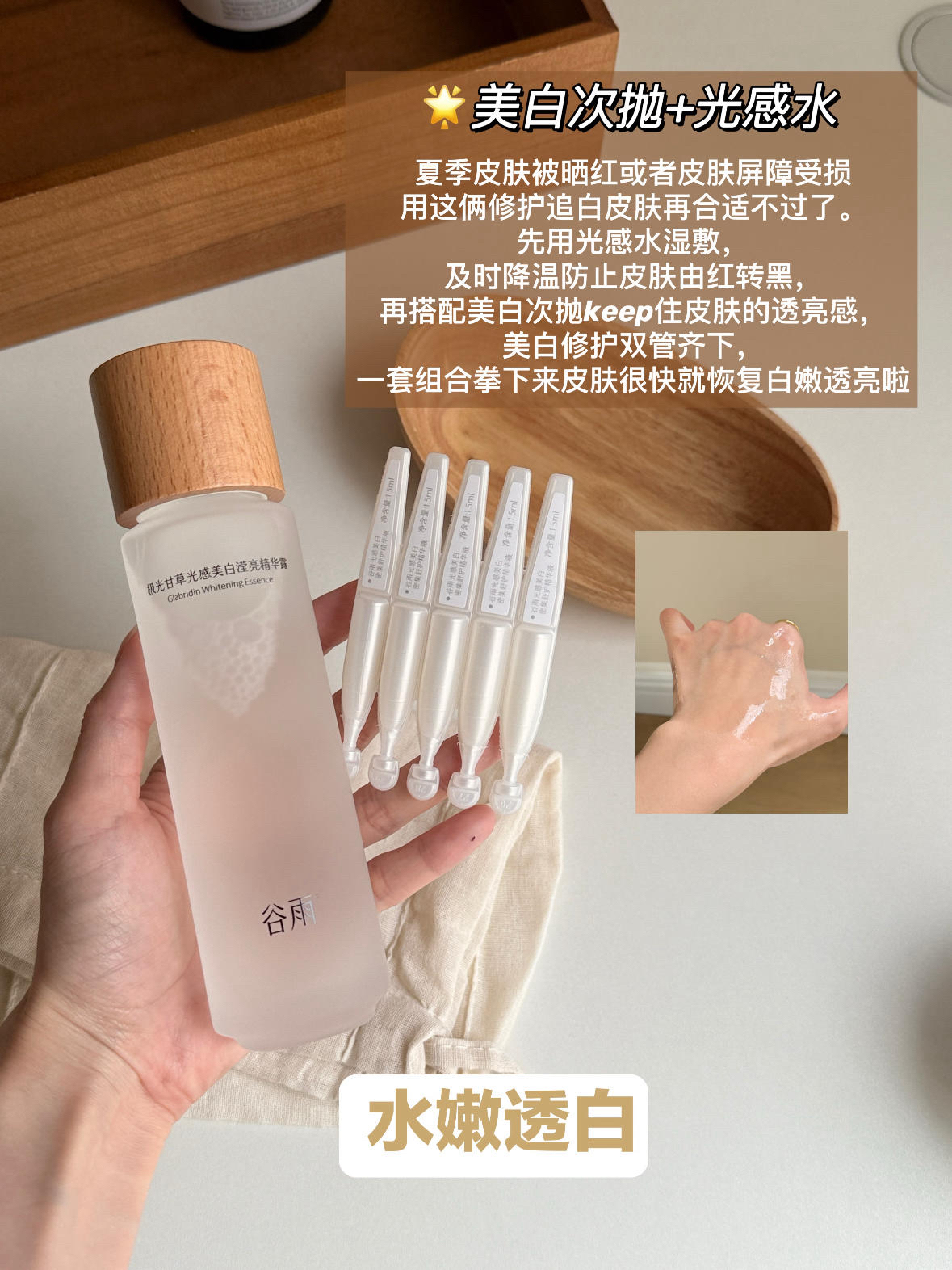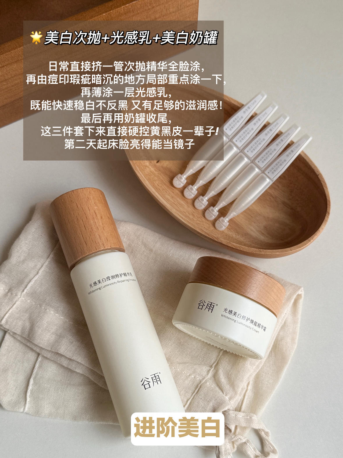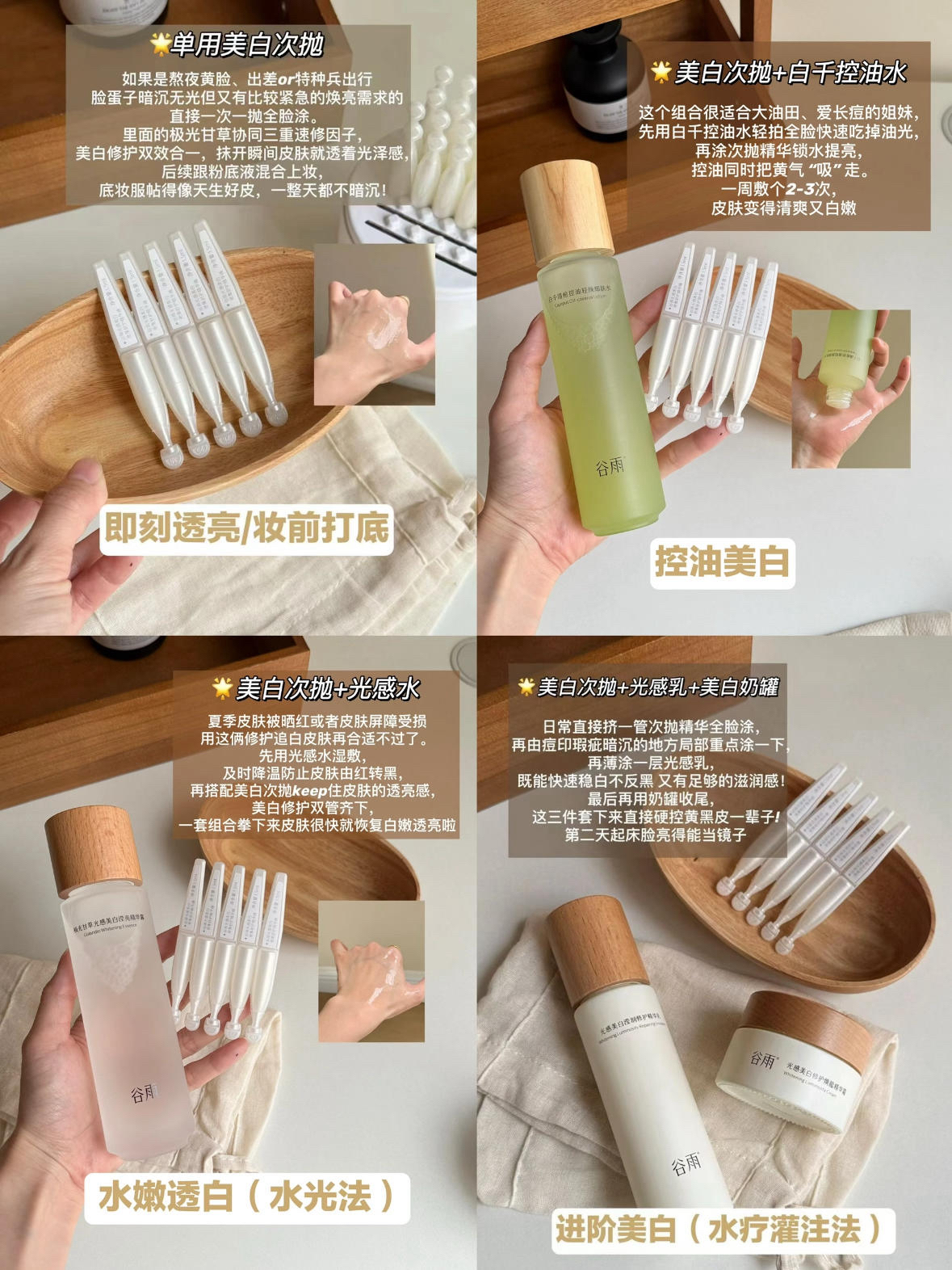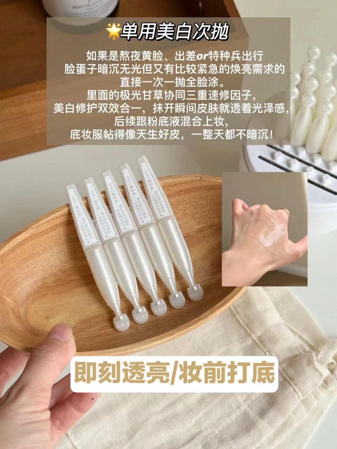咱也算很会挑美白产品一女的! 最近淘到谷雨家的美白次抛!感觉没怎么推但真的很好用! 是那种能白,而且有修护效果的! 最近化妆包里常揣几只来做即时提亮和妆前打底,皮肤真的会变得超级透亮! 搭配它们家其他爆款也超好用!解锁 N 种亮肤玩法这4 种的搭配攻略请往下看~ 1️⃣即刻透亮/妆前打底:单用美白次抛 如果是熬夜黄脸、出差or特种兵出行脸蛋子暗沉无光但又有比较紧急的焕亮需求的直接一次一抛全脸涂。里...