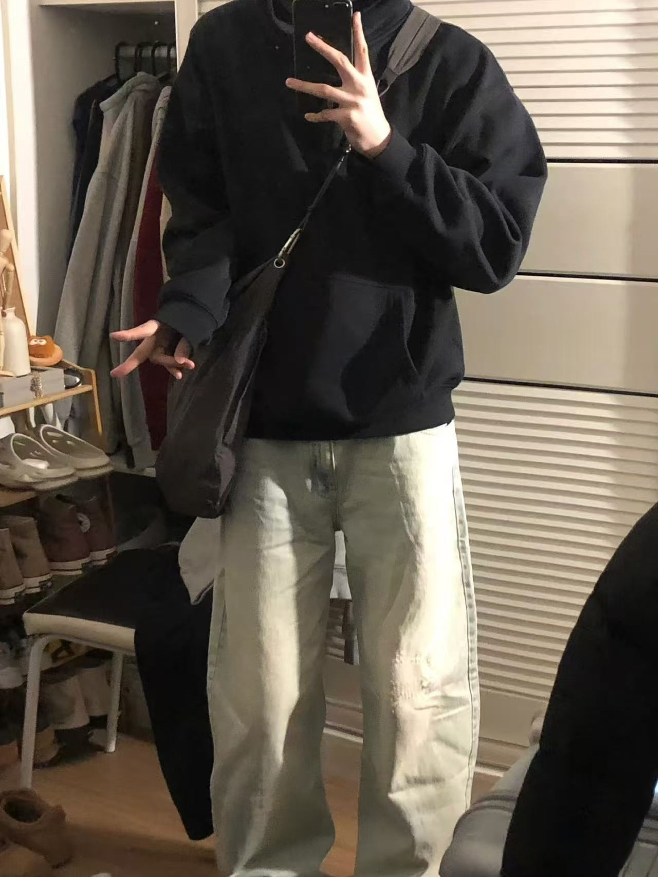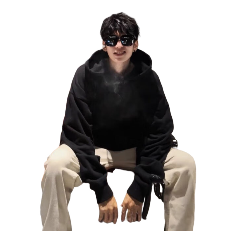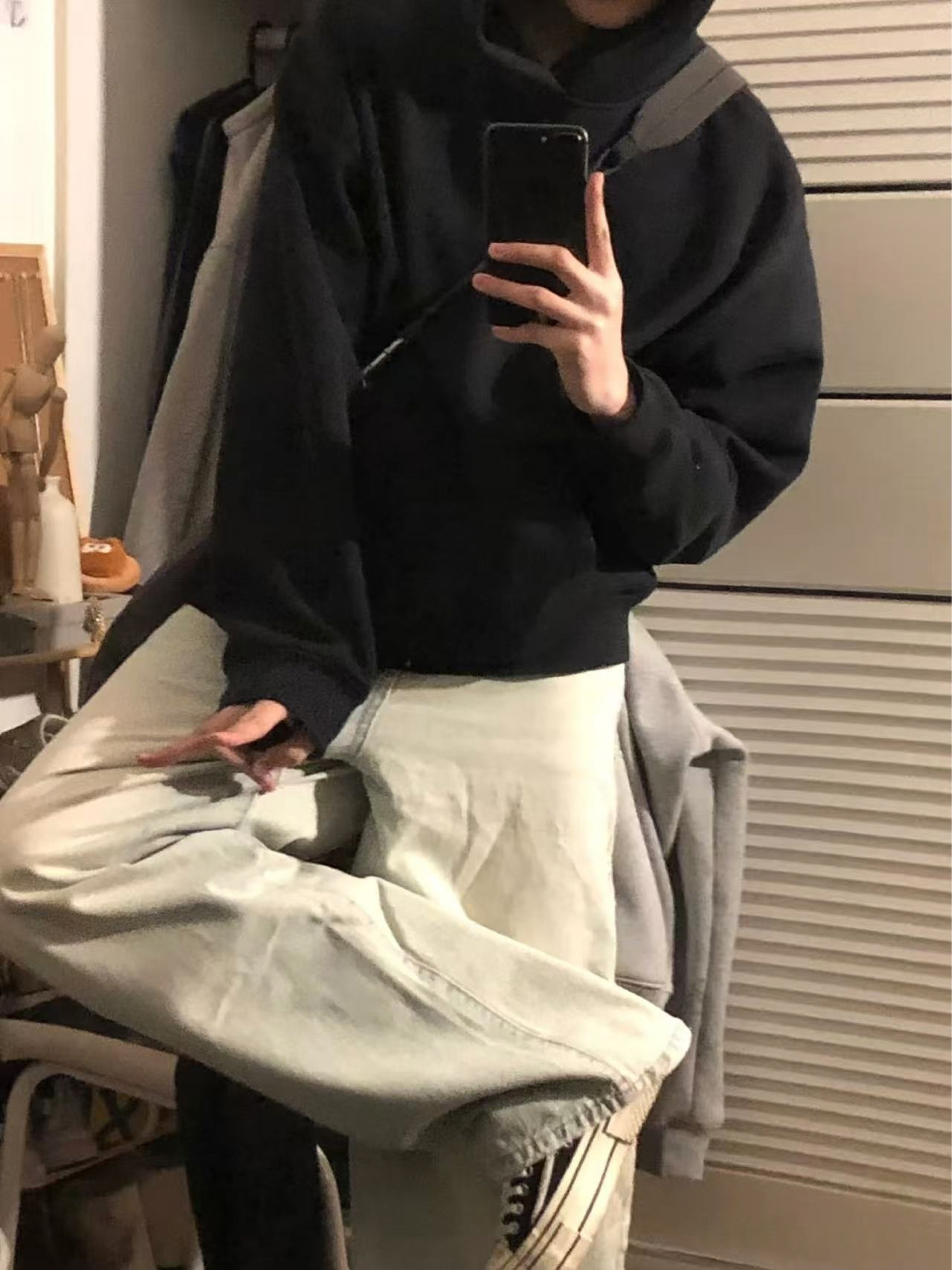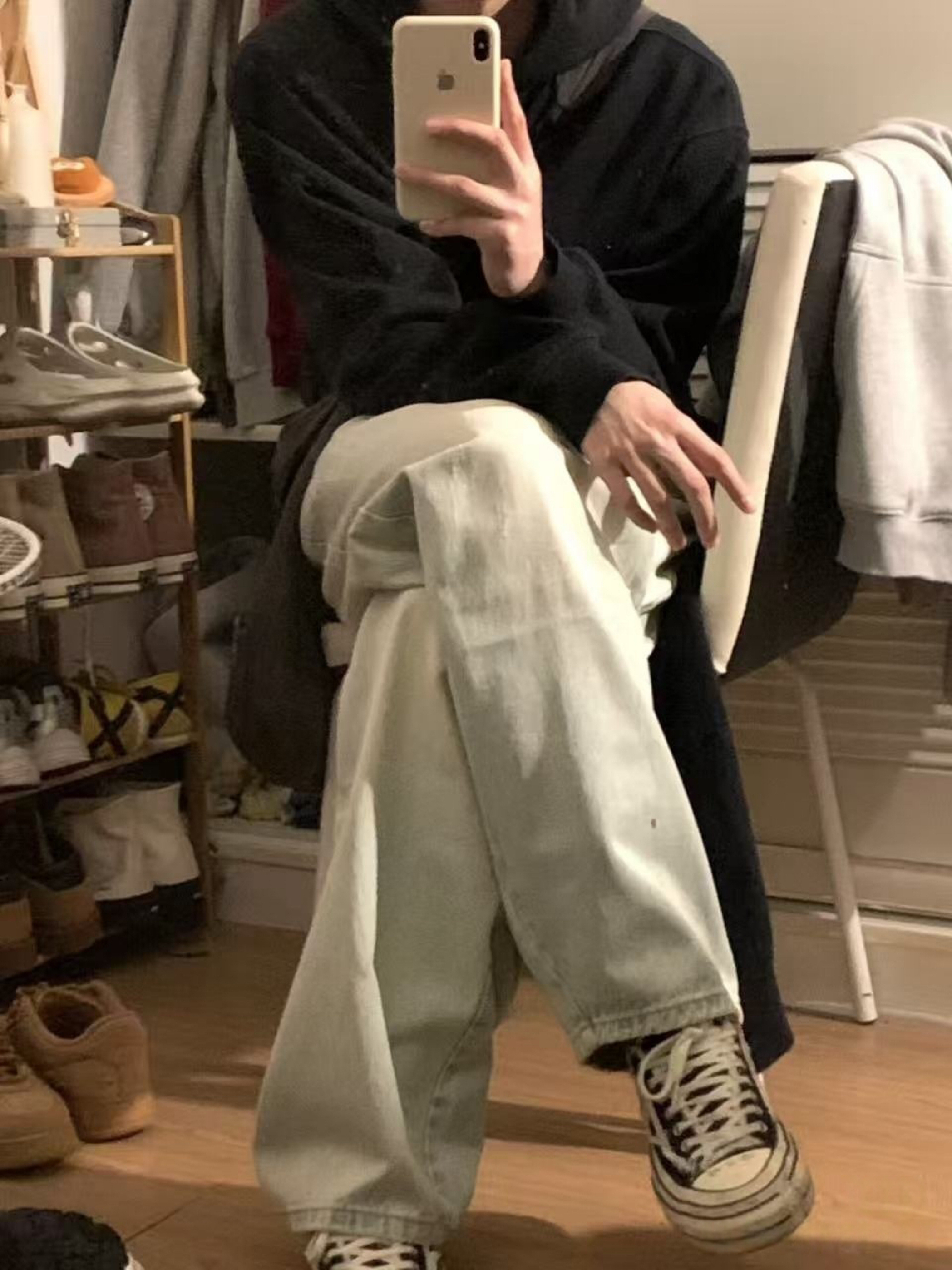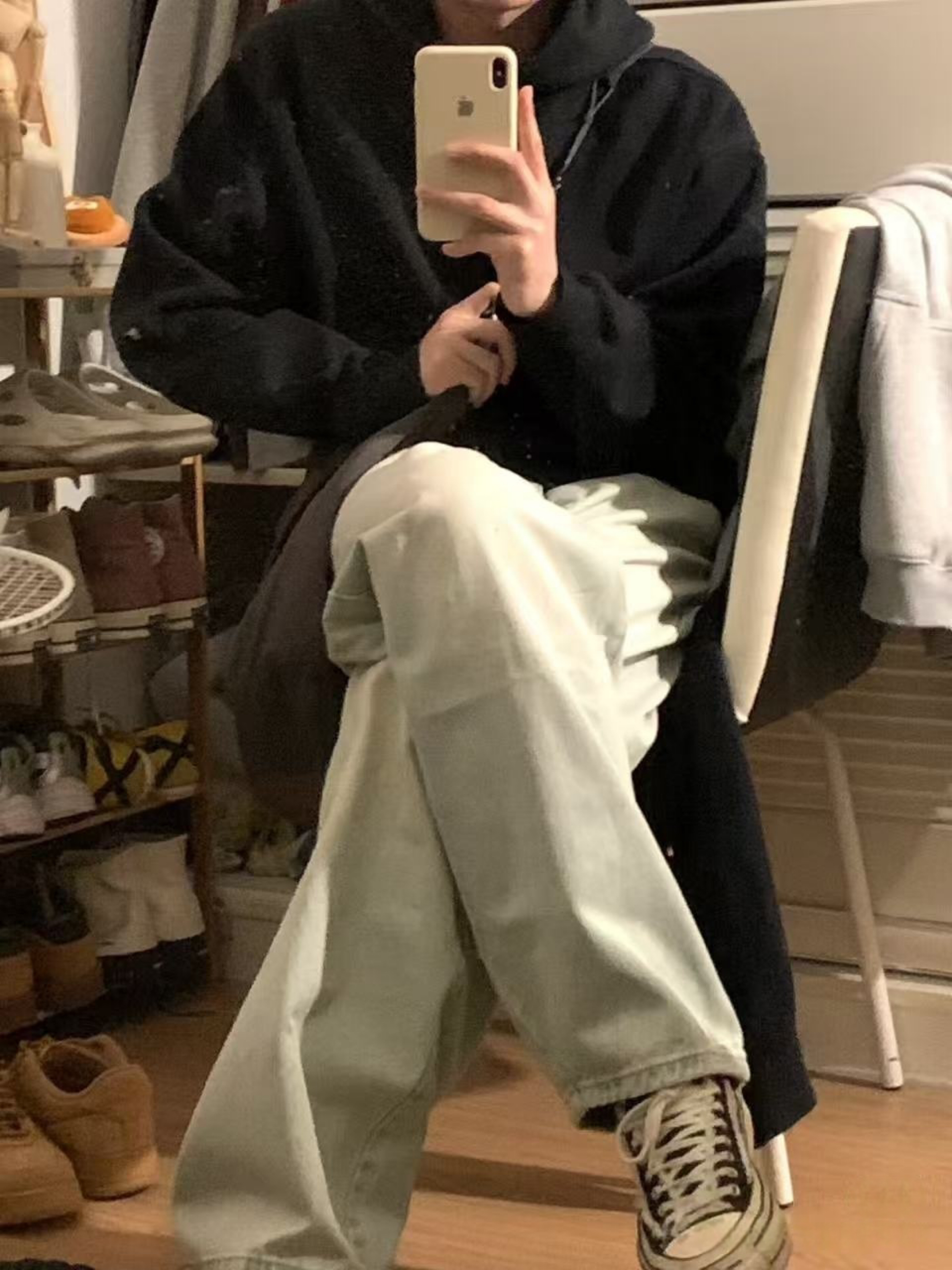 今日份韩系慵懒风上线💯 黑色连帽卫衣简约又百搭,宽松的版型营造出随性的氛围,搭配浅色牛仔裤,干净利落。再踩上一双经典的黑白匡威, 坐在椅子上自拍,每一张都散发着韩系少年的慵懒气质,日常出街这样穿,回头率超高!