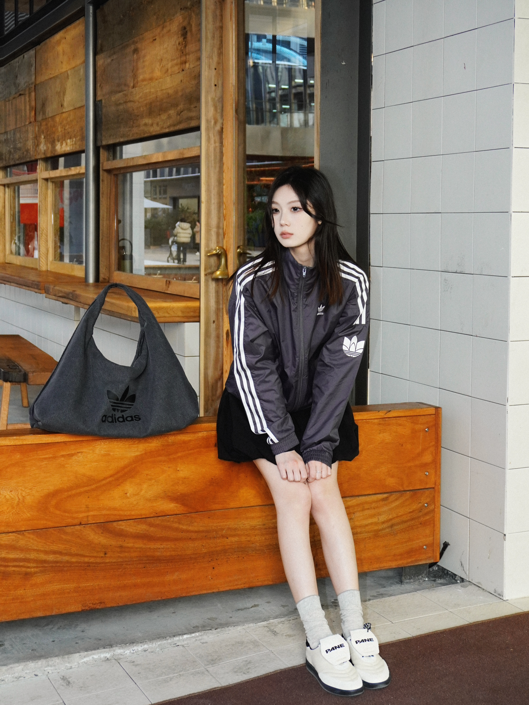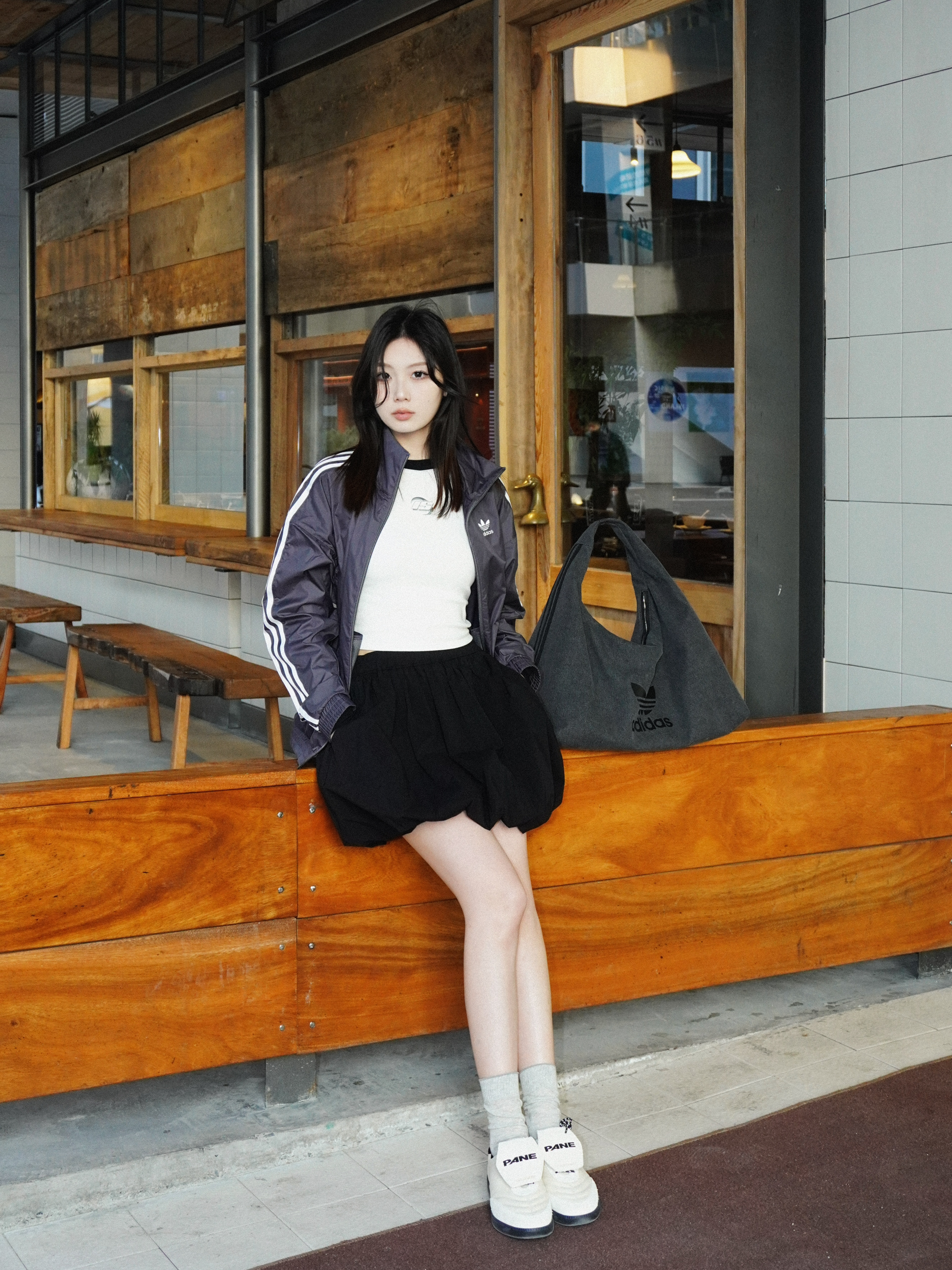 慵懒休闲里带着甜酷氛围感 一套直接拿捏住初秋的街头氛围感!! 外套是adidas经典灰白条纹夹克 防风材质太适合忽冷忽乱的初秋啦~ 侧边三条纹经典又显瘦 运动风中带点飒气 黑色蓬蓬裙和运动风外套意外超配!!👗 蓬松的裙摆平衡了上衣的休闲感 注入一丝俏皮和少女气息~ 黑灰配色经典又不失层次 一套搭下来就是又甜又酷的街头少女🎀