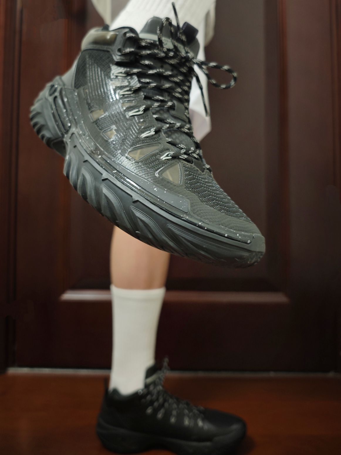 不管它叫“黑天鹅”还是什么,在我眼里,这样的配色一律叫“黑武士”。 这是一双外形偏粗犷设计的球鞋,但实际鞋子很轻,脚感软弹,甚至灵活性也不错。完全没有外观所表现出来的那种笨重感。上脚的视觉效果也是比拿在手里要好看很多。 但既然有如此的外观设计,那是不是说明这双鞋是适合外场的球鞋?实测下来确实如此!缓震、防滑、包裹一样不差,而且高帮的设计很好兼顾了保护性。4开的价位整体性价比也不错,后期应该还会有降...