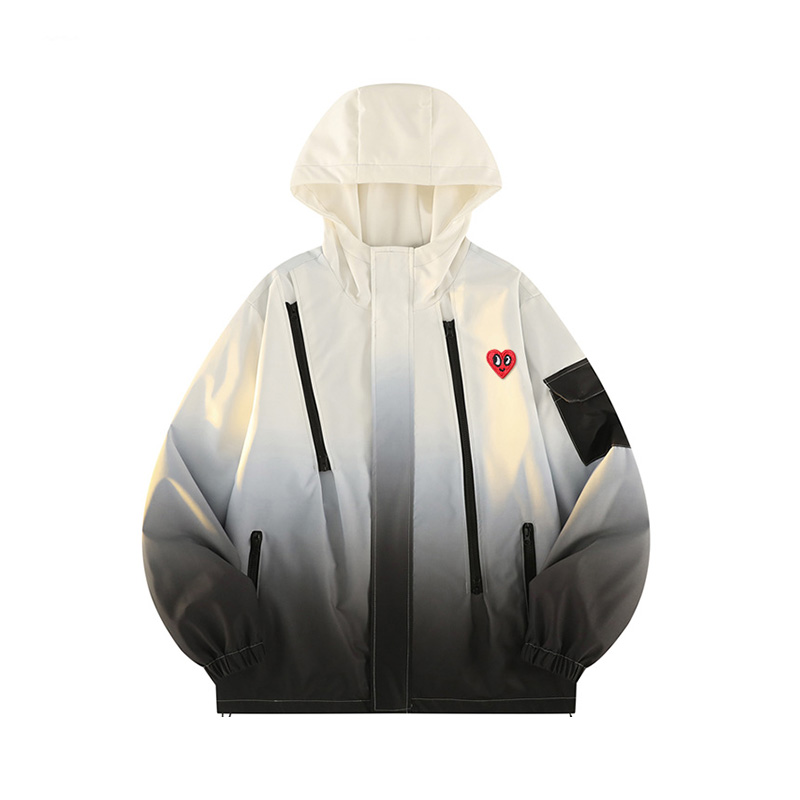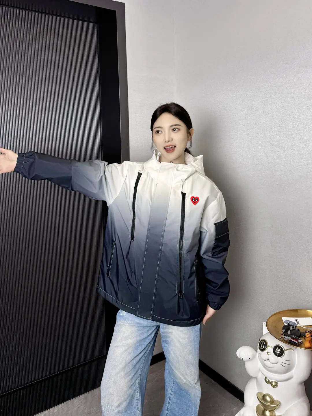 查尔斯桃心你是懂甜酷的!这件深灰到墨蓝的渐变夹克帅到犯规~ 暗色调渐变高级又显瘦,胸前小桃心刺绣低调吸睛,防风防水面料挺括有型,穿起来利落不垮塌