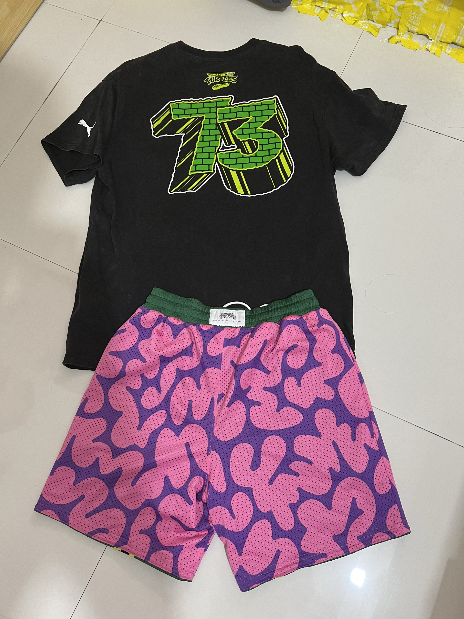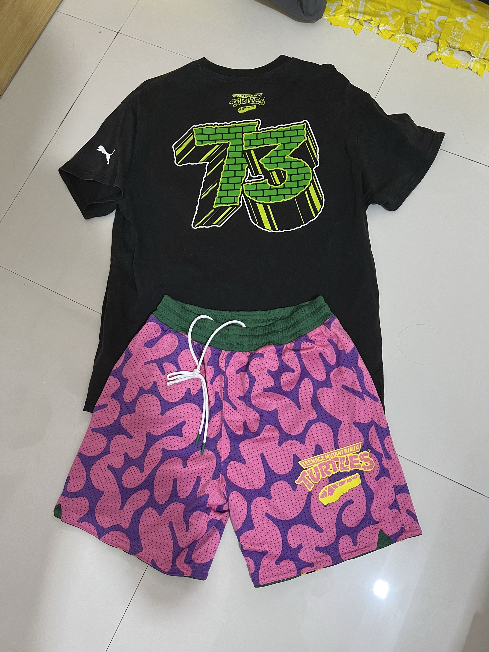 ✅黑色T恤:正面忍者神龟篮球天团超吸睛,“SEWER LEAGUE” 字样搭配砖块纹理,潮酷又有童年感;背面 “73” 数字印花,色彩碰撞超带感,小标细节彰显联名身份~ ✅短裤两款: • 绿色款:网眼面料透气满分,侧边黄黑锯齿纹 + 彪马小标,复古运动感拉满,适配各种夏日场景🏀 • 粉紫款:个性迷彩图案,忍者神龟小标点缀,炸街出街秒变焦点,回头率直接拉满💥 复古情怀与潮流设计完美融合,...