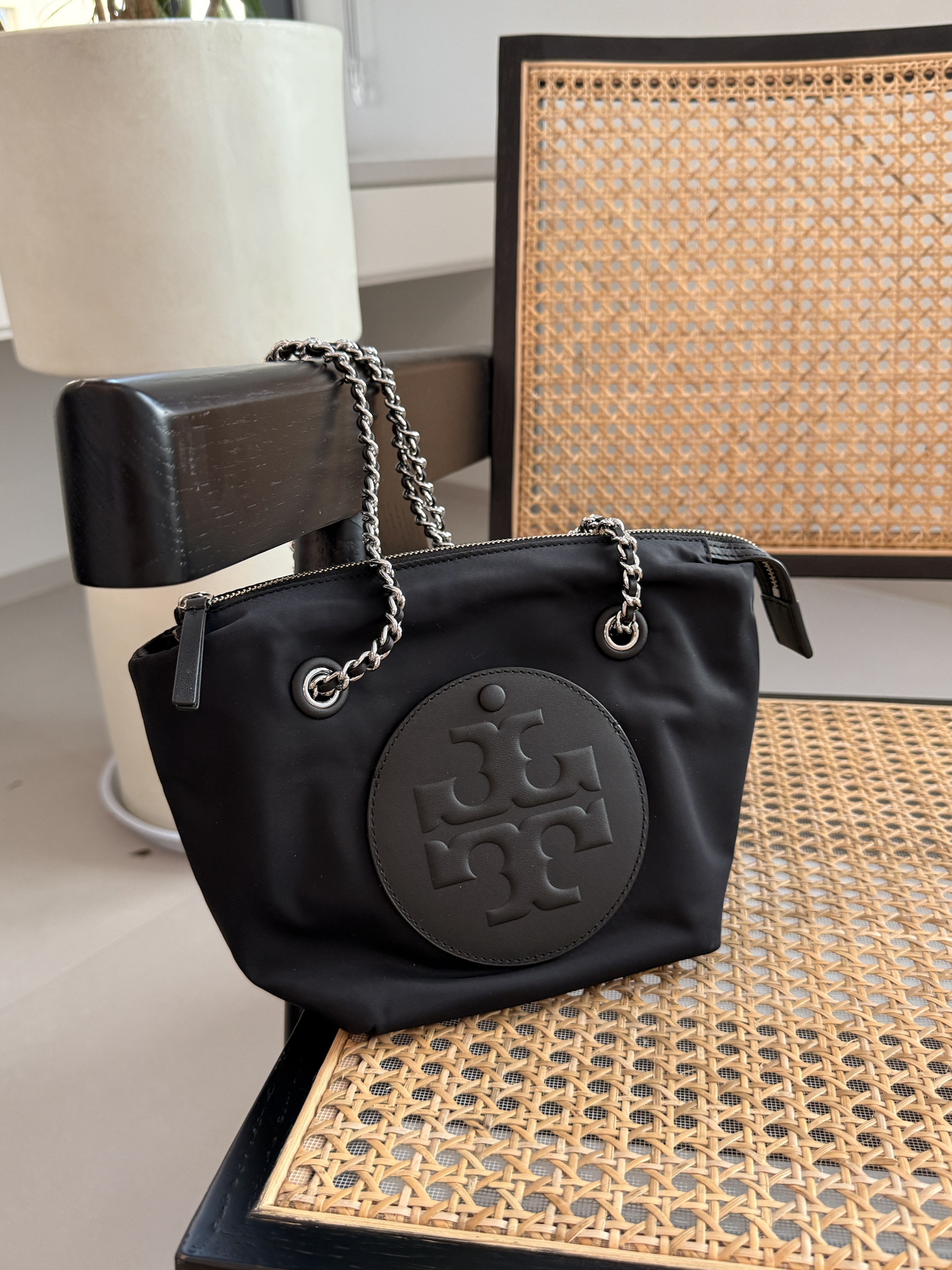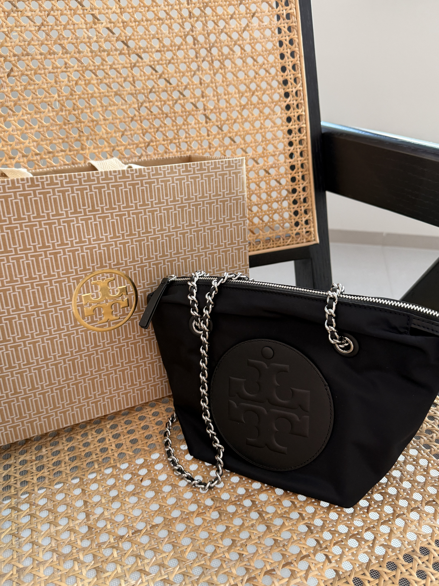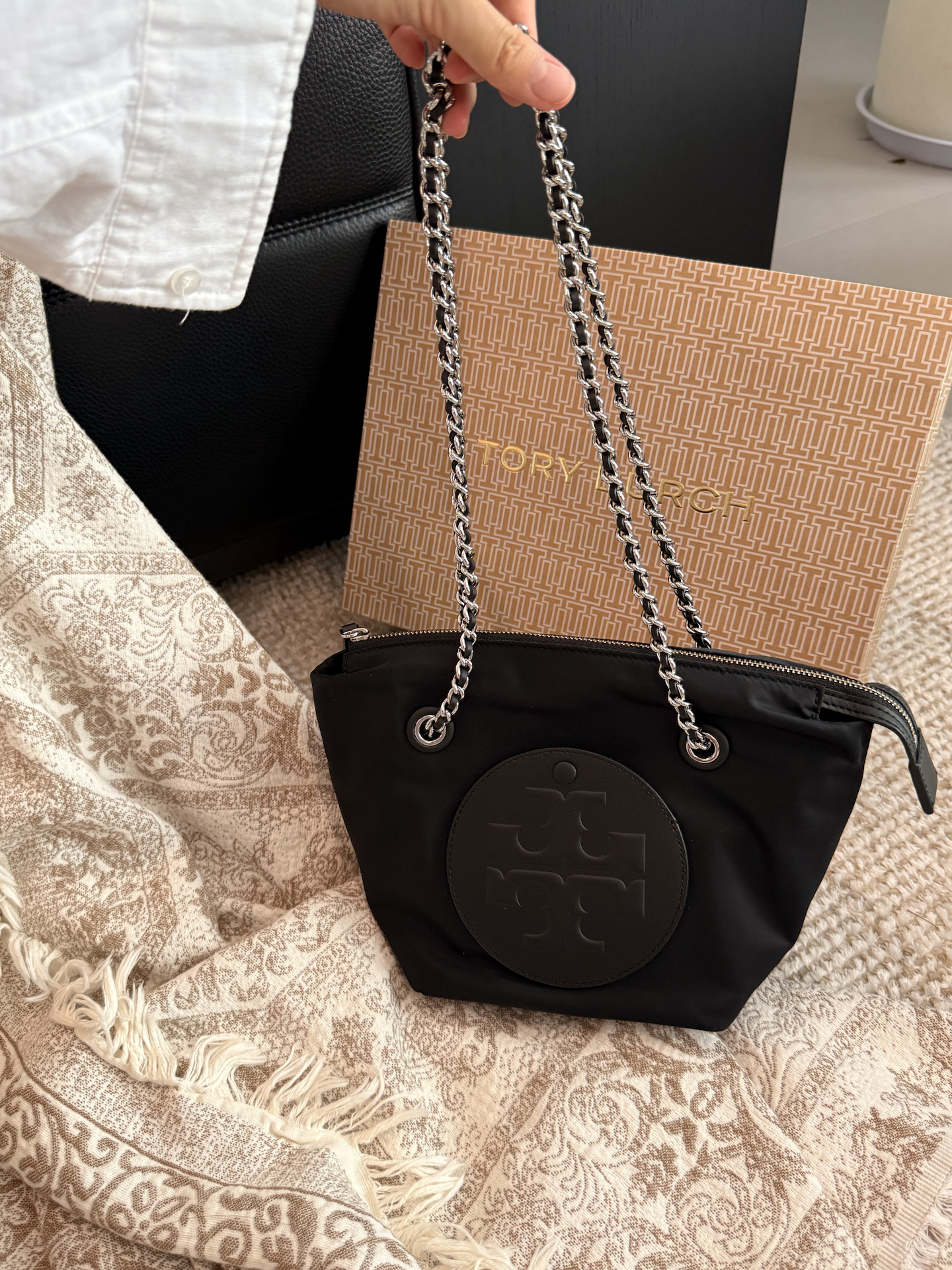 本篇笔记关联了TORY BURCH/汤丽柏琦 ELLA 小号 品牌徽标链带条再生尼龙拉链闭合斜挎包托特包单肩包 黑色等商品,为用户提供真实的使用体验和购买参考。