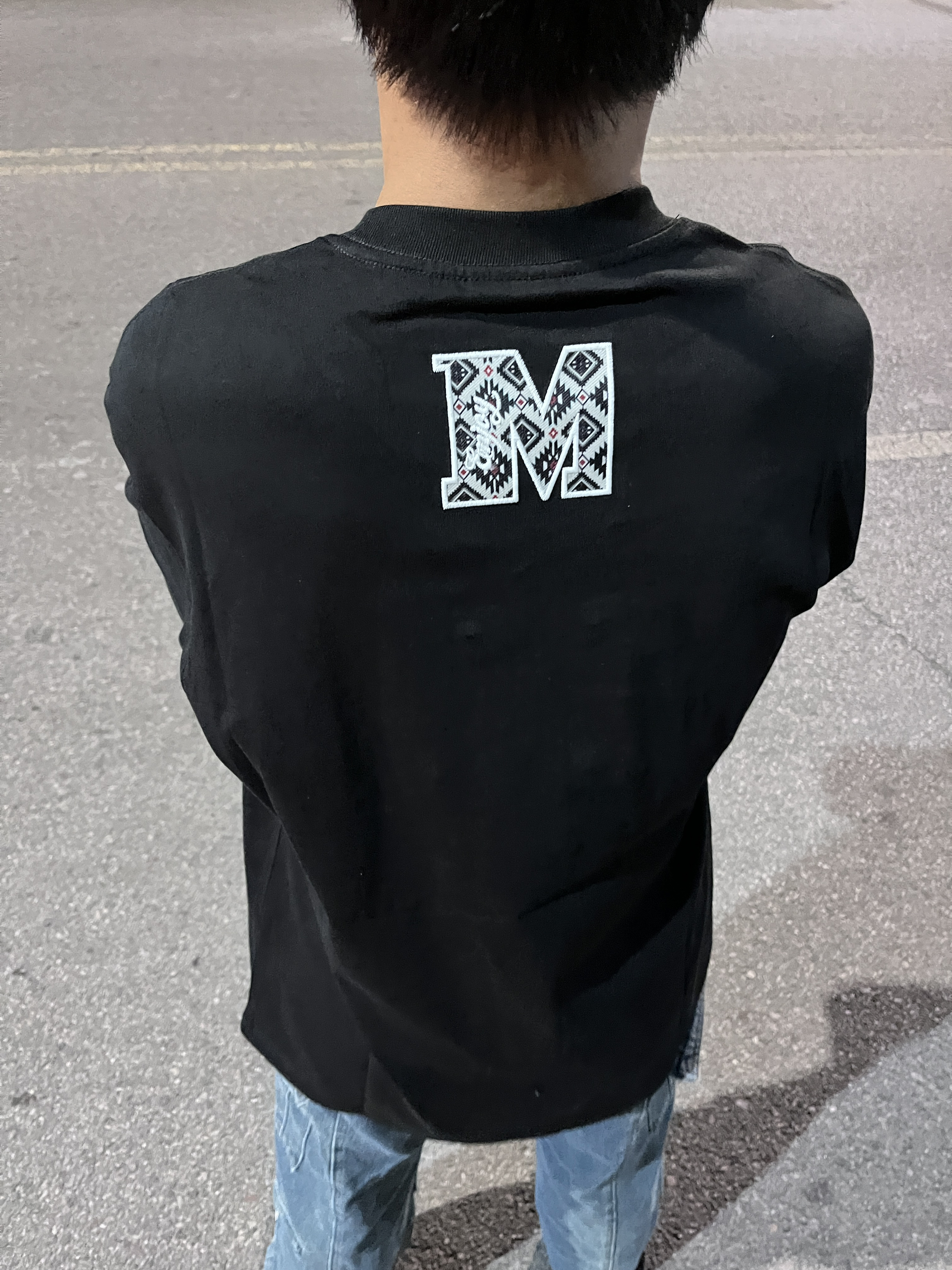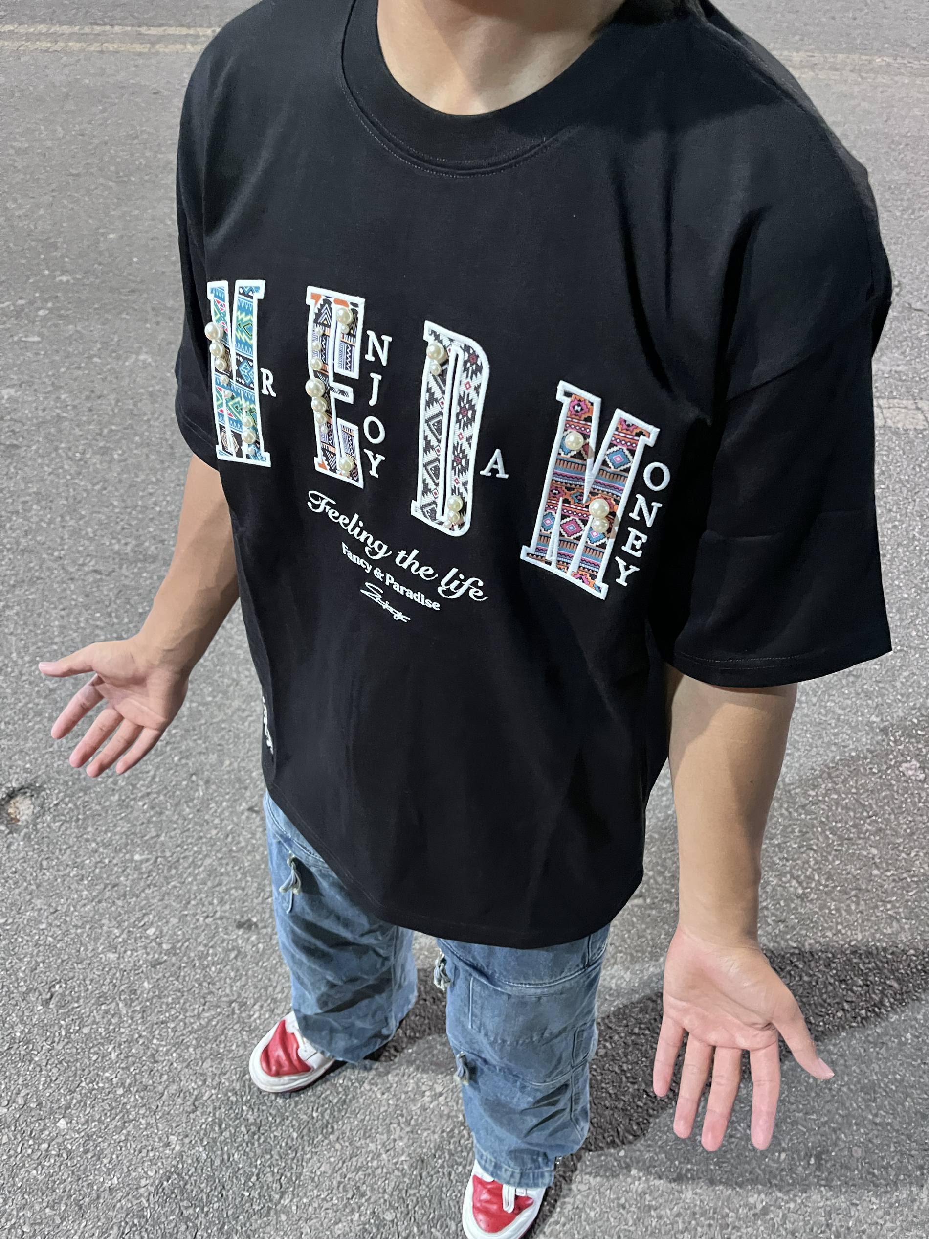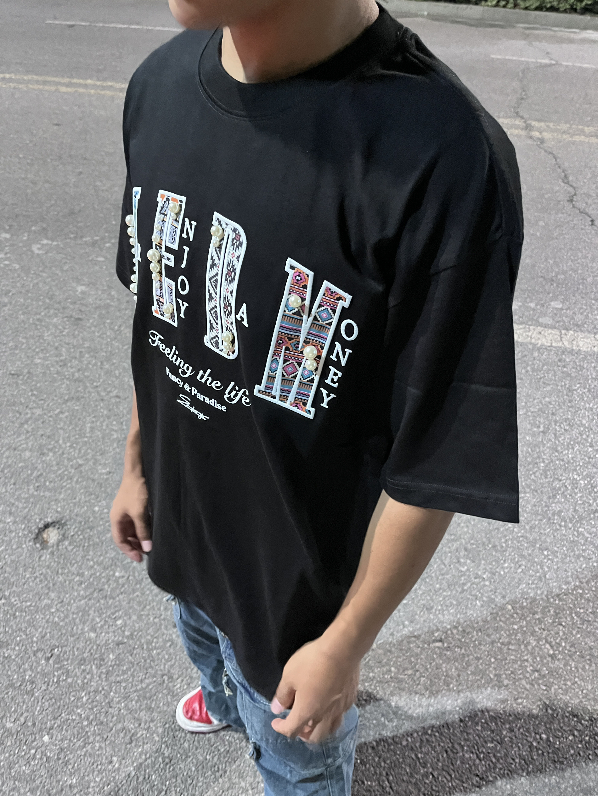 MEDM的珍珠民族风T恤与雪山背景形成鲜明对比 简约干净的夏天穿搭 氛围感一下拿住上身一件黑色短袖T 重磅面料穿起来不会松垮単薄 加上 oversize版型遮肉显瘦不挑身形胸口的小香风填充字母很有设计感下面搭配一条牛仔裤,少年感十足 学生党的百元百搭短袖