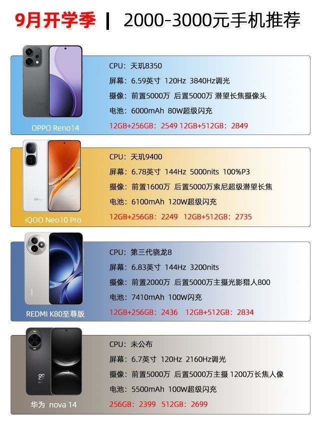 9月开学了,新同学,新学年,新手机,这期跟 大家聊聊2000-3000元区间的手机,相信这8款 手机总有一款适合你。 荣耀400 vivo s30 小米14 一加Ace5至尊版 OPPO Reno14 iQOO Neo 10 Pro REDMI K80至尊版 华为nova 14 对于游戏爱好者来说,可以选择处理器好点 的机型,如第三代骁龙8或天玑9400处理器的, 对于排线的也小伙伴来说,选择人...