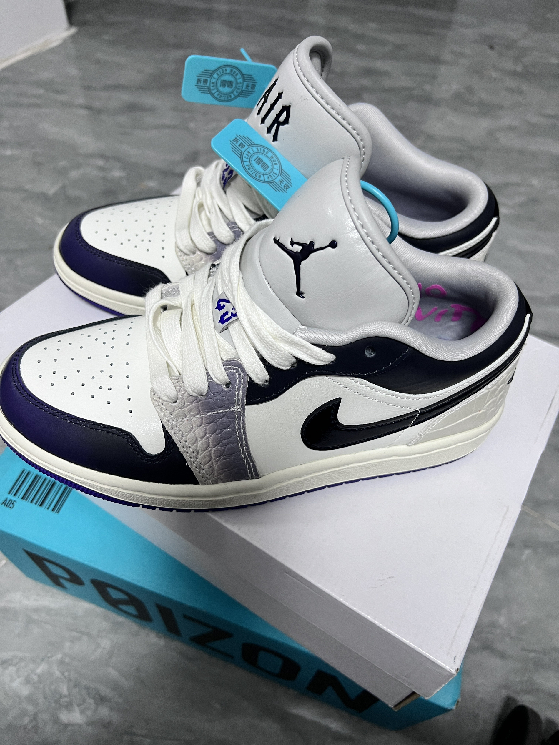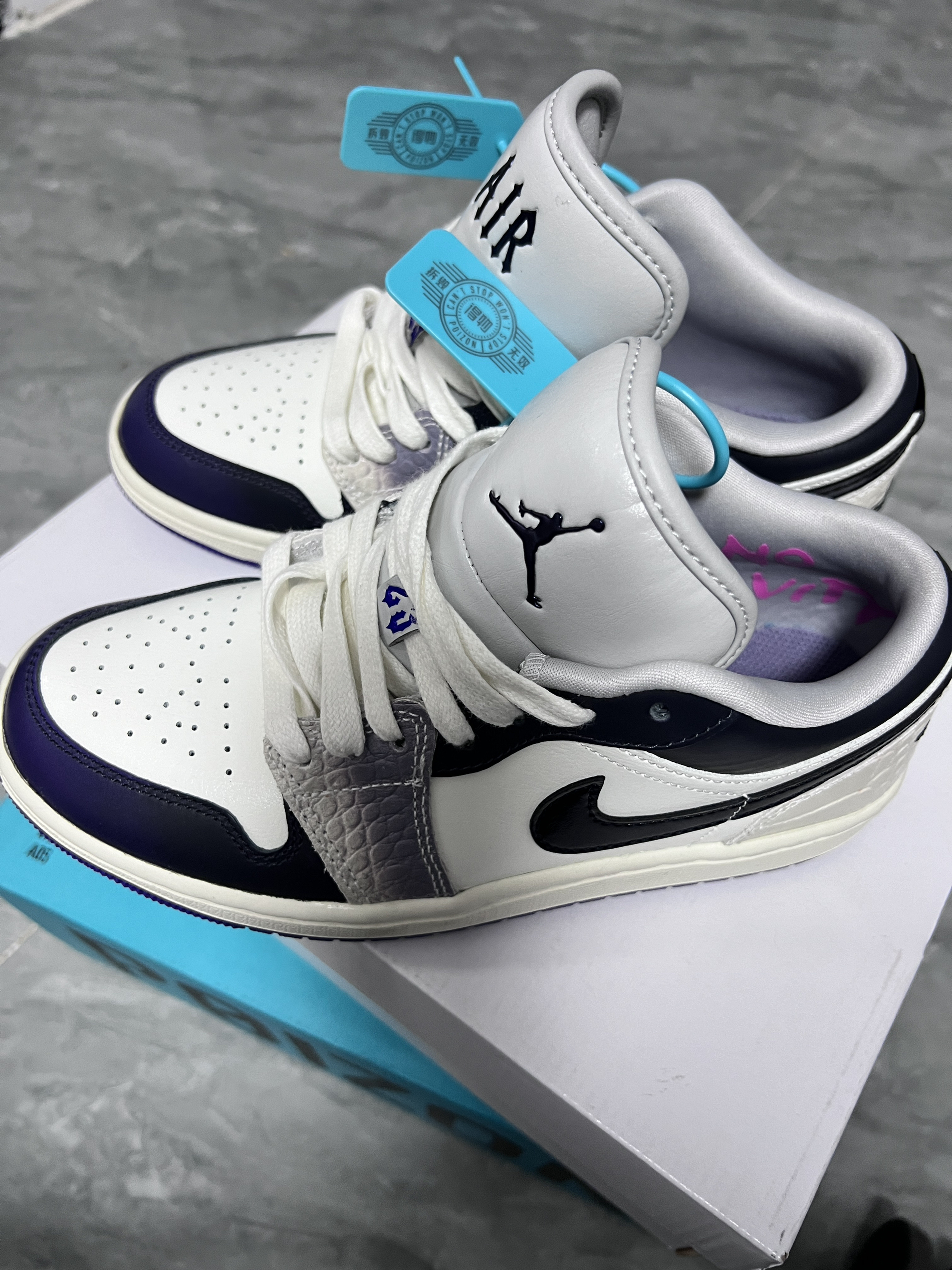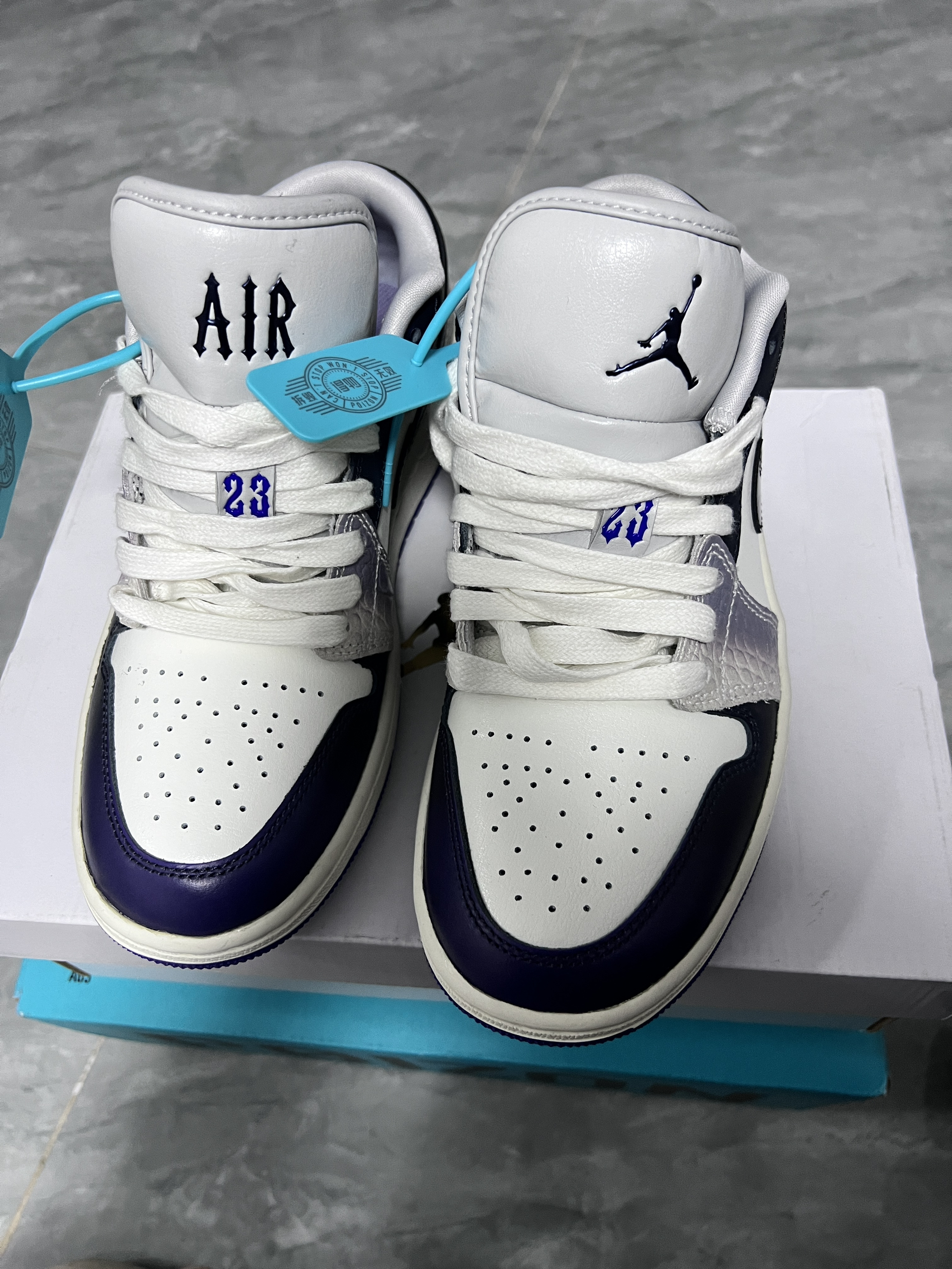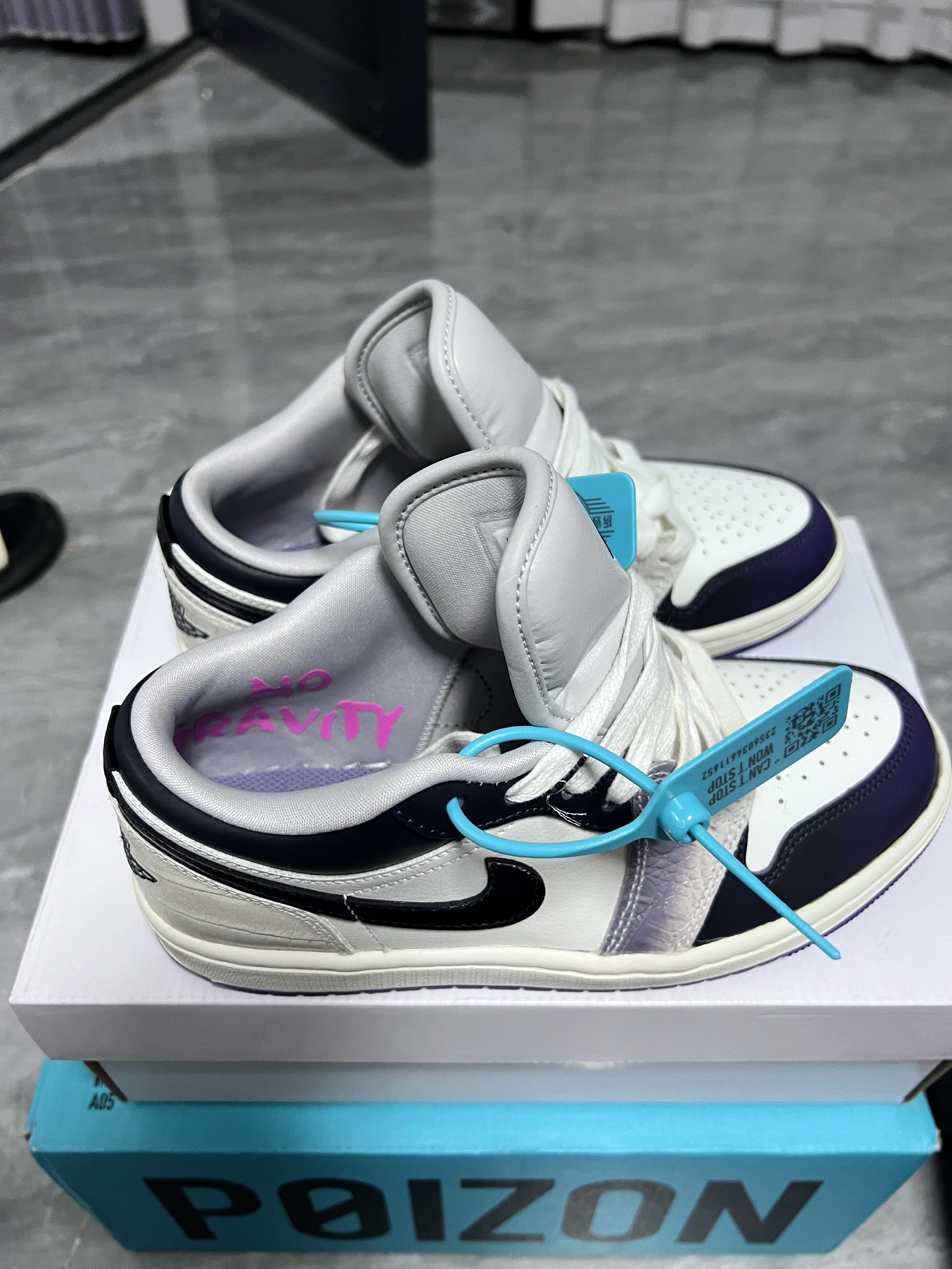 这双Air Jordan 1 Low,配色是白、紫、黑,鞋舌有飞人标志,鞋内“NO GRAVITY”字样挺有意思。皮革拼接鞋面,质感在线,低帮设计日常穿方便,搭配休闲裤、牛仔裤都很和谐,适合喜欢简约又带点个性的朋友,舒适度和颜值平衡得不错,是那种低调又有细节的款式 。