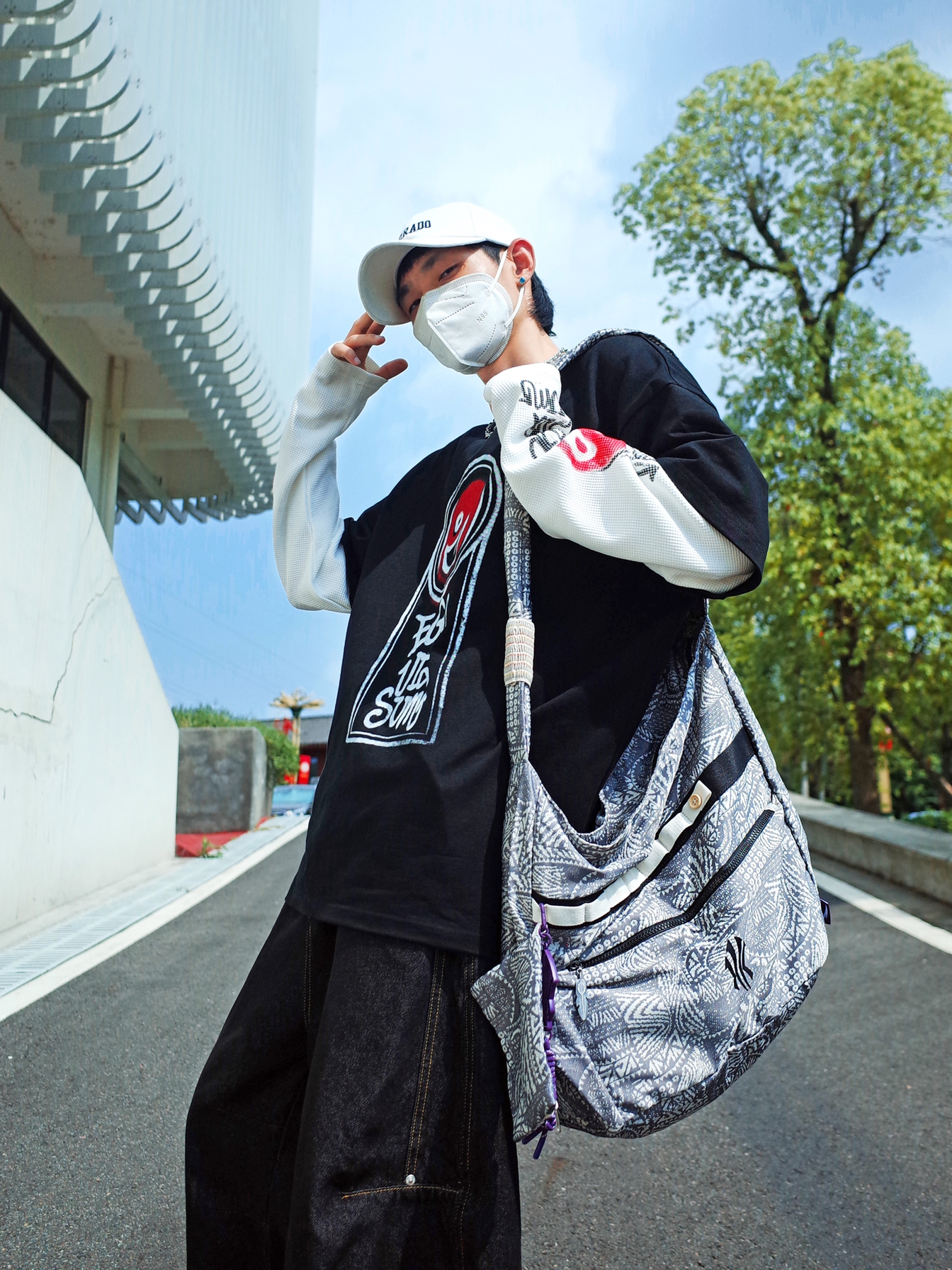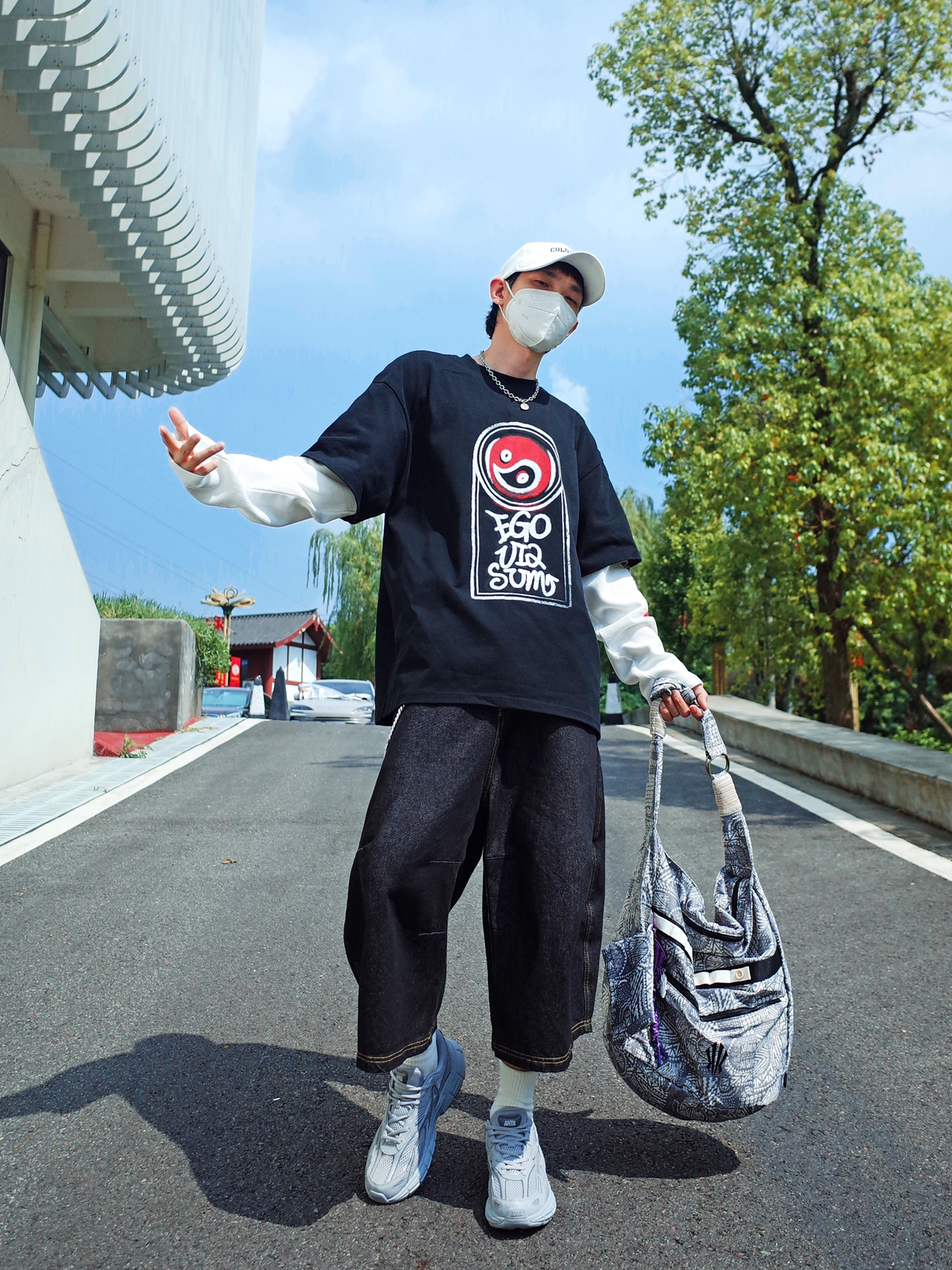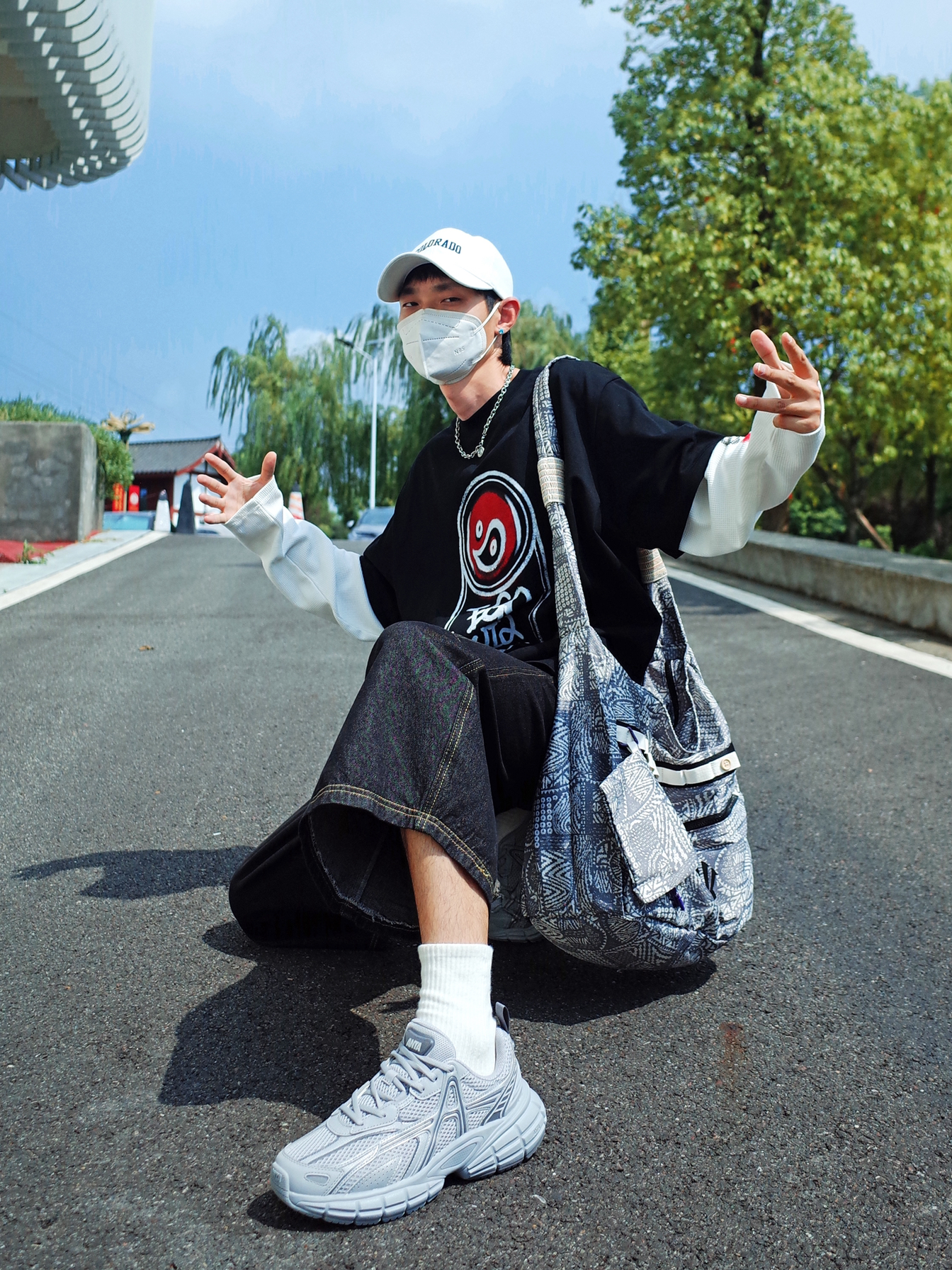 开学季穿什么⁉️ 包在我身上⚡️ 🏁黑白假两件T恤➕黑色牛仔裤, 自带层次感的同时, 宽松的版型也显得松弛有度✨ 挎上深灰的斜挎包, 印花满印,个性满满! 容量也算能装👀 书本笔记或者装点衣服零食都可以容纳! 和脚上的灰色休闲鞋来个呼应, 轻松get校园少年感🔆