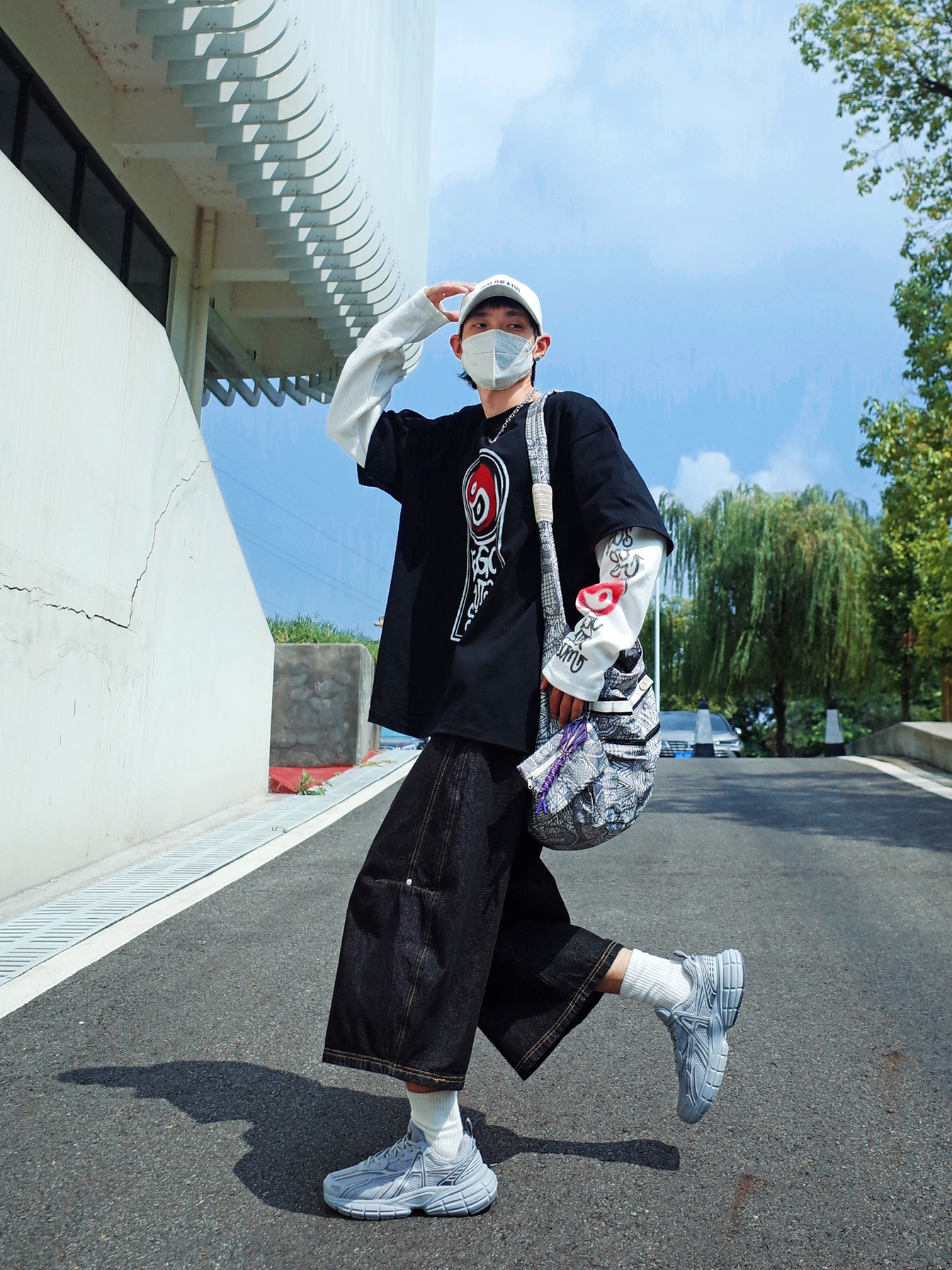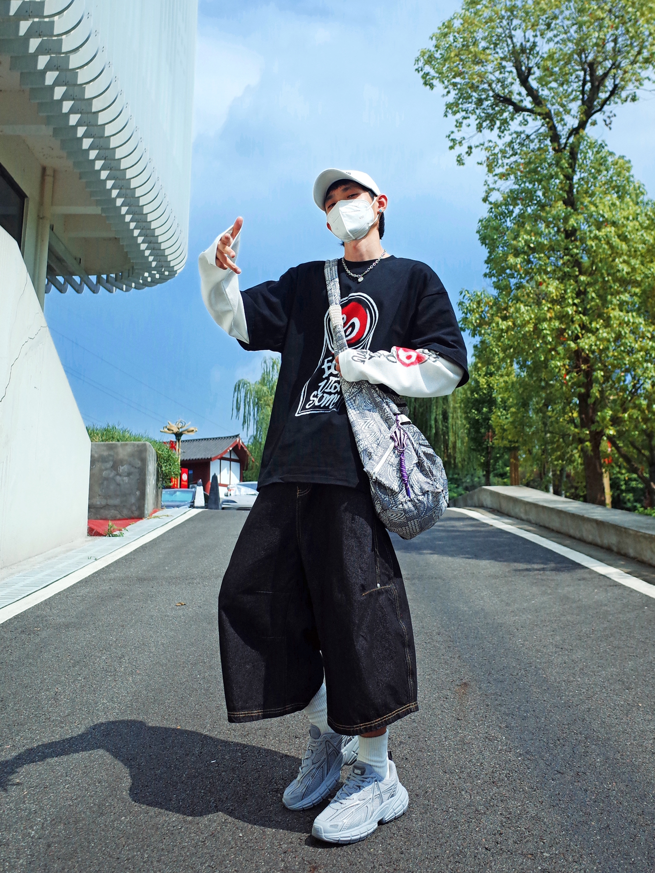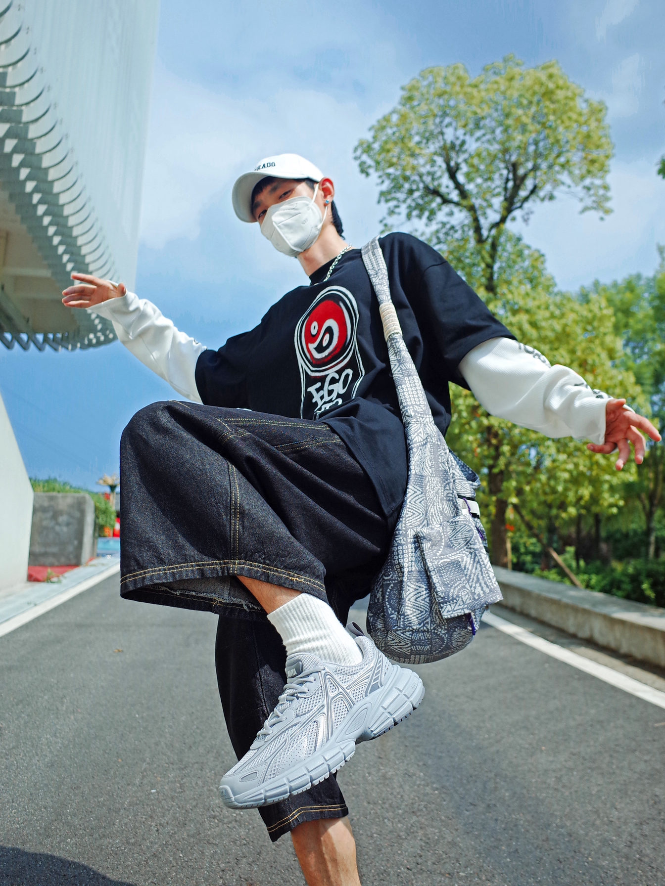 开学季穿什么⁉️ 包在我身上⚡️ 🏁黑白假两件T恤➕黑色牛仔裤, 自带层次感的同时, 宽松的版型也显得松弛有度✨ 挎上深灰的斜挎包, 印花满印,个性满满! 容量也算能装👀 书本笔记或者装点衣服零食都可以容纳! 和脚上的灰色休闲鞋来个呼应, 轻松get校园少年感🔆