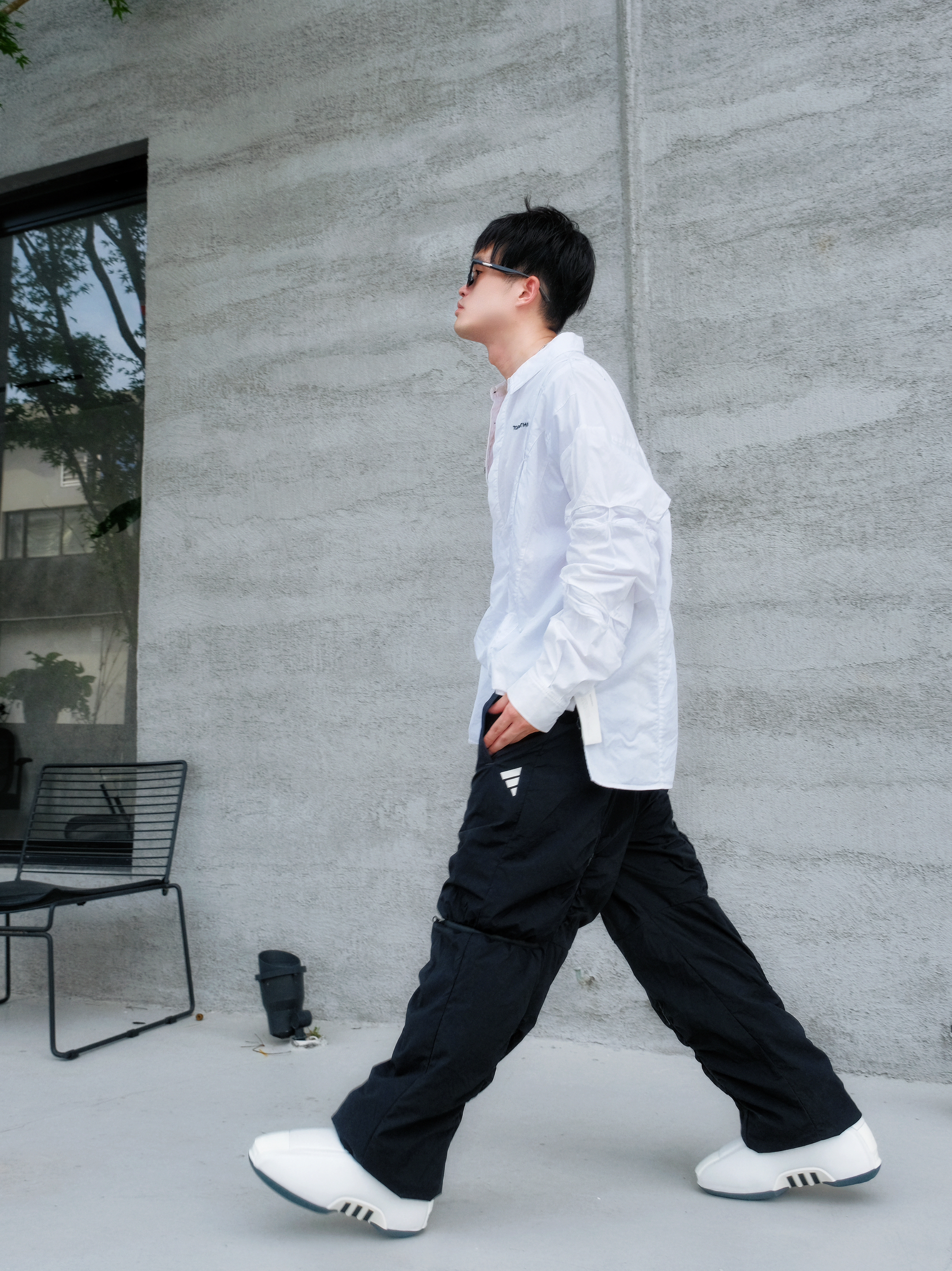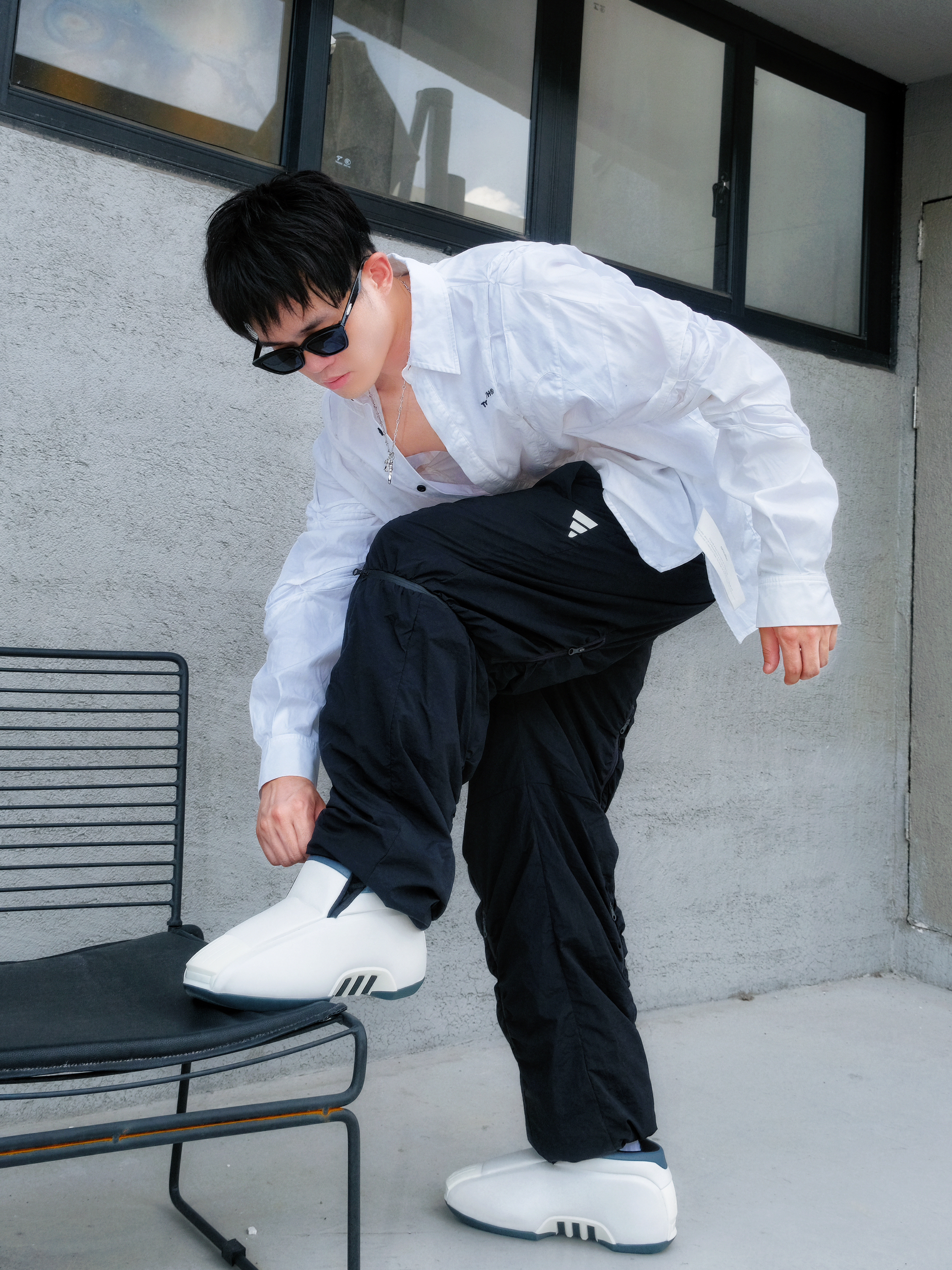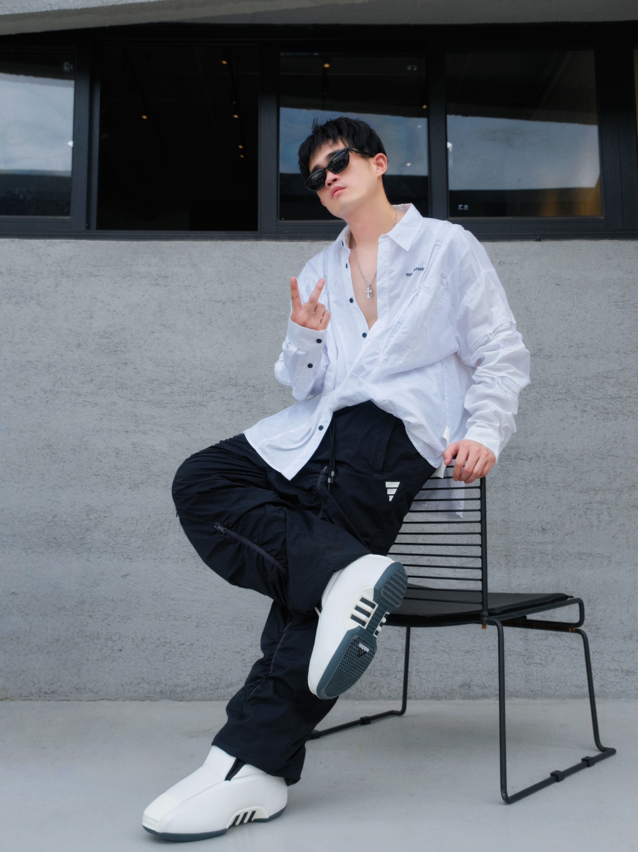 初秋出街最爱这身!在灰色墙角找把户外椅小坐,风吹过,超级放松的氛围。☀️ 穿搭是简约休闲风:白衬衫宽松舒适,配上黑色阔腿裤👖,遮阳又显瘦。 ⚠️重点来了—— Crazy 2 Zero Metallic复古篮球鞋!防滑耐磨的底子稳稳的,日常通勤太实用。致敬科比的TT跑车设计,穿出满满的回忆,让整体造型更有情怀感。👟 整体Look:黑白配 + 酷黑墨镜😎,项链小小点缀,随性又显气质。简单get潮流范儿...