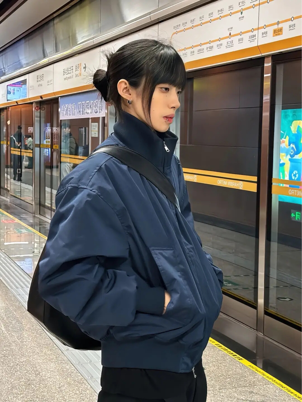 查尔斯桃心的这款夹克,采用立领廓形+短款剪裁的设计,藏青色加持更显清冷高级感,梨形身材也能轻松的驾驭