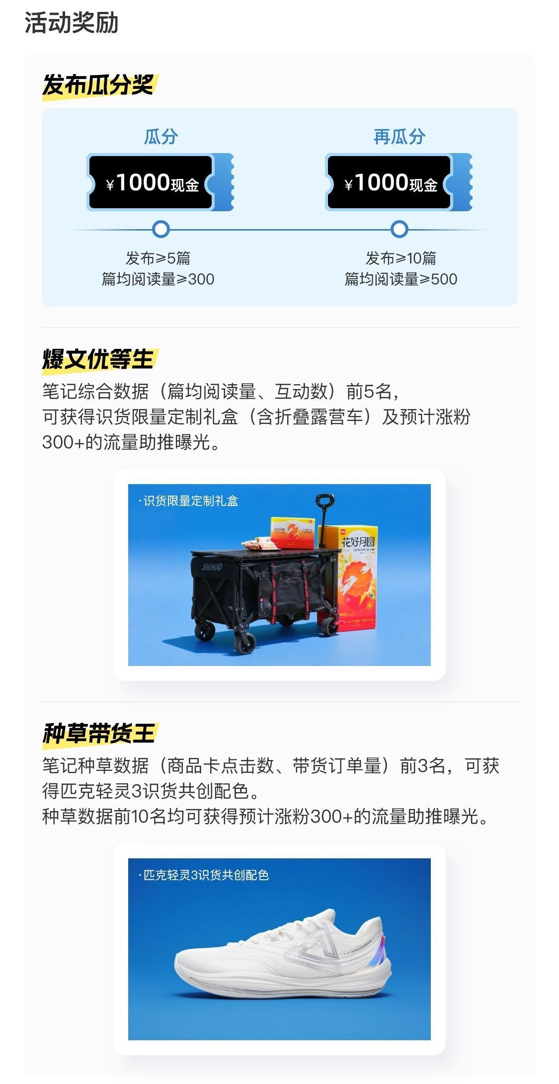 发布≥5篇符合活动规则的笔记,且篇均阅读量≥300,参与瓜分奖金池1000元。