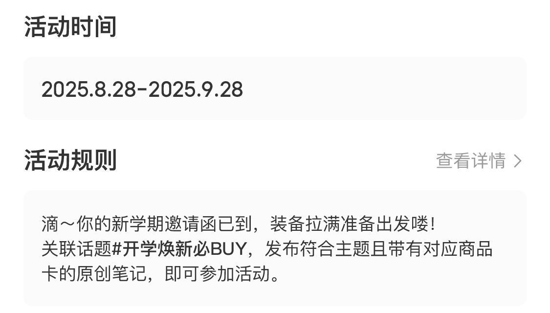 关联话题#开学焕新必BUY#,发布符合主题且带有对应商品卡的原创笔记,即可参加活动。