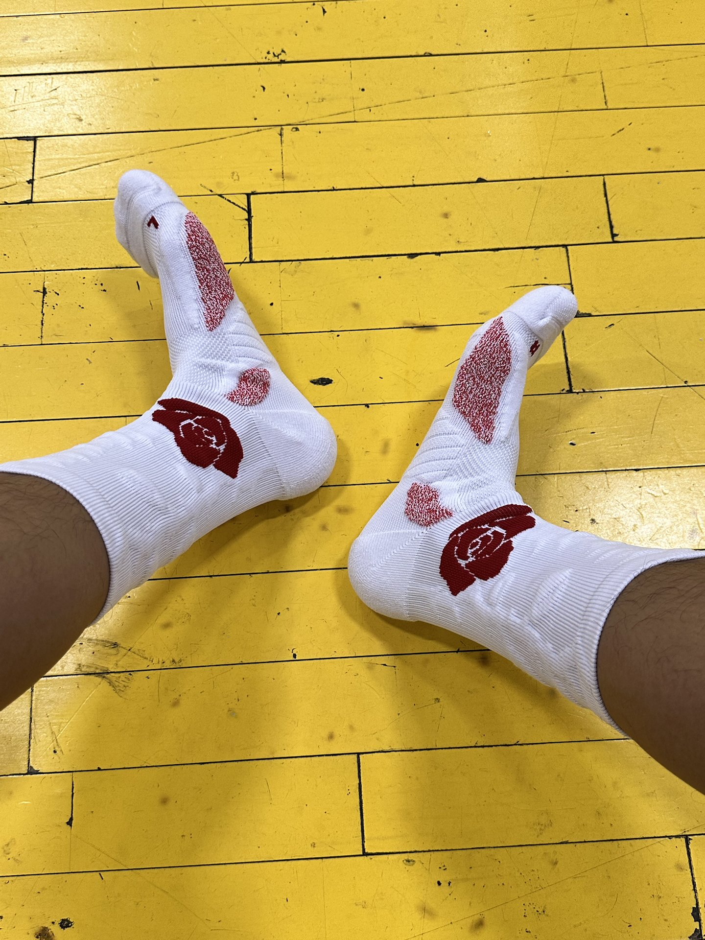 今日实战上脚来自 #维动 VEIDOORN 品牌家这款星街战系列玫瑰球袜,整个袜子的外观玫瑰元素点缀非常的漂亮,很有个性,整体的面料非常的柔软厚实,加上高帮的设计包裹感十足,脚踝处都是做的加厚设计,实战性能优秀! #分享超好穿的球袜 #维动篮球袜 #超帅篮球袜分享 #新一代篮球袜又帅又能打 #维动VEIDOORN