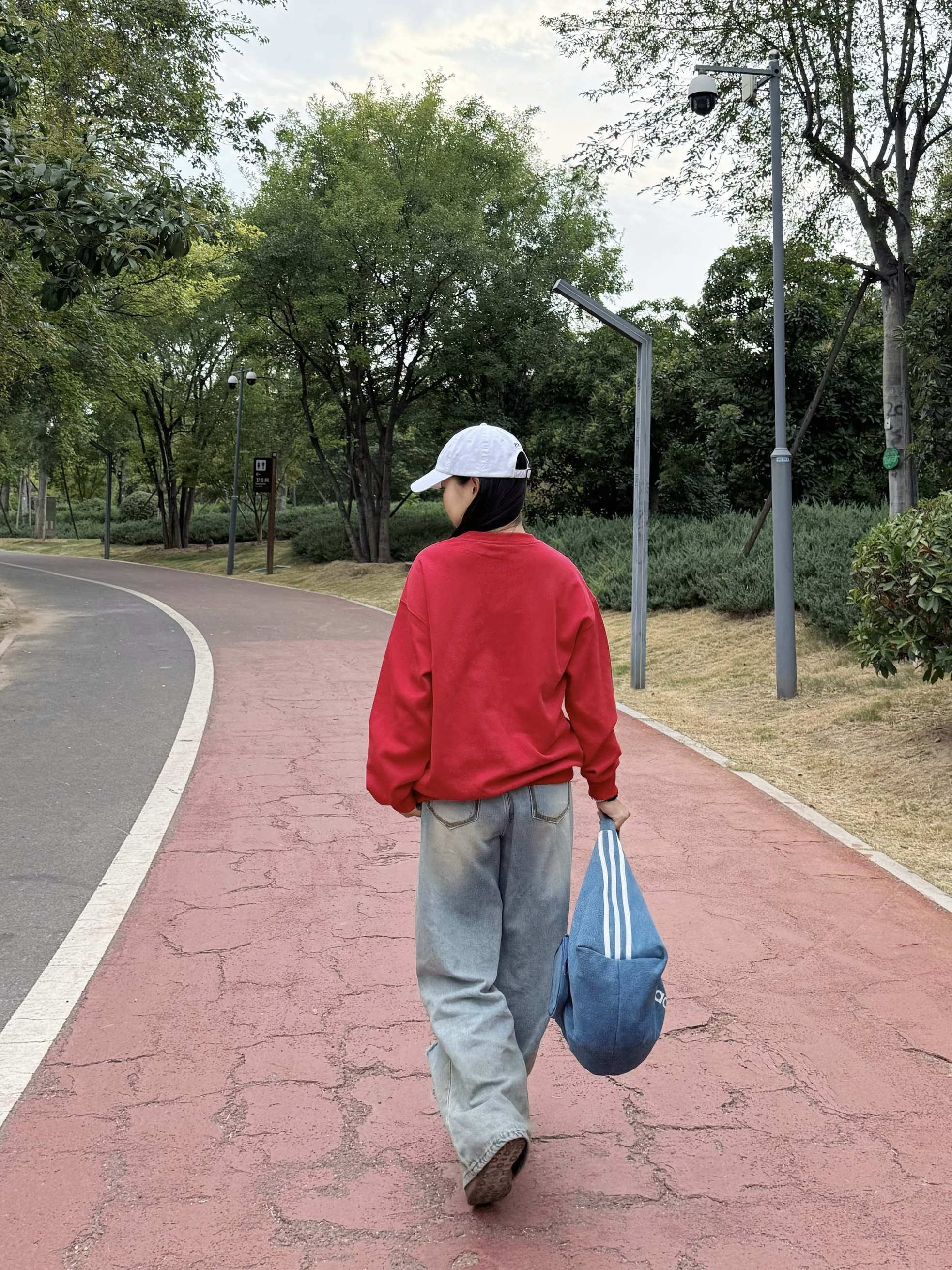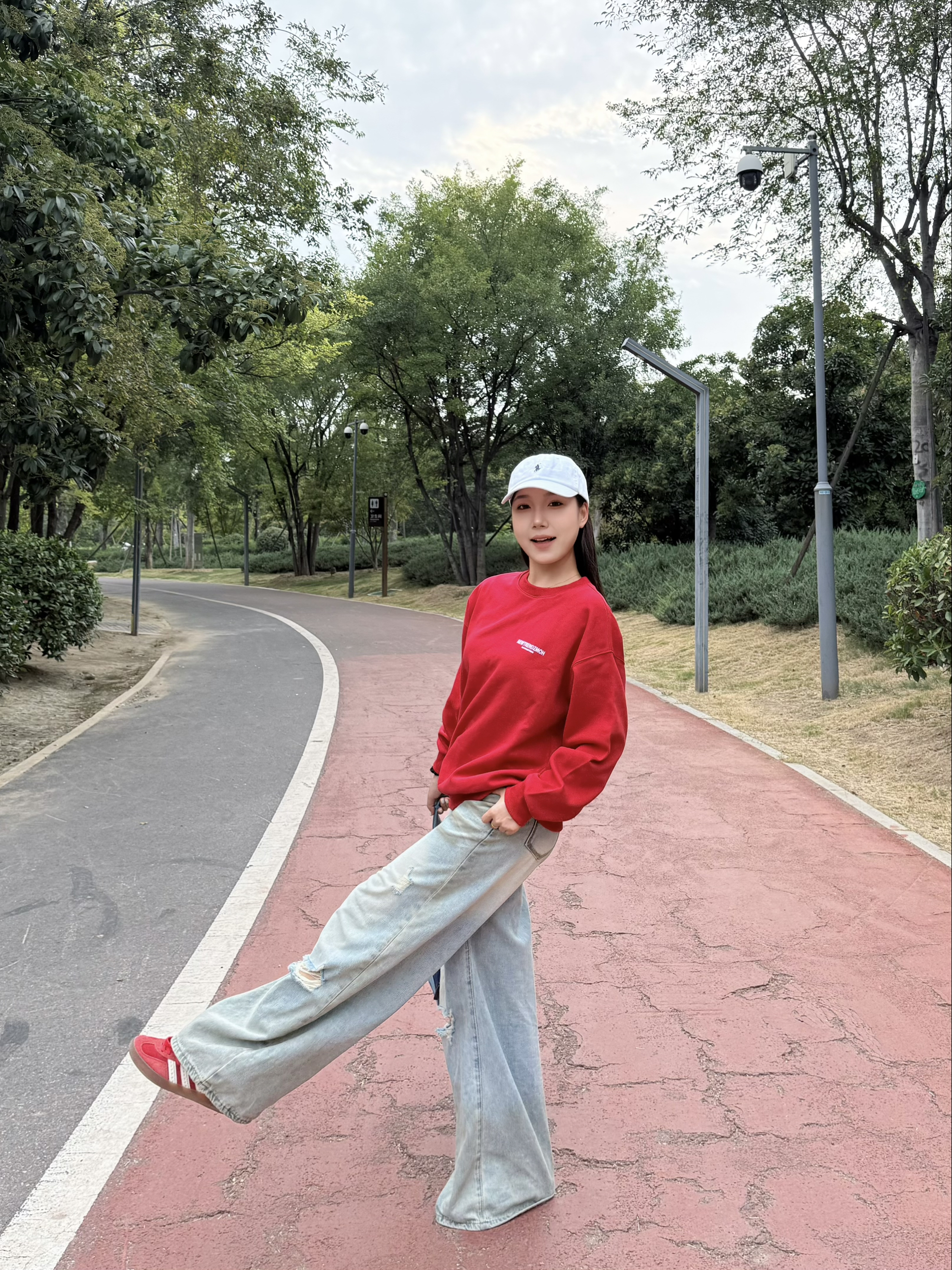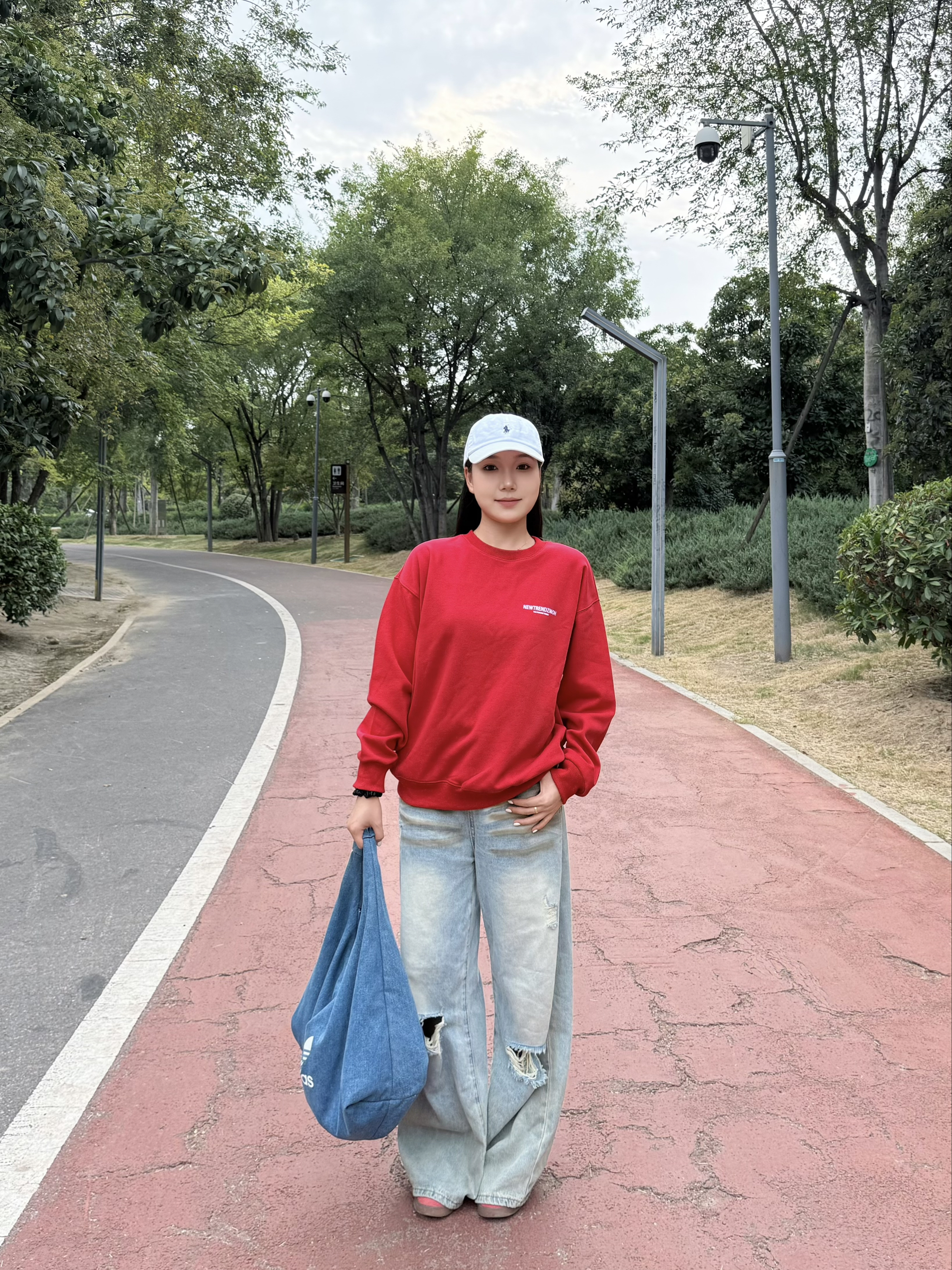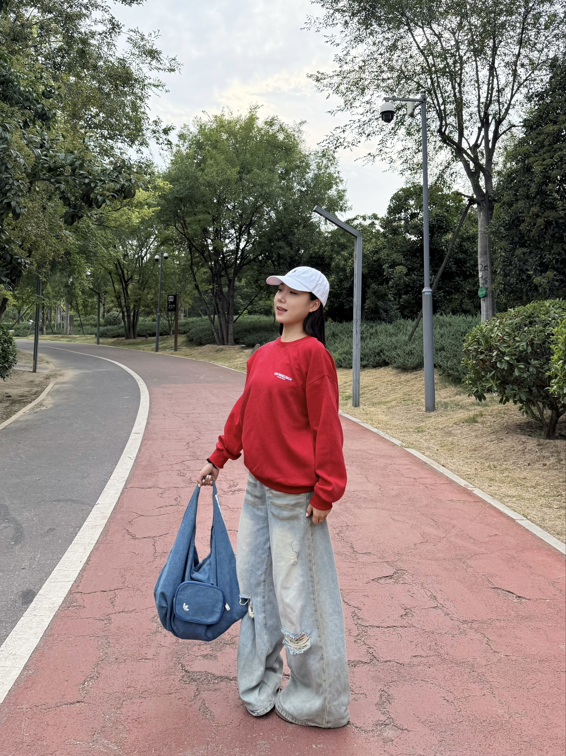 这套街头风穿搭太绝啦!正红色卫衣超显白胸前的小字母点缀增添细节感❗️ 宽松版型自带慵懒氛围 搭配破洞阔腿牛仔裤 复古又潮流~ 蓝色大容量包包提升整体时尚度👍 再踩上一双个性鞋子 街头感直接拉满👌
