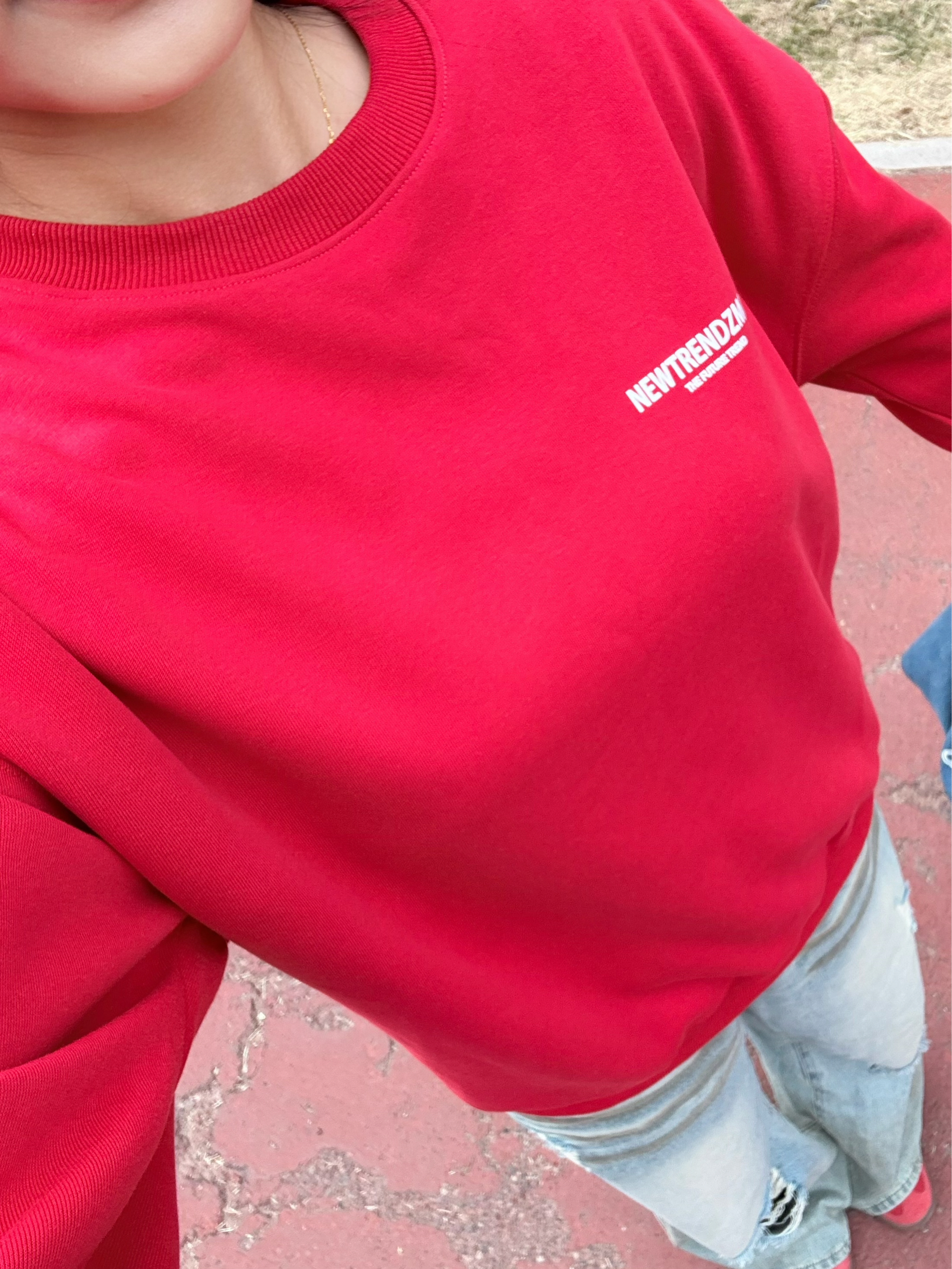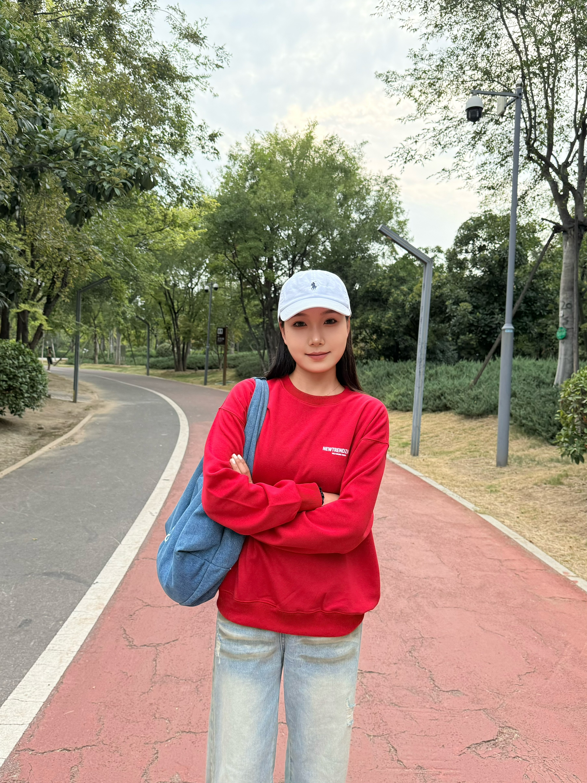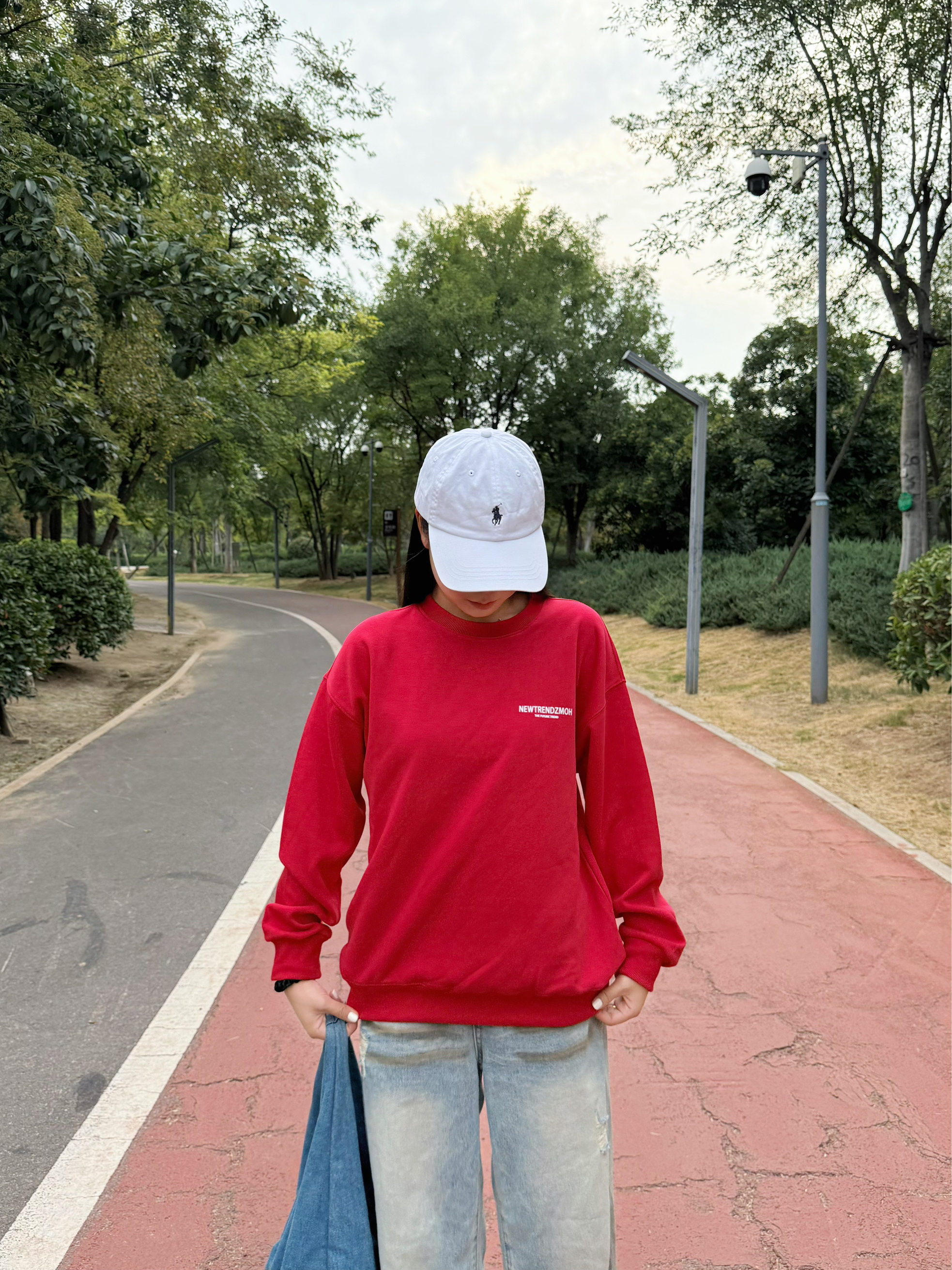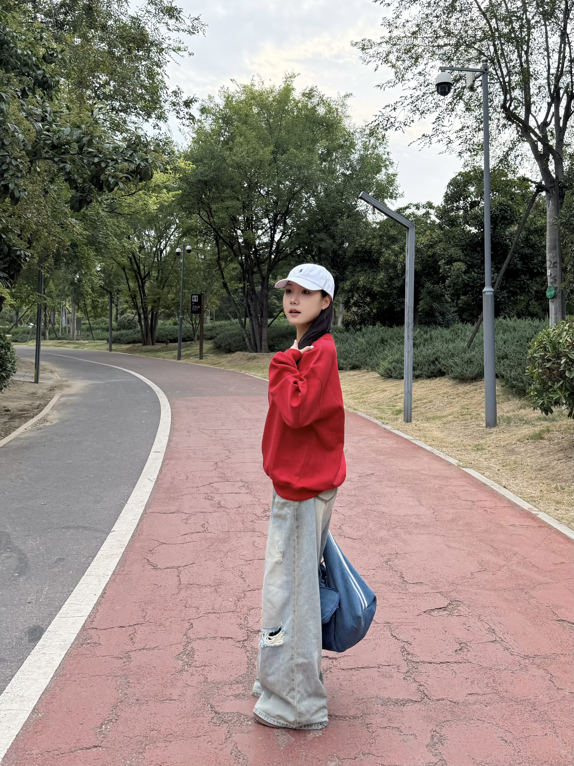 这套街头风穿搭太绝啦!正红色卫衣超显白胸前的小字母点缀增添细节感❗️ 宽松版型自带慵懒氛围 搭配破洞阔腿牛仔裤 复古又潮流~ 蓝色大容量包包提升整体时尚度👍 再踩上一双个性鞋子 街头感直接拉满👌