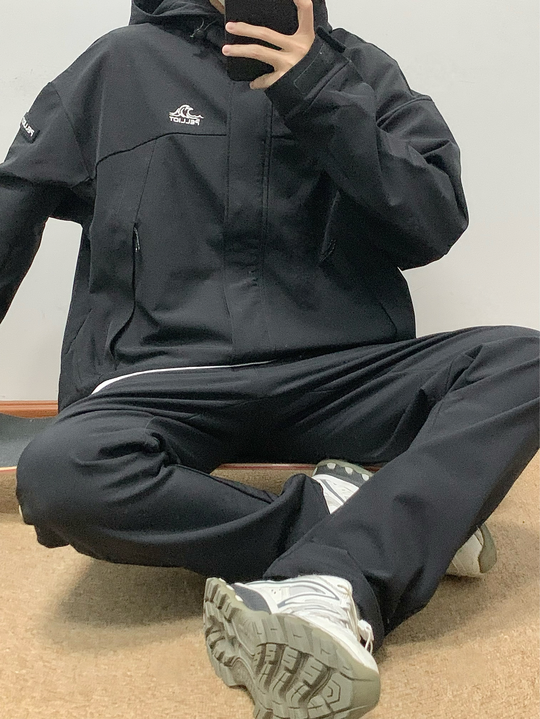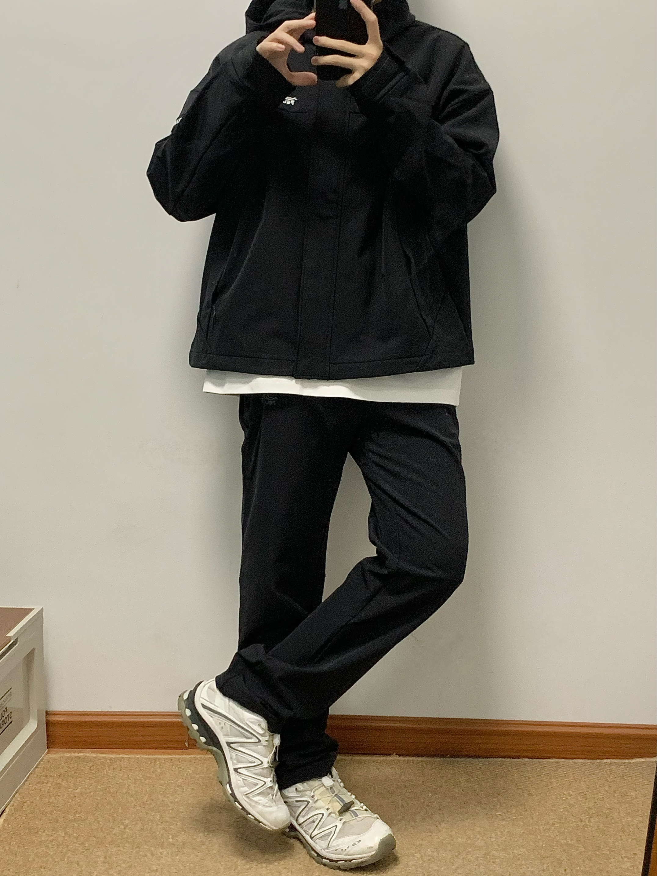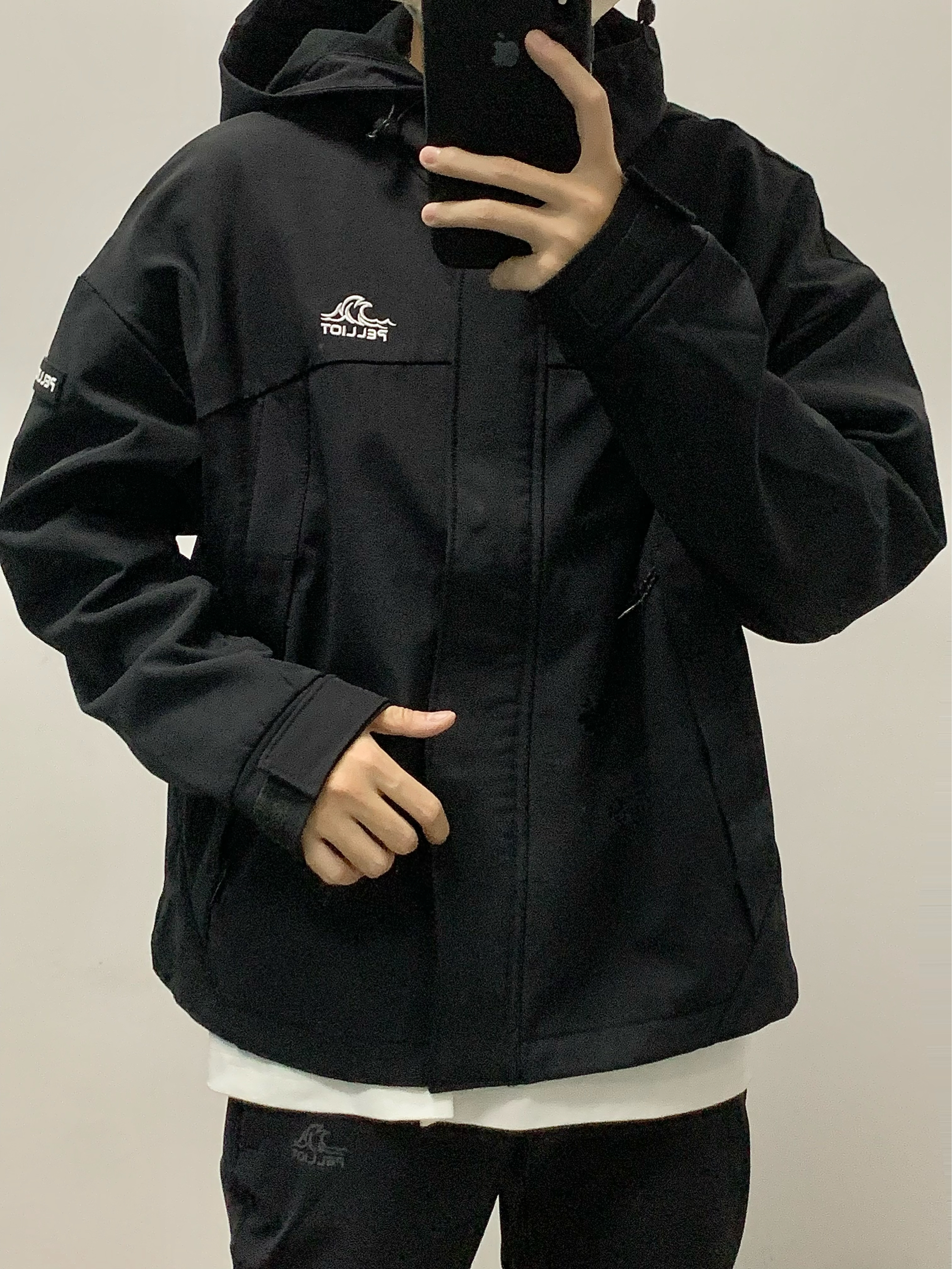 黑色夹克搭配黑色冲锋裤 帅酷拿捏 软壳的面料 上身舒适方便活动 防风防泼水材质 内里还有加绒 日常通勤或者户外穿都可 户外出游就穿这一身 包出片的! 👔:伯希和 👖:伯希和